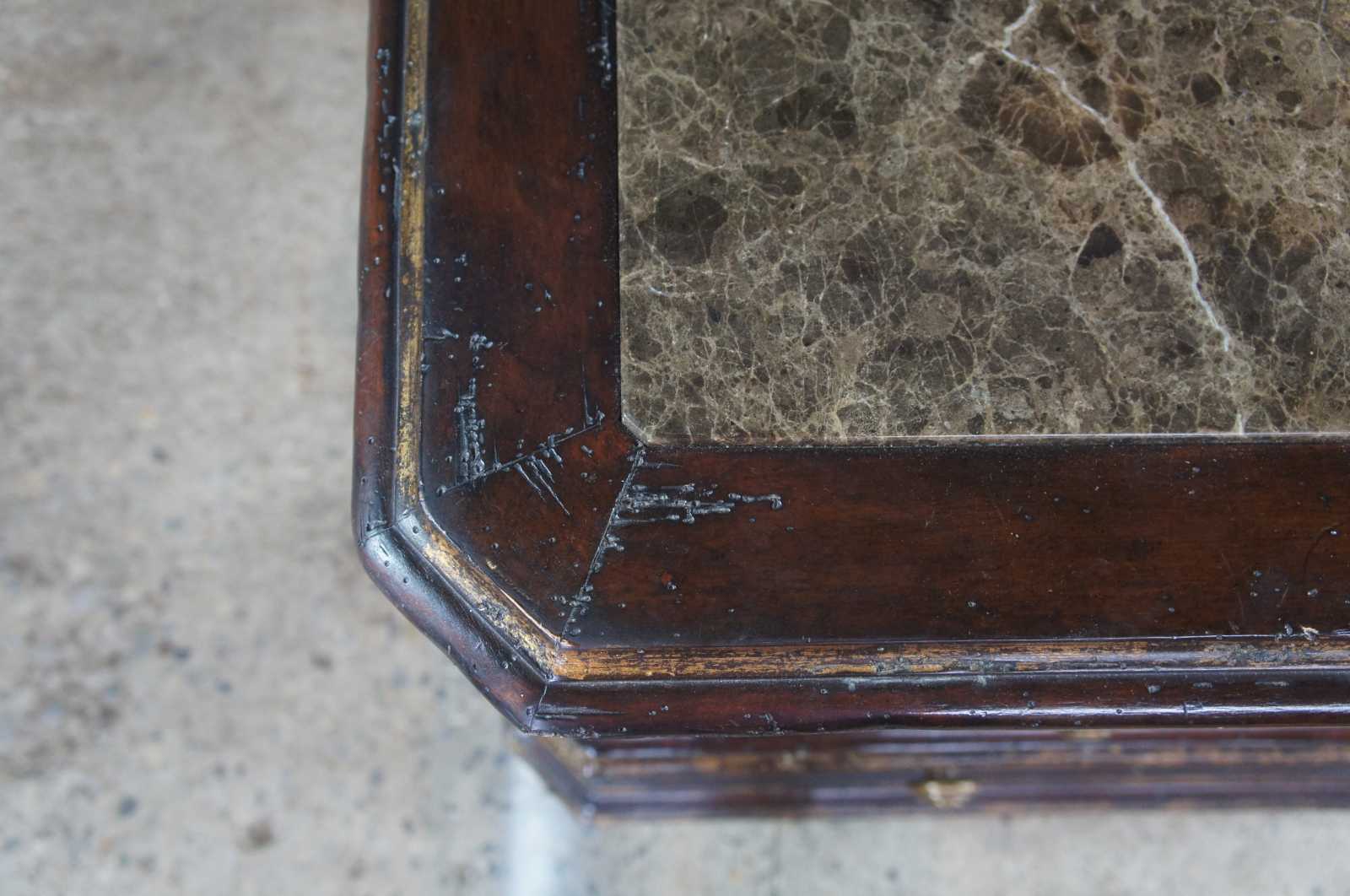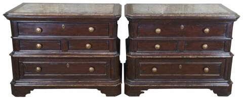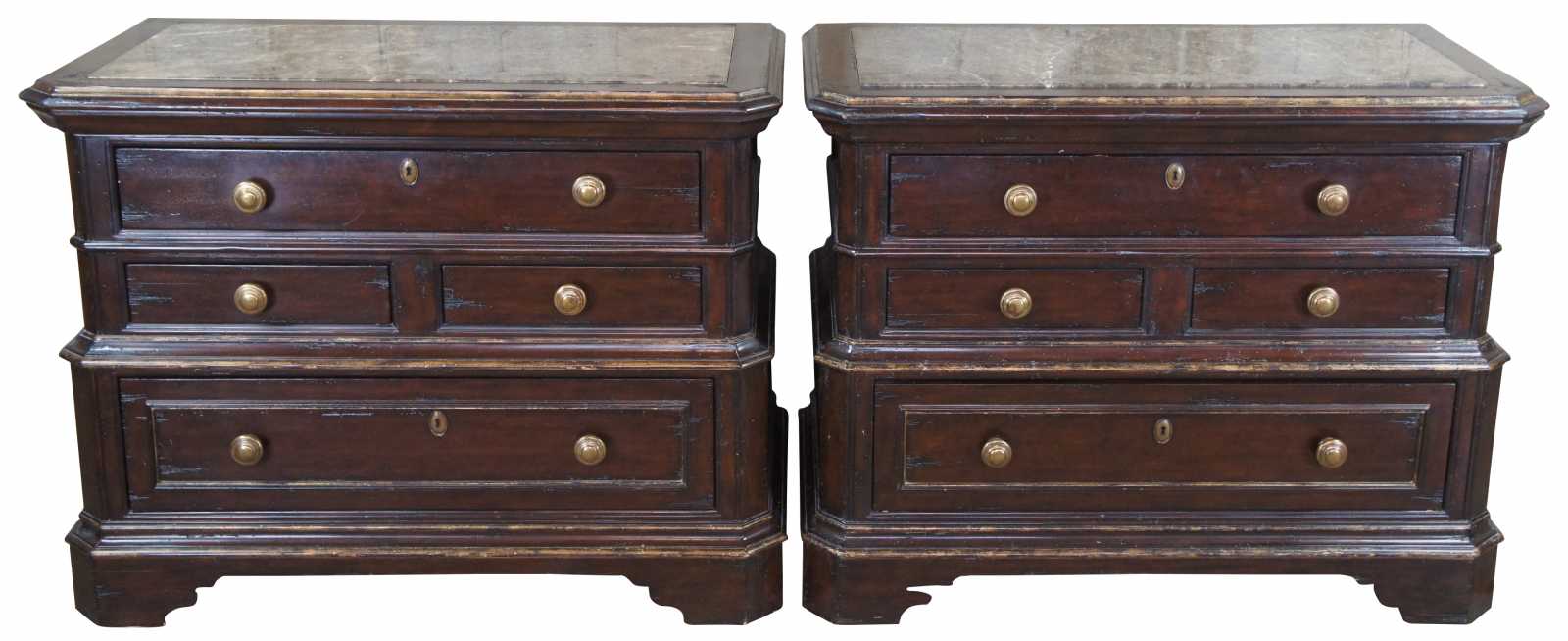 Vintage Marge Carson Bordeaux Collection nightstands. Made of wood featuring baroque / rococo styling with inset marble tops and brass hardware.