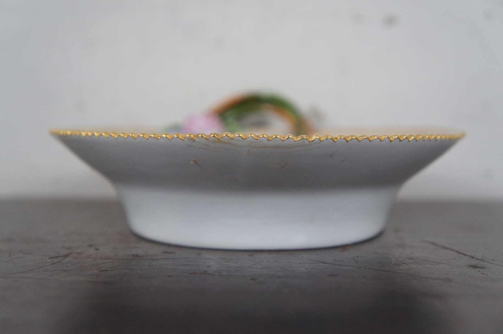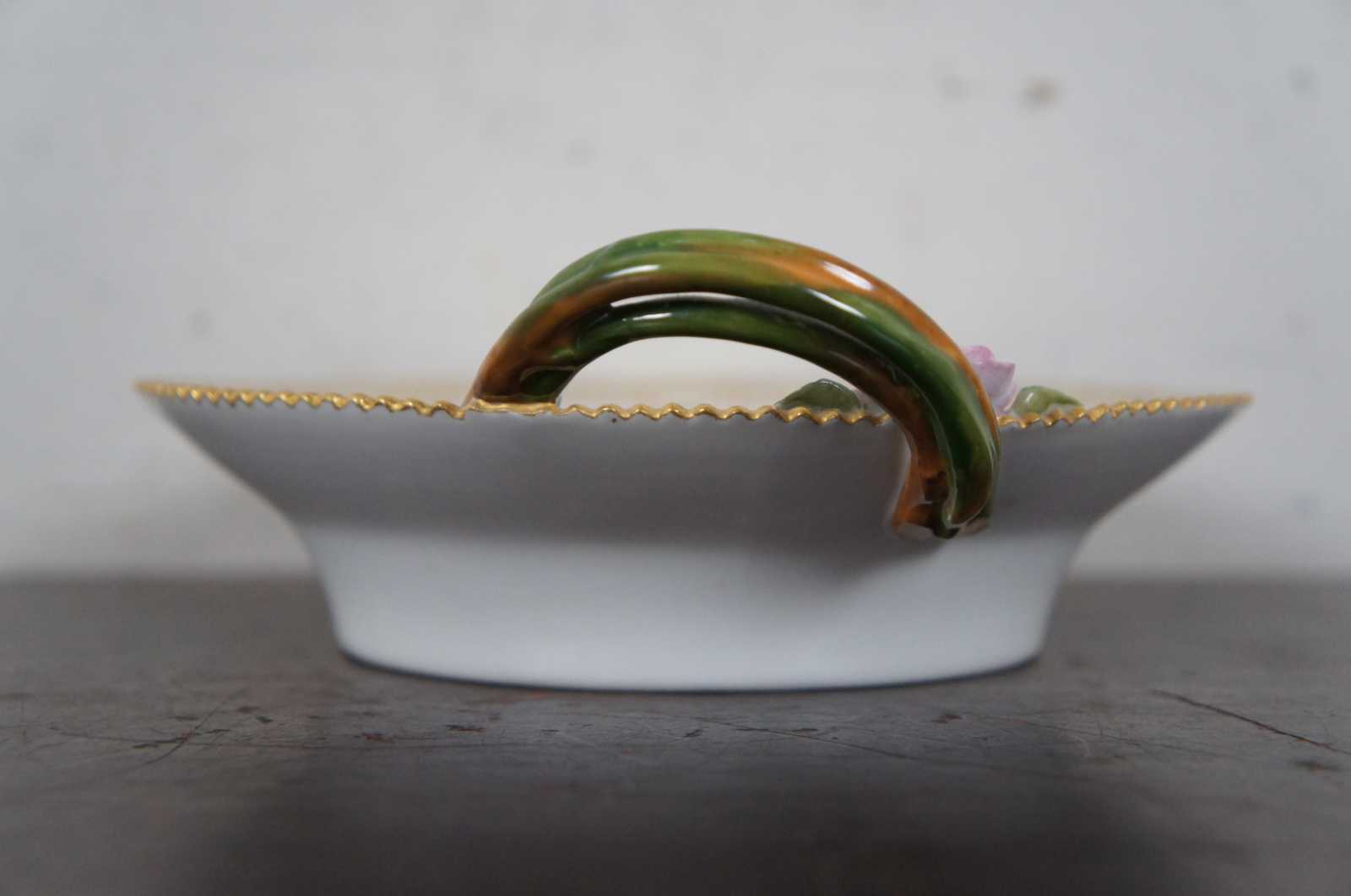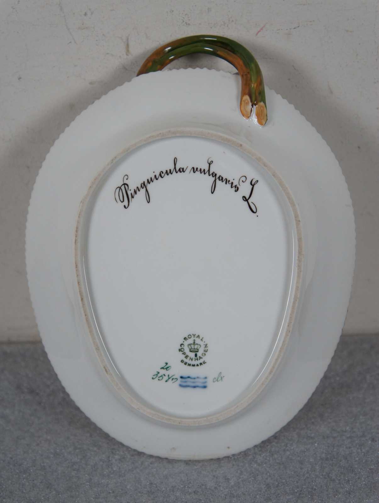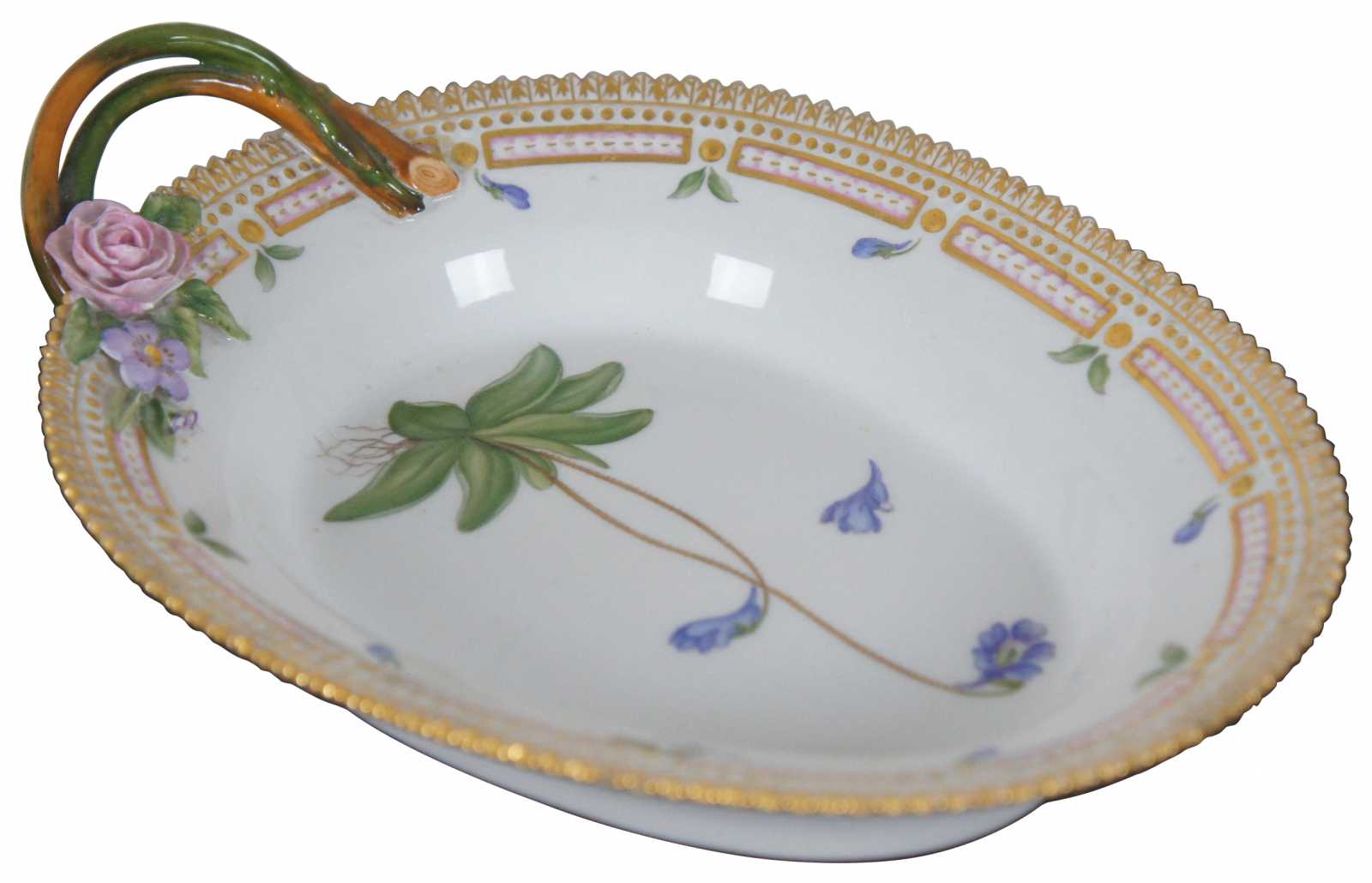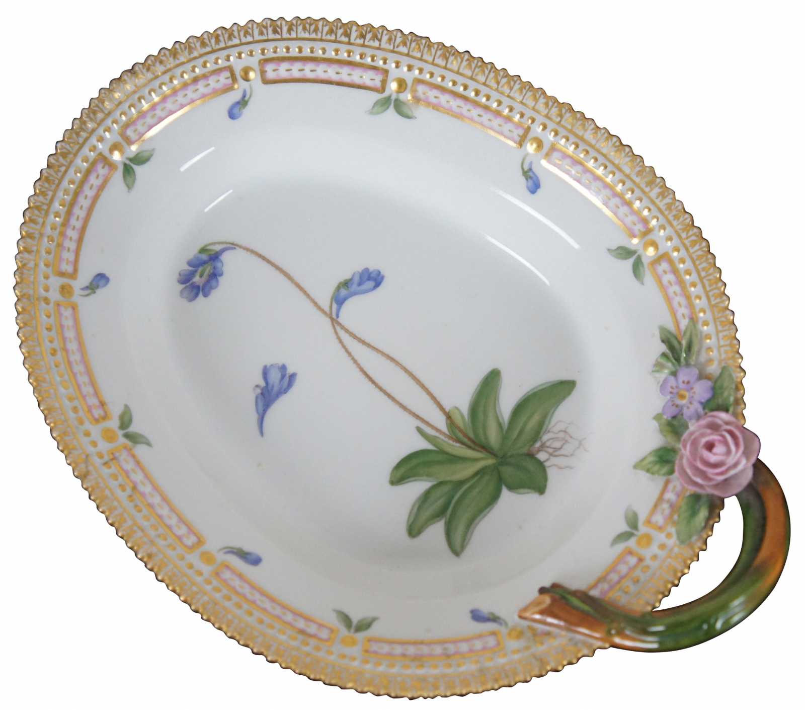 Royal Copenhagen porcelain botanical trinket dish painted with a Pinguicula Vulgaris (Common Butterwort) flower, with a tightly scalloped gilded edge and a branch shaped handle adorned with a pink rose. 20/3540