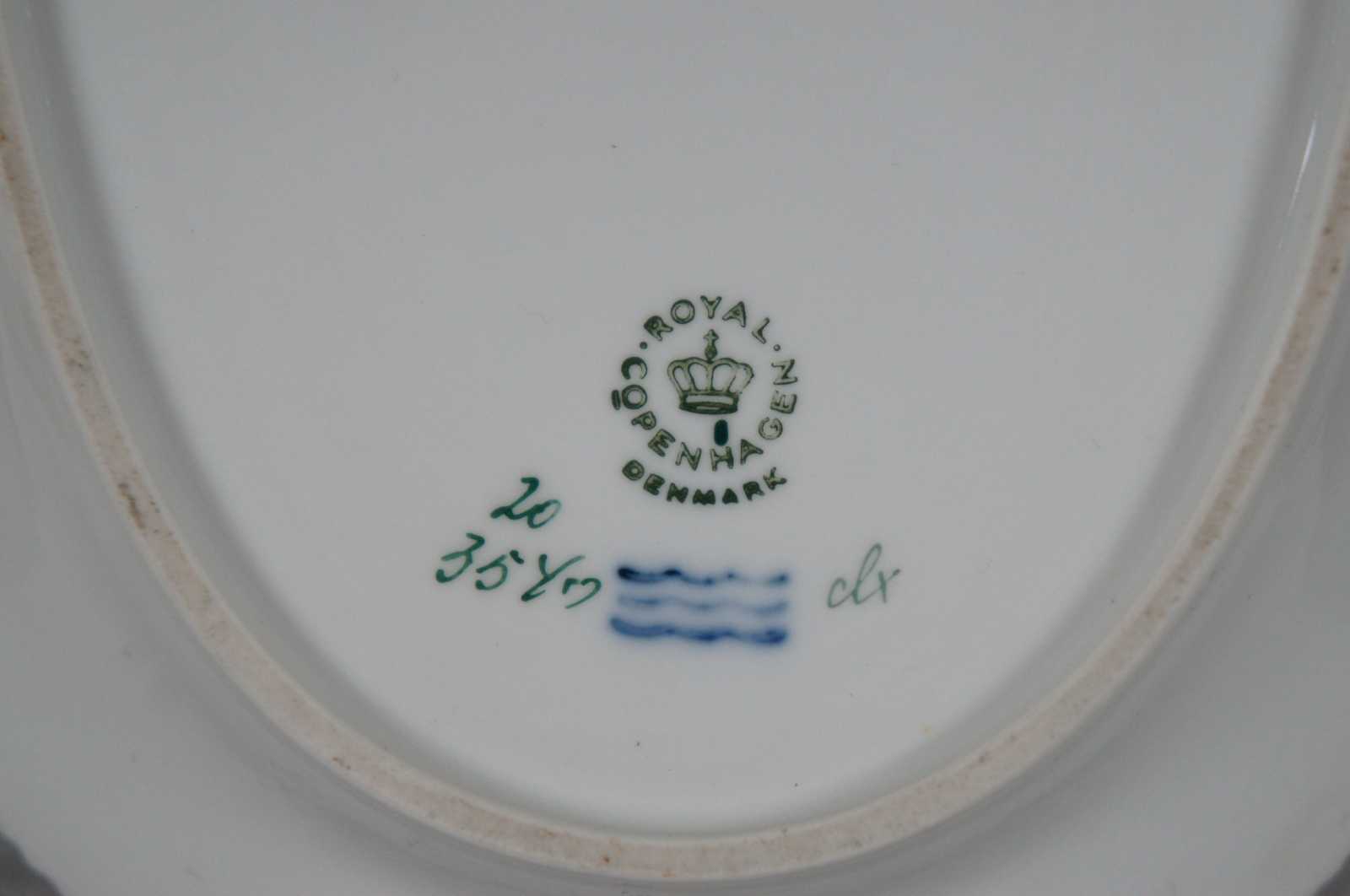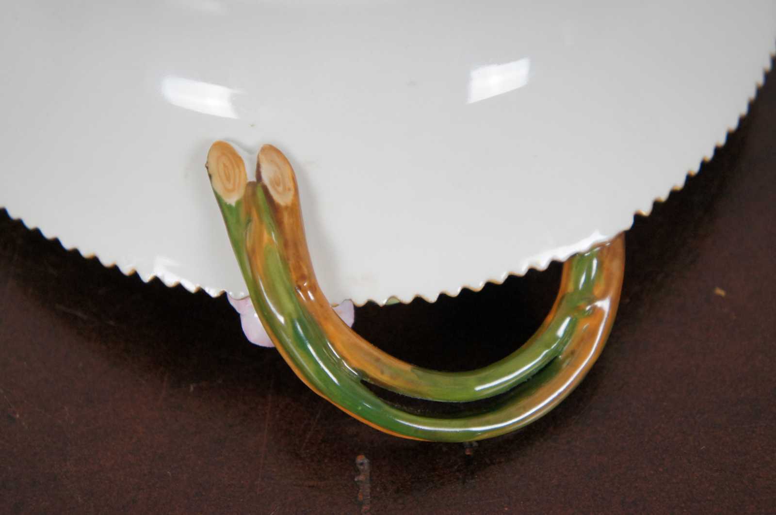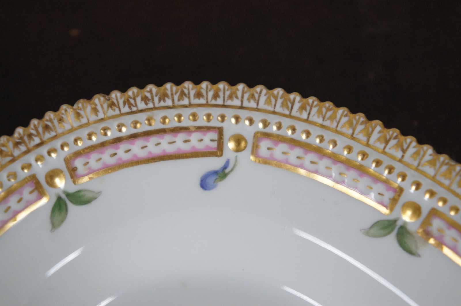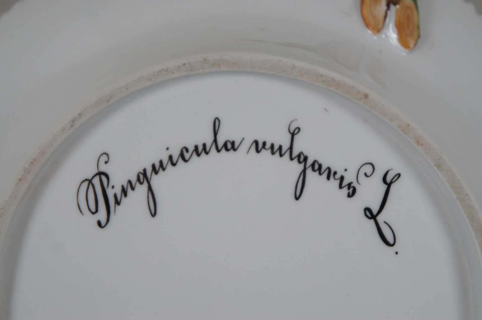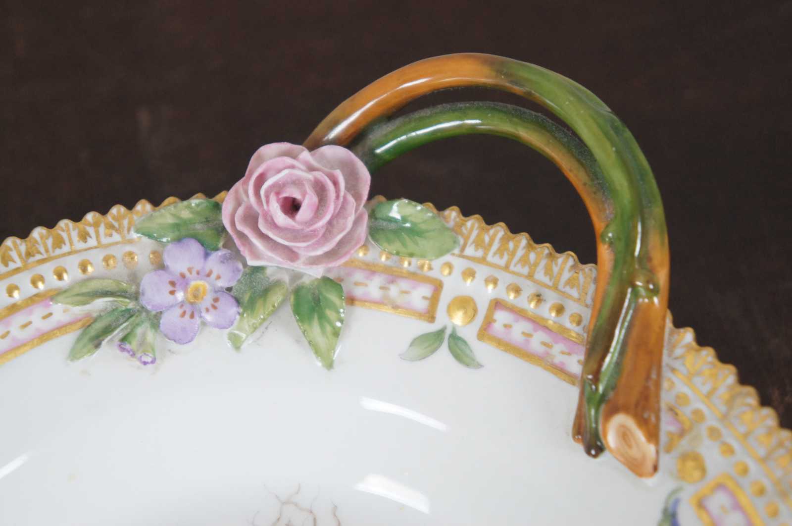 Royal Copenhagen porcelain botanical trinket dish painted with a Pinguicula Vulgaris (Common Butterwort) flower, with a tightly scalloped gilded edge and a branch shaped handle adorned with a pink rose. 20/3540