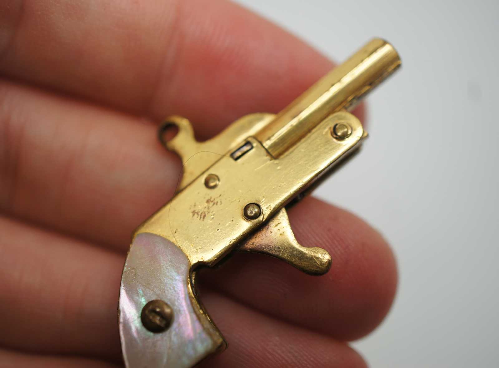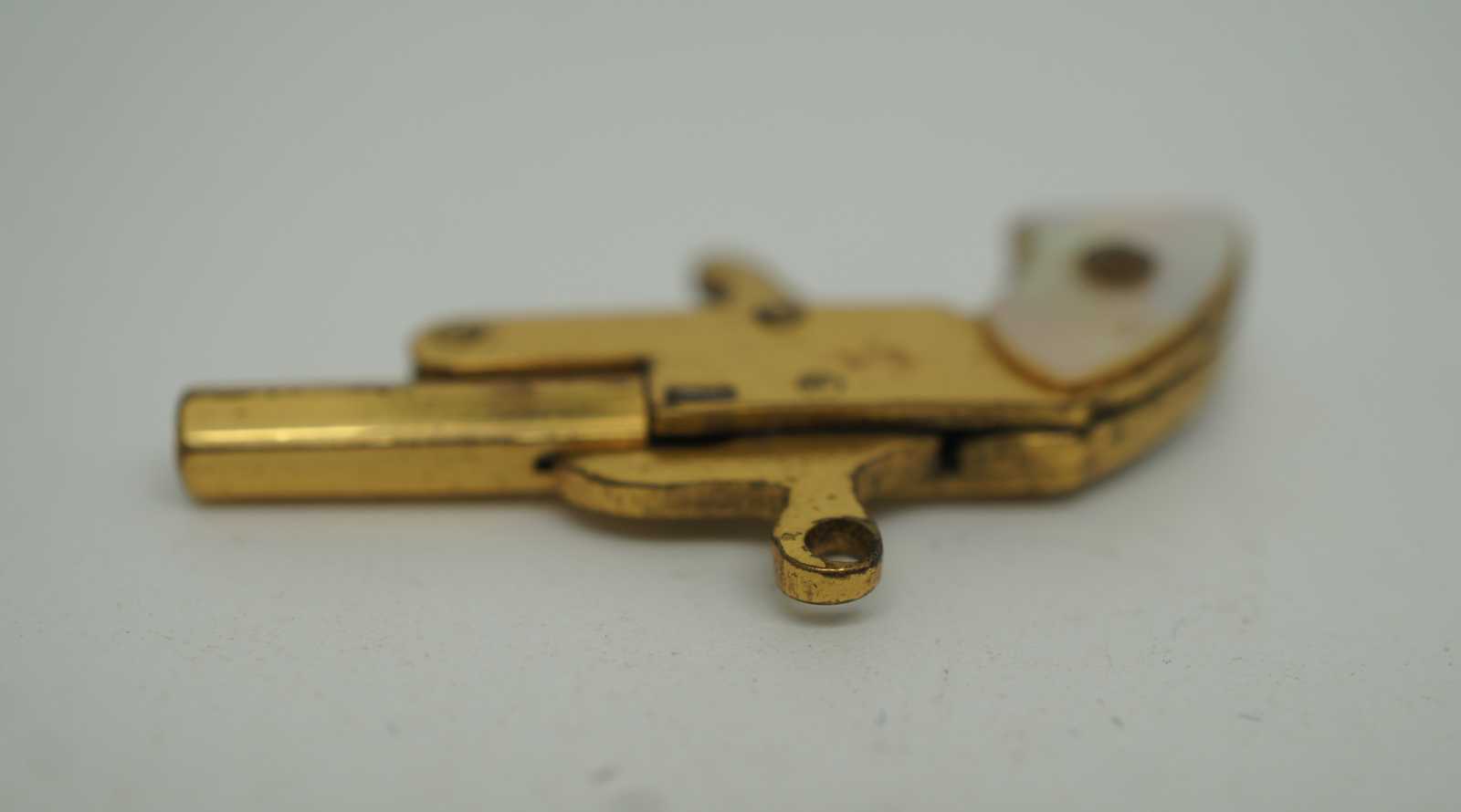 Vintage gold tone miniature pin fire cap gun with mother of pearl on the handle, made in Japan with small ring on top of the barrel for use as a key chain or watch fob.