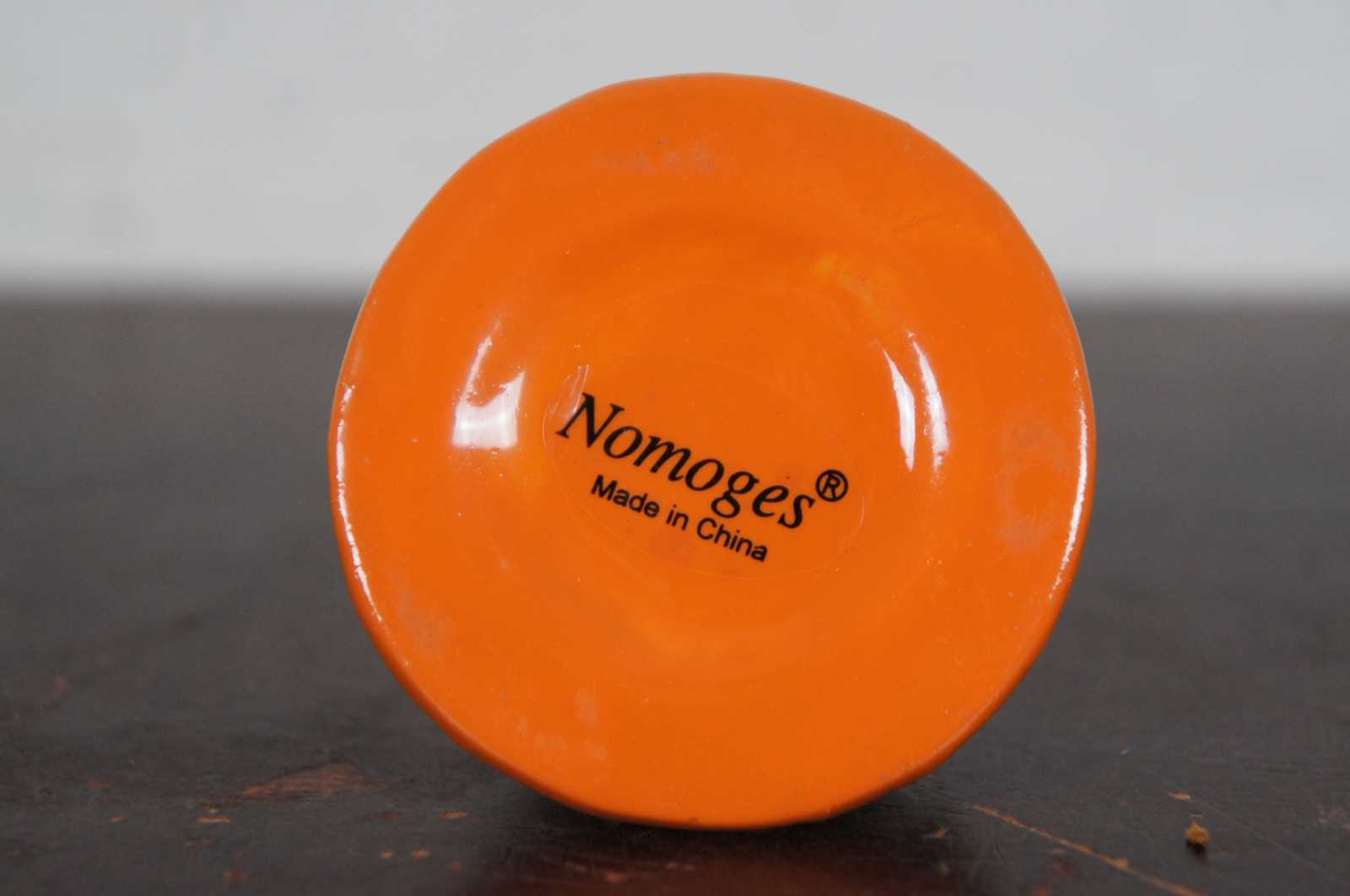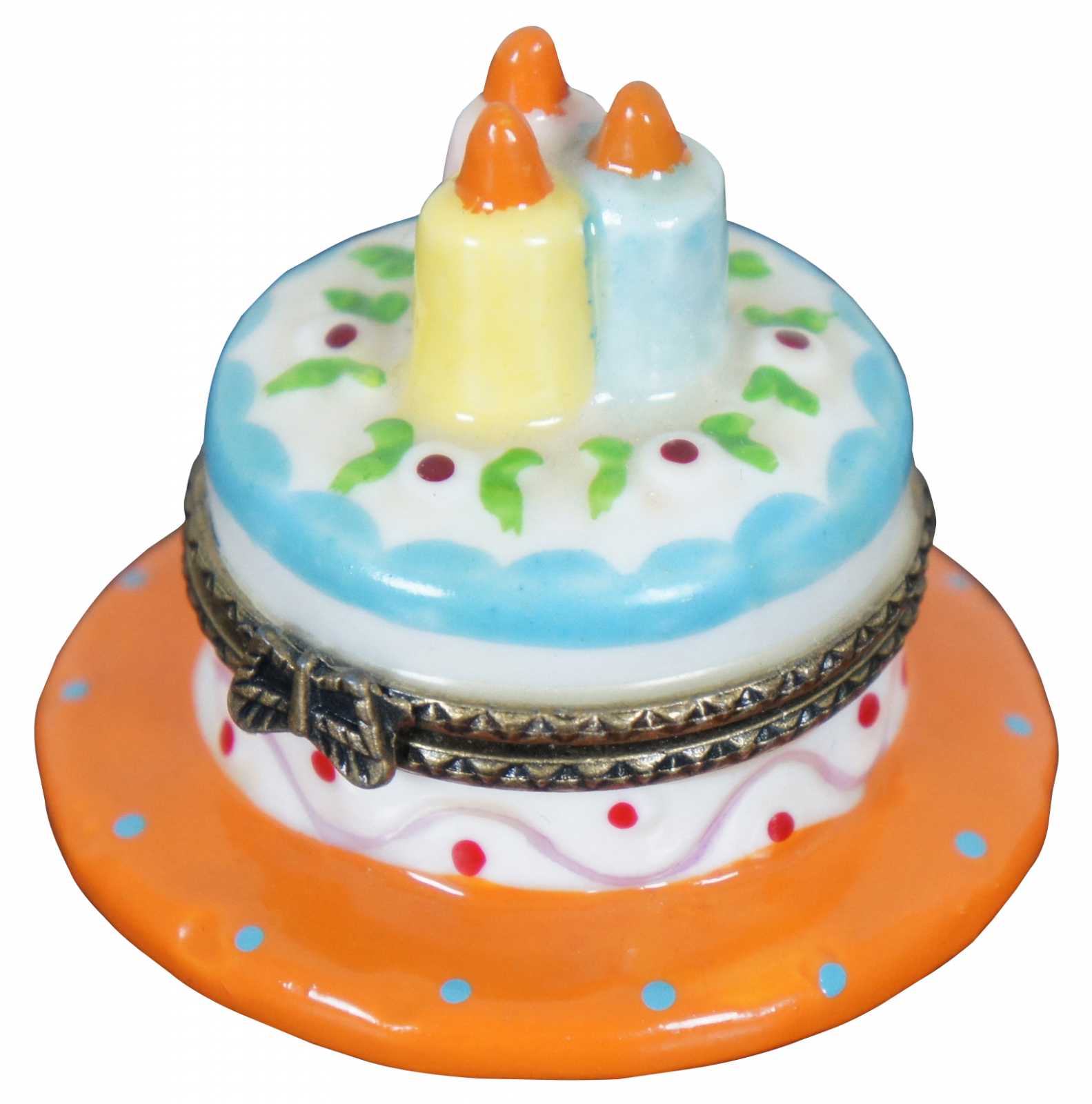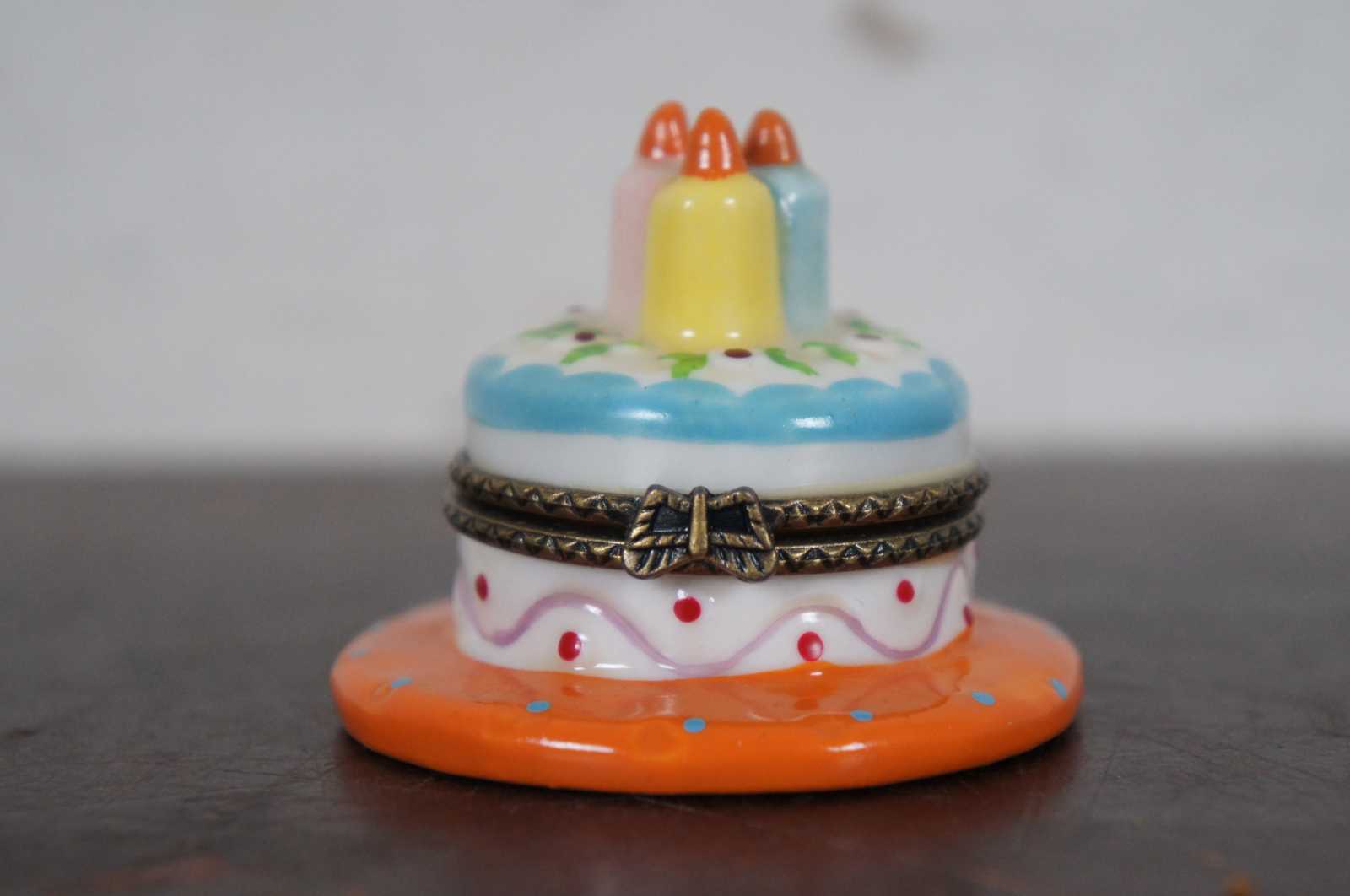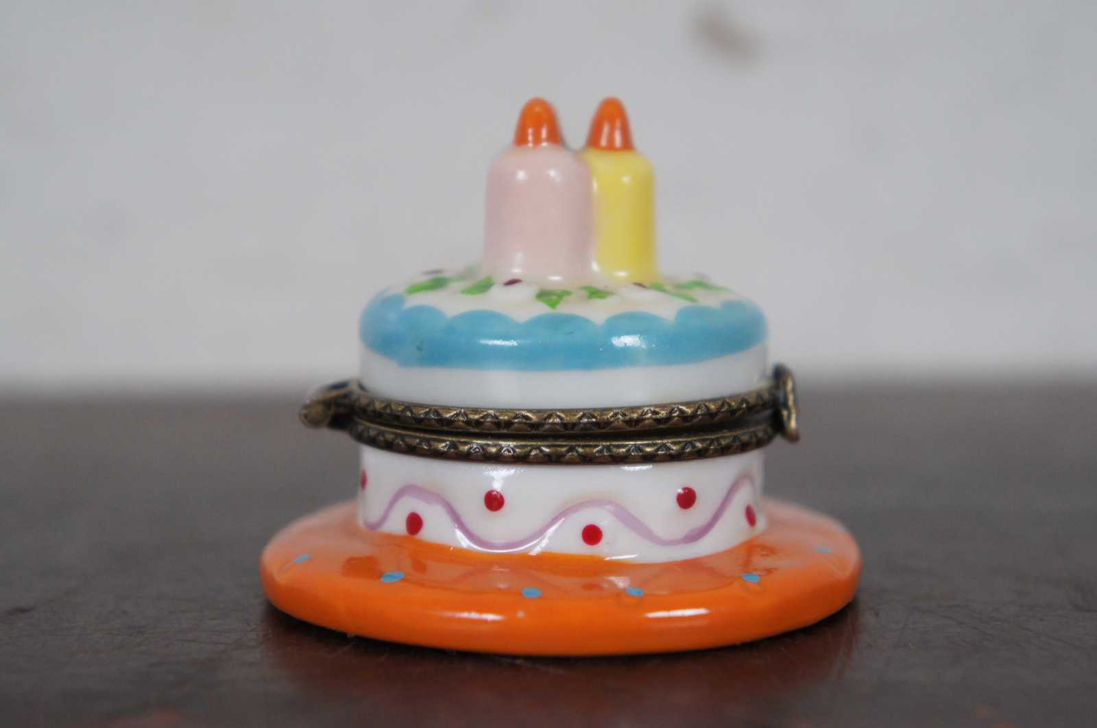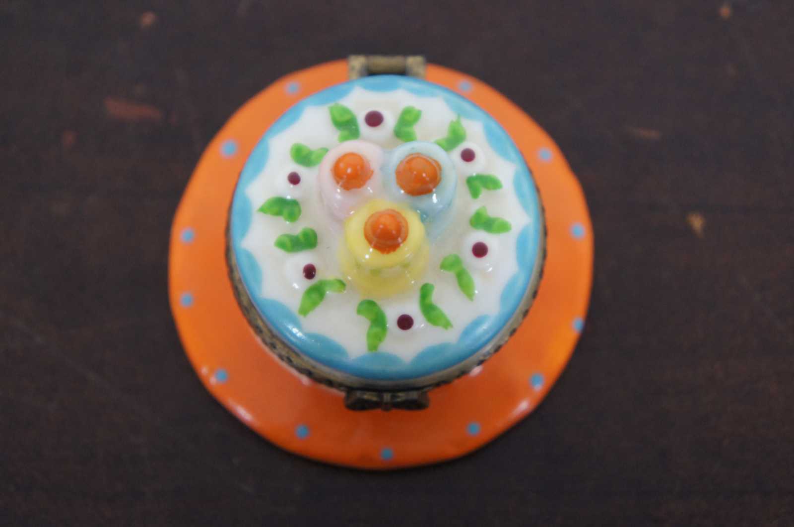Vintage Nomoges porcelain trinket or pill box shapes like a blue and white birthday cake on an orange plate with three candles.