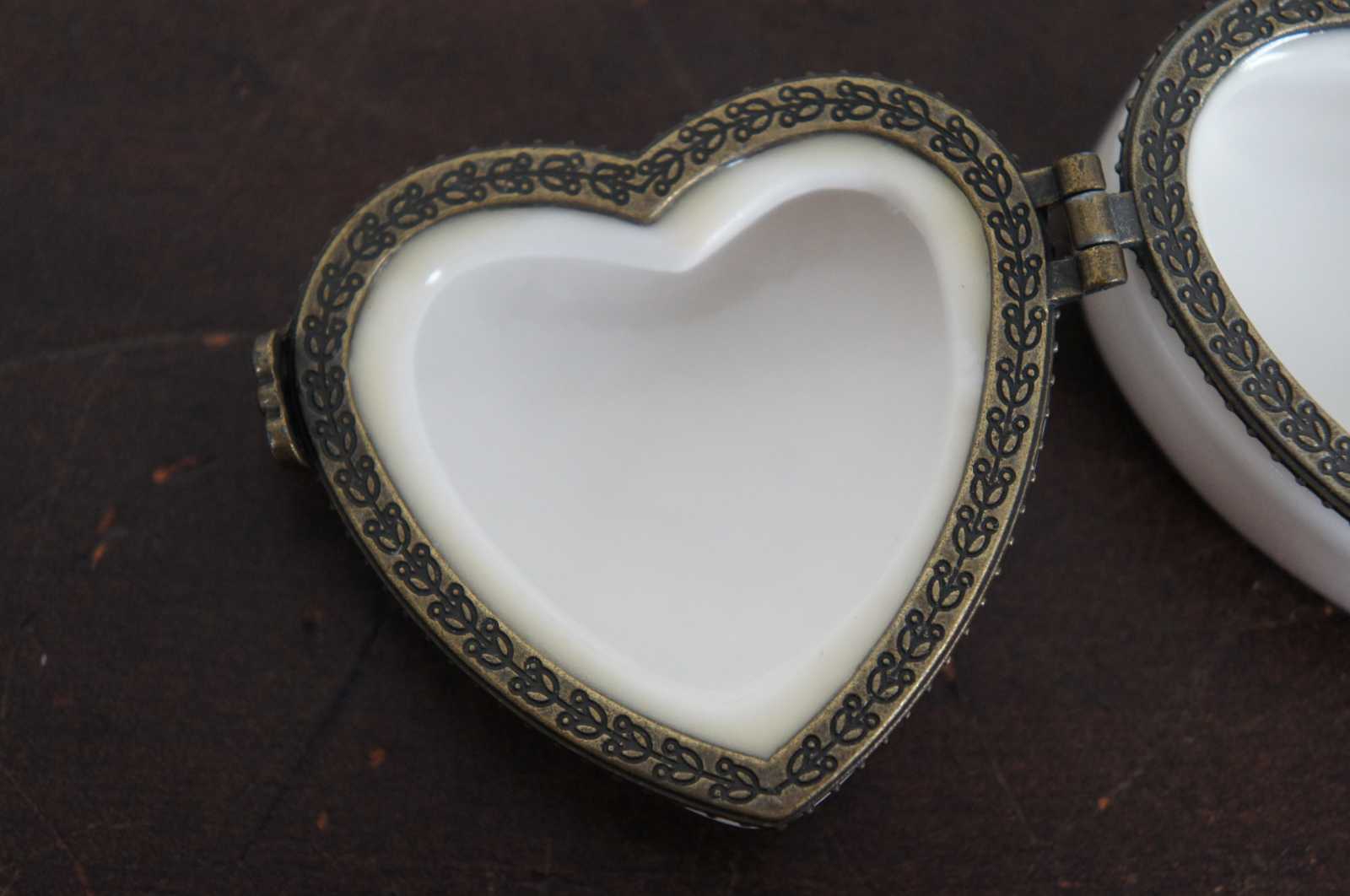 Vintage white porcelain heart shaped trinket or pill box painted with a Chinese character and the word Love.