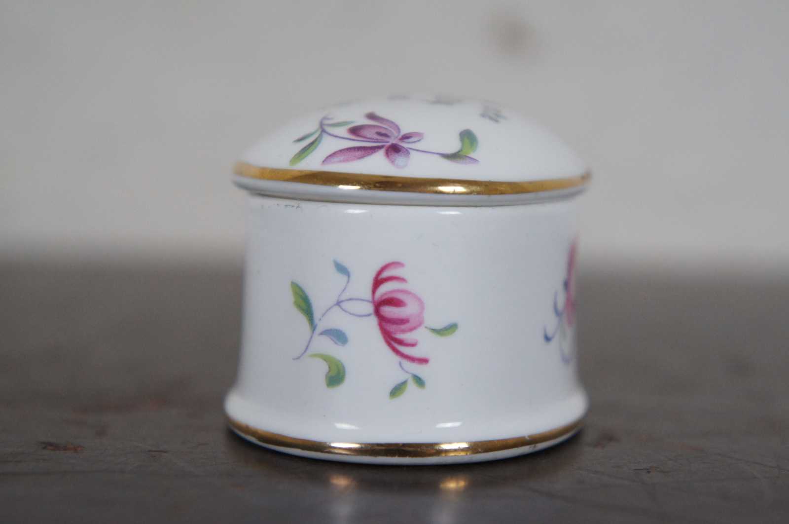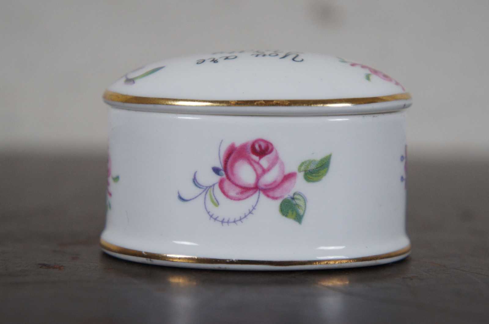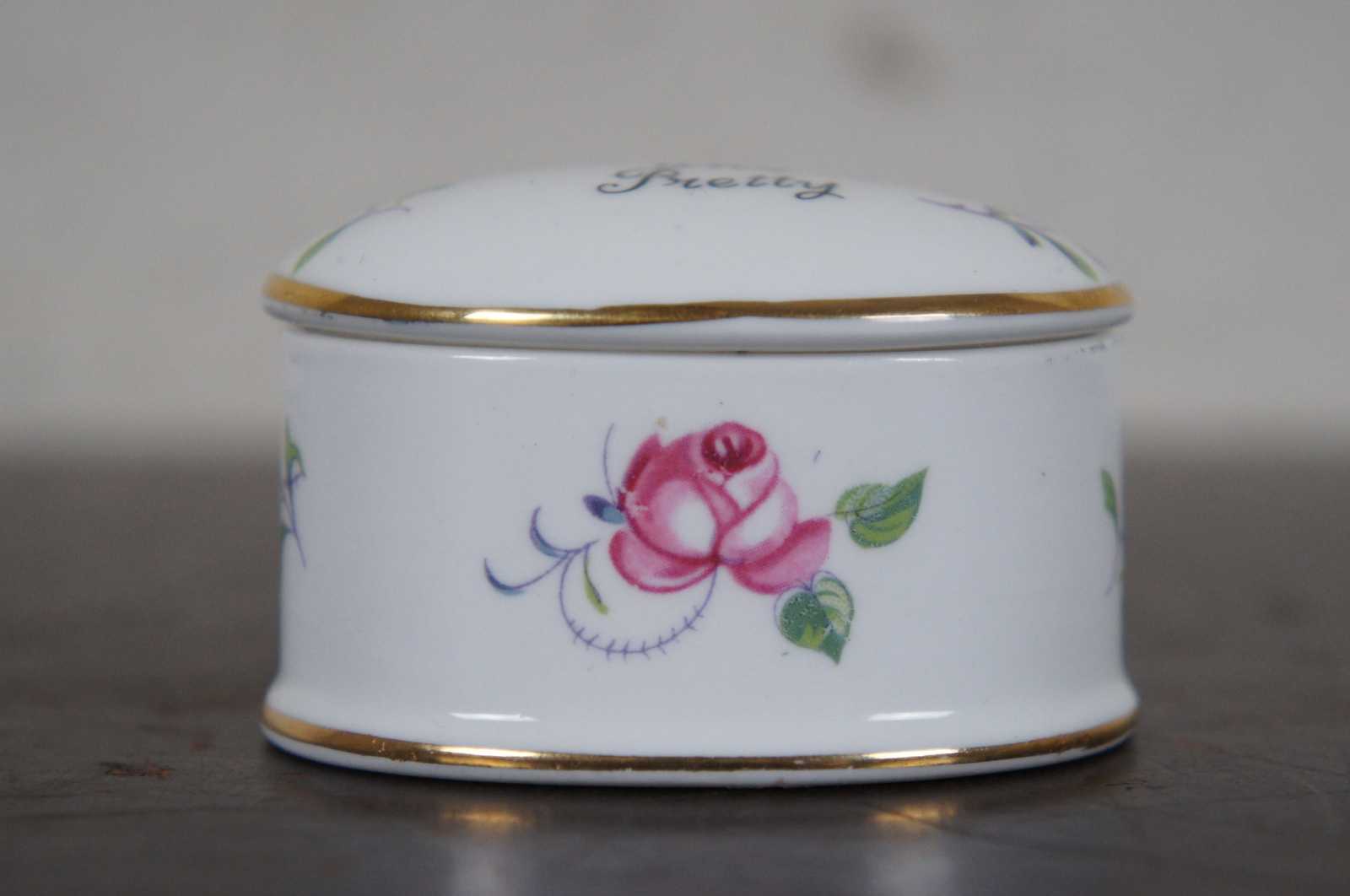 Vintage Crown Staffordshire fine bone china oval trinket dish, white porcelain with pink and purple flowers, a mirror inside, and the phrase “You are Witty and Pretty.”