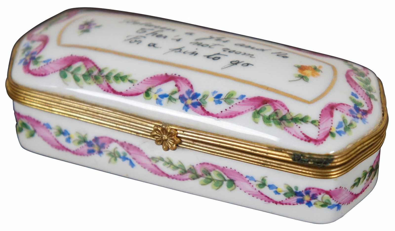Vintage Tiffany & Company Private Stock hand painted rectangular Limoges trinket or pill box, numbered 136; white porcelain painted with a pink ribbon entwined with a blue flowered vine and the phrase “Between a Yes and No Ther’s Not Room for a Pin to Go.”