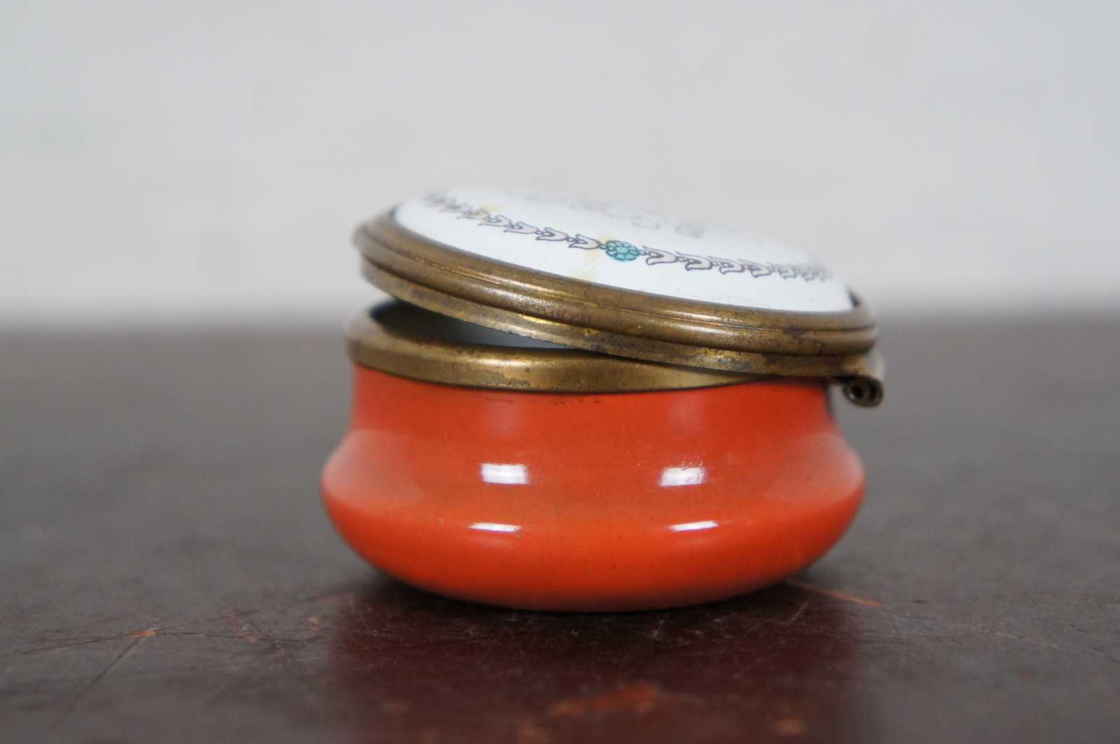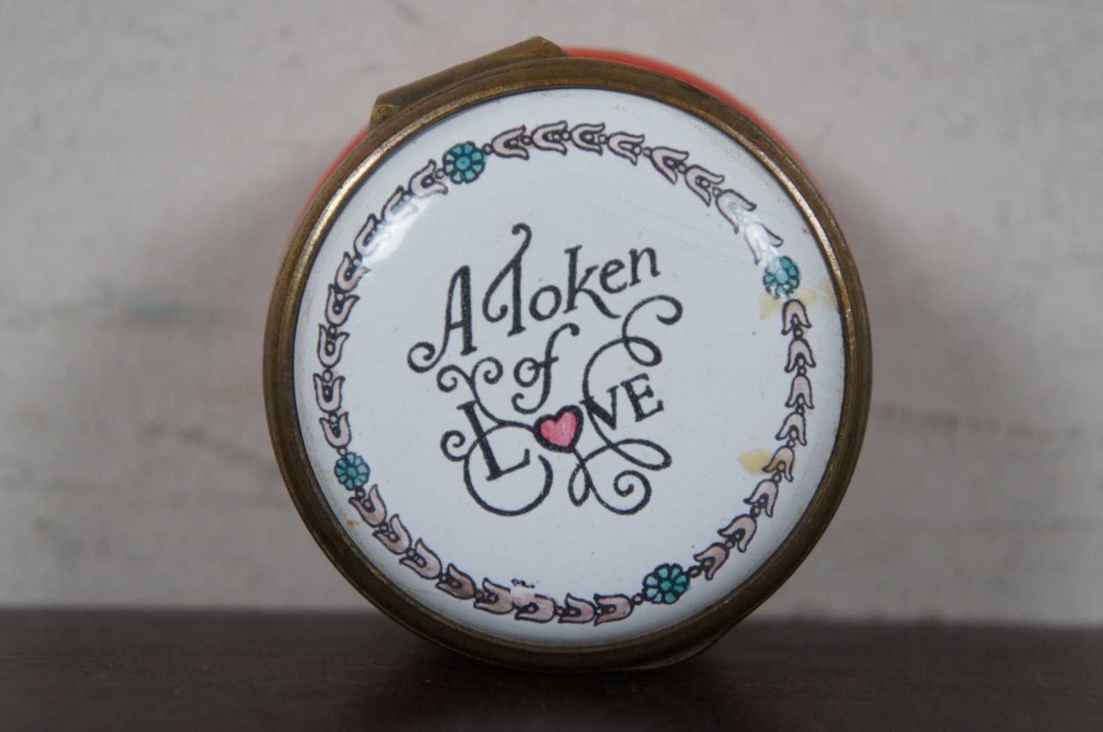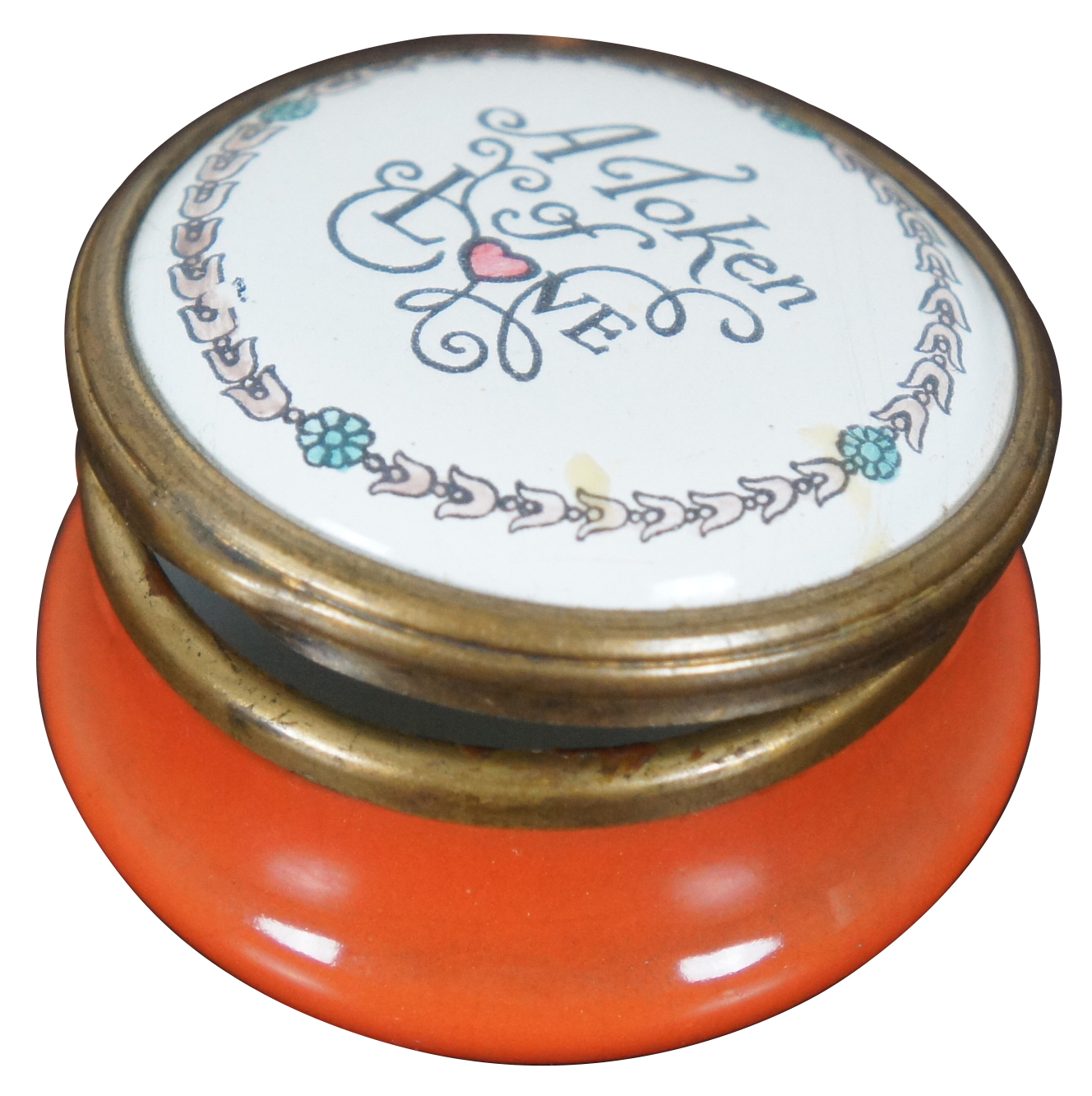 Vintage Bilston England enamel round trinket or pill box with orange sides, a wreath of flowers, and the phrase “A Token of Love.”