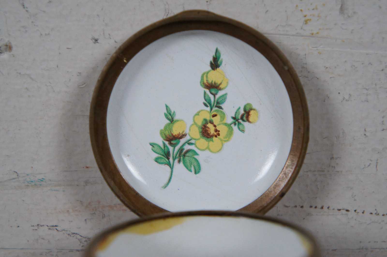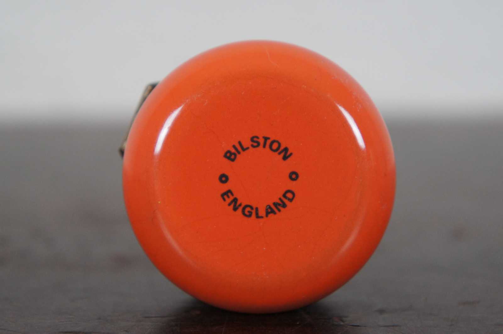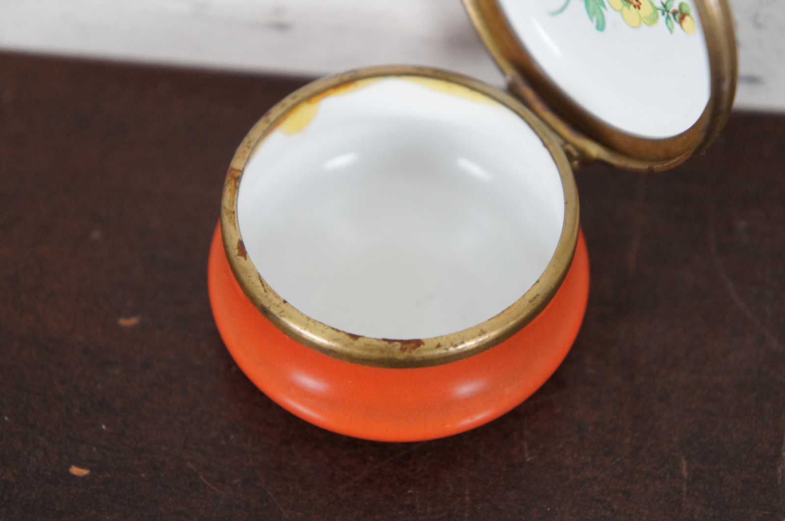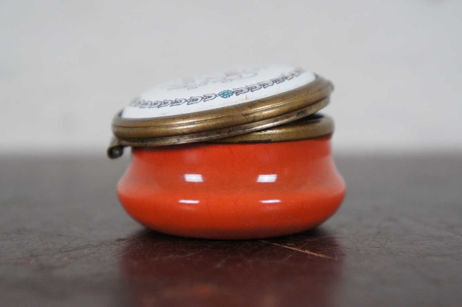 Vintage Bilston England enamel round trinket or pill box with orange sides, a wreath of flowers, and the phrase “A Token of Love.”