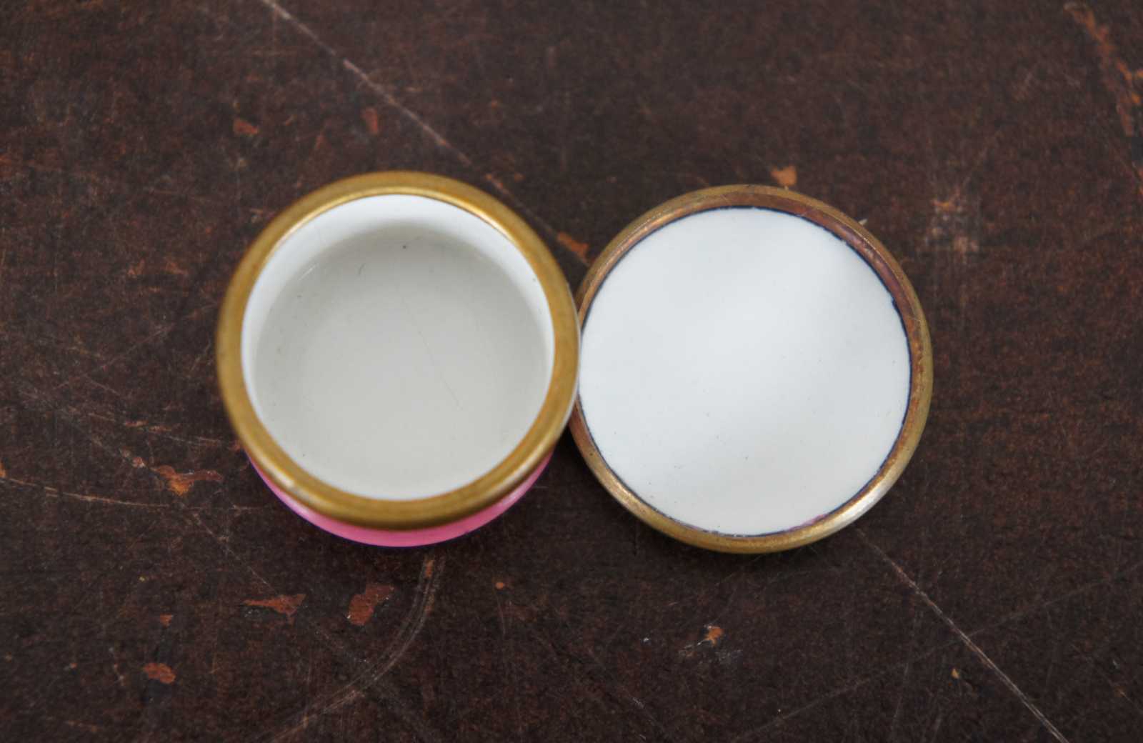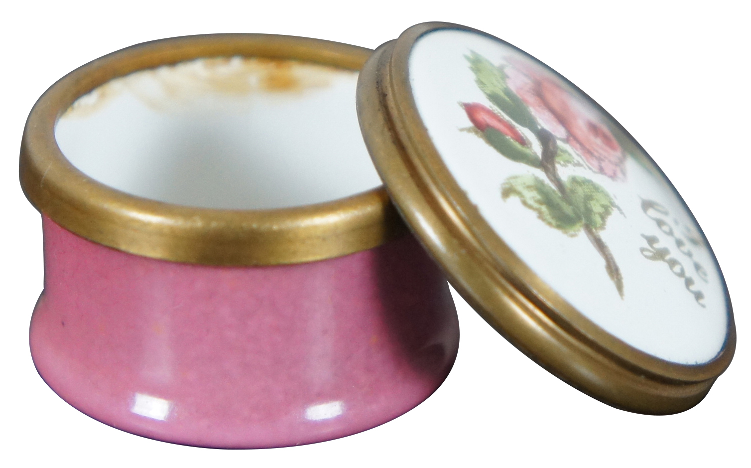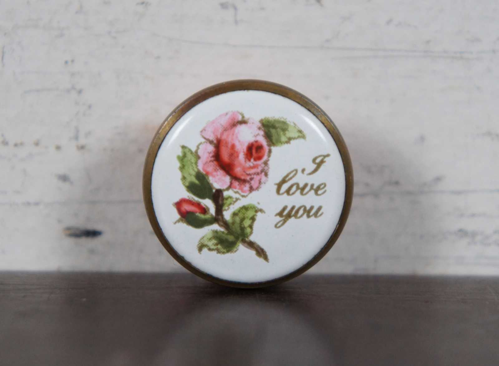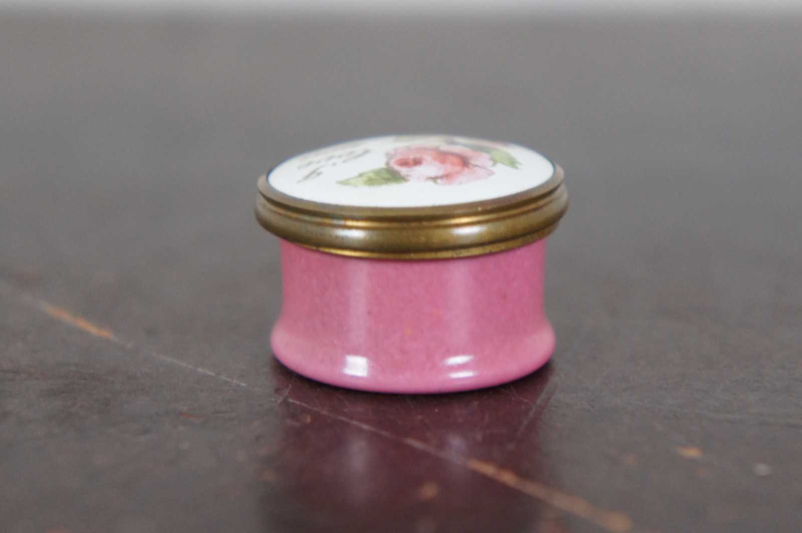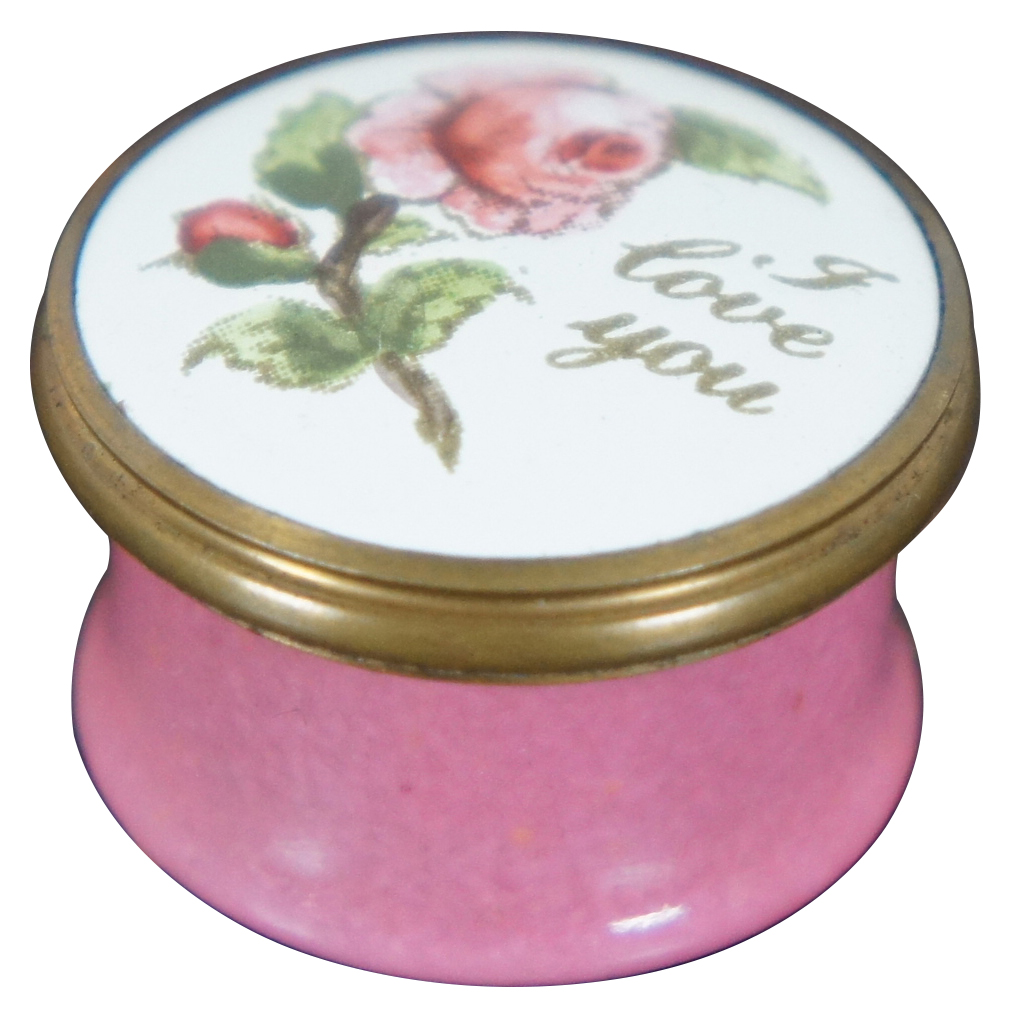 Vintage Bilston & Battersea Enamels miniature pill or trinket box designed by Halcyon Days with pinks sides, a rose and the phrase “I Love You.”