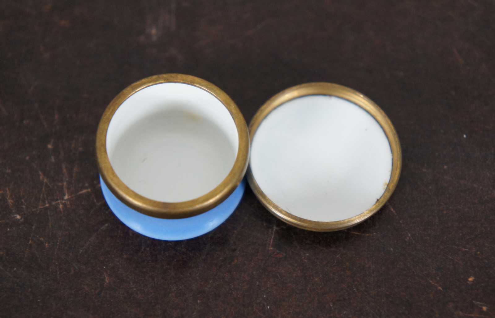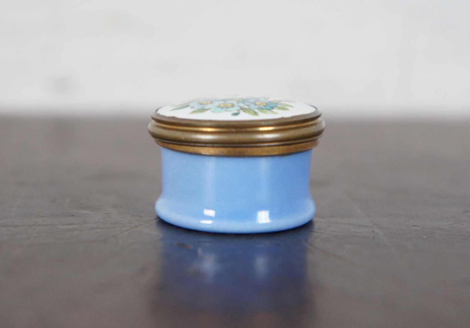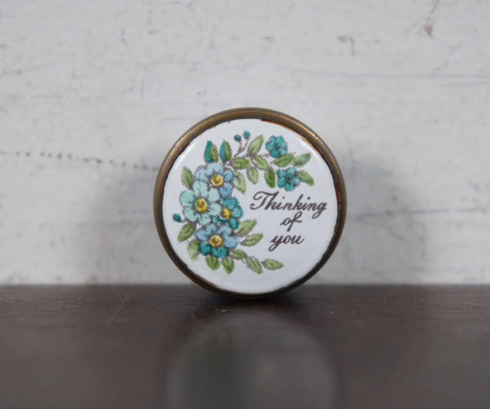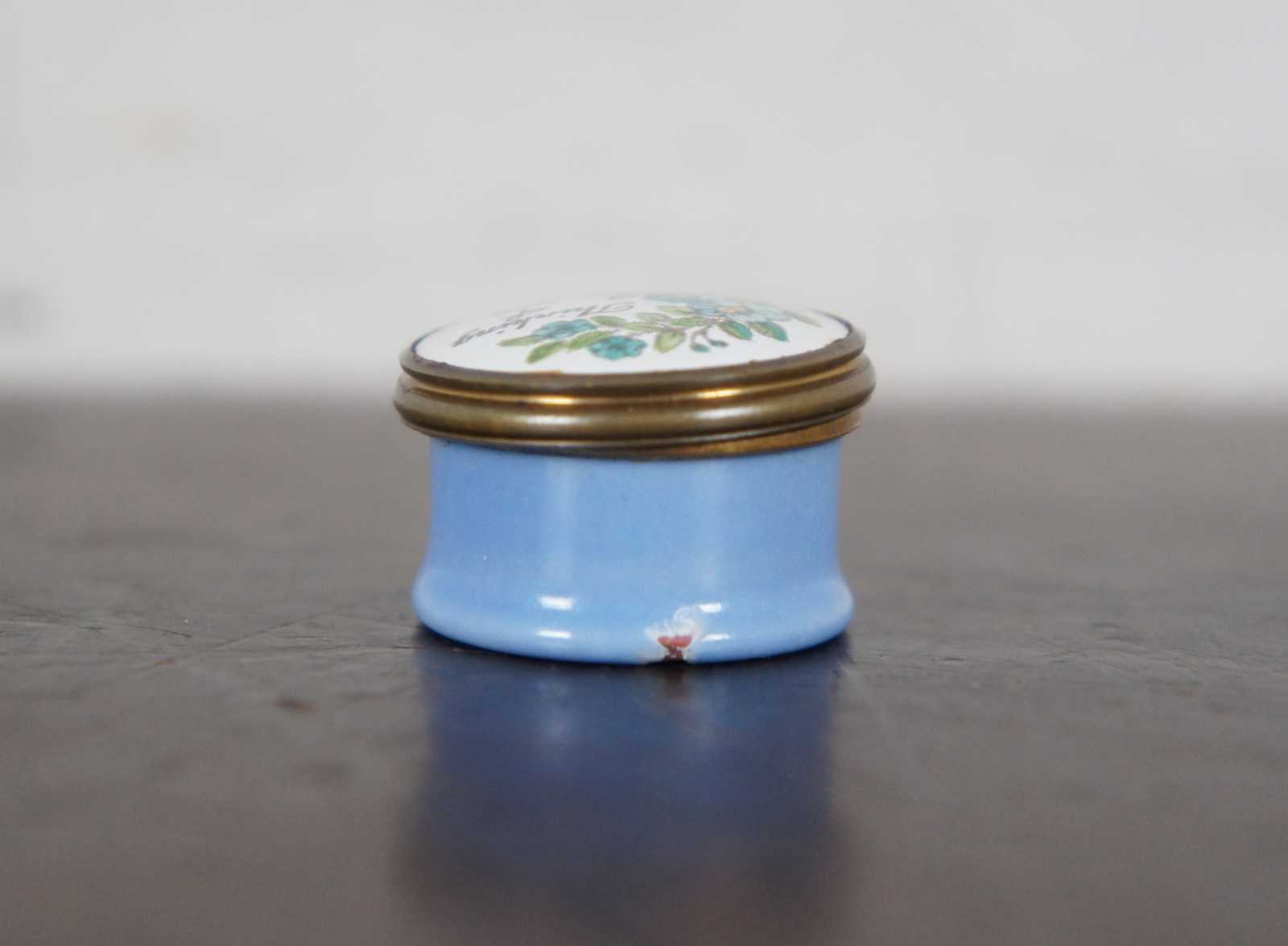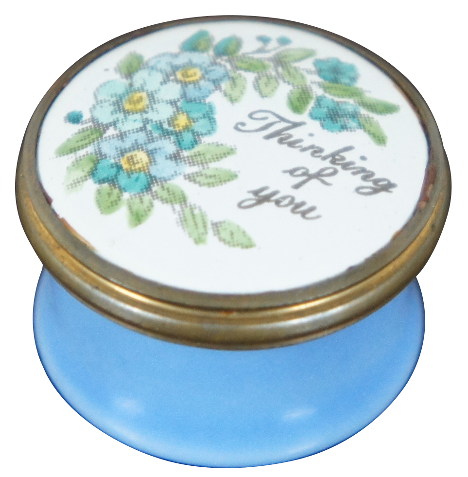 Vintage Bilston & Battersea Enamels miniature pill or trinket box designed by Halcyon Days with blue sides, blue flowers, and the phrase “Thinking of You.”