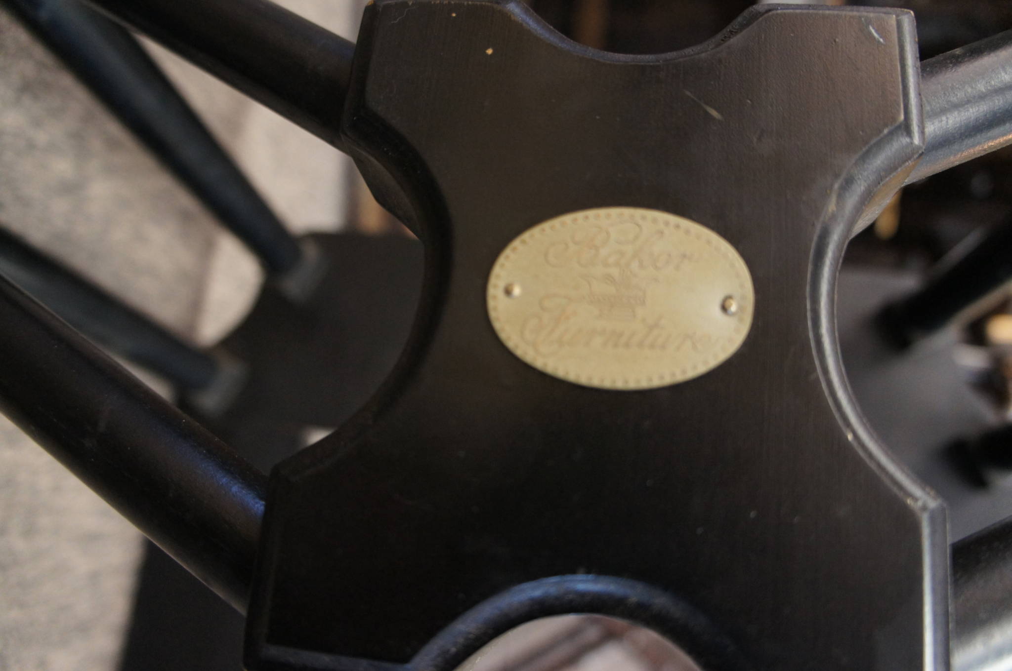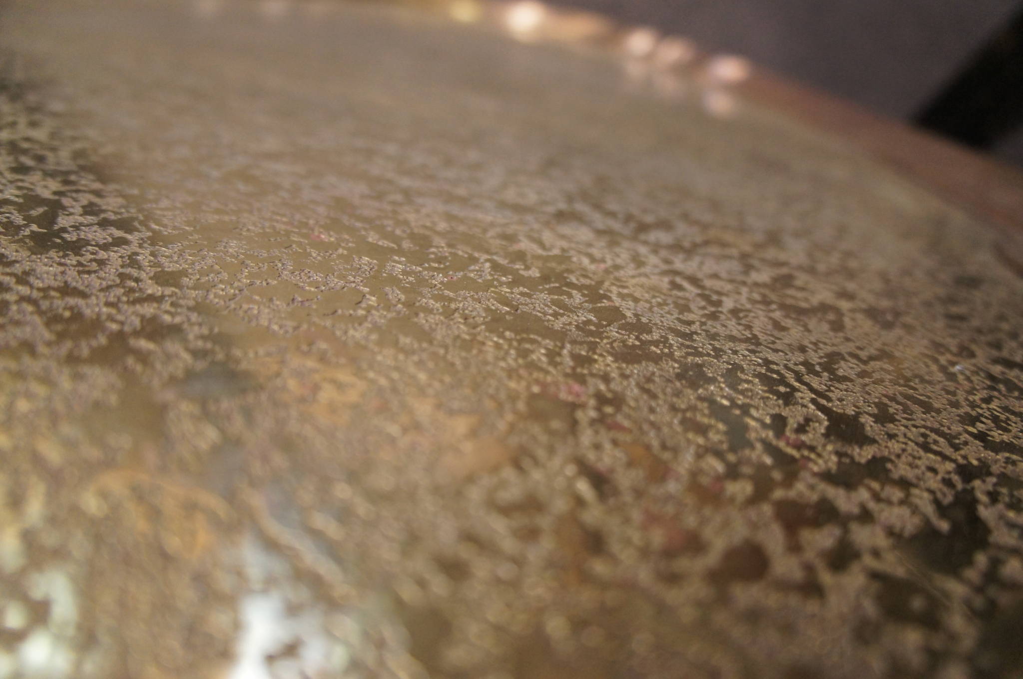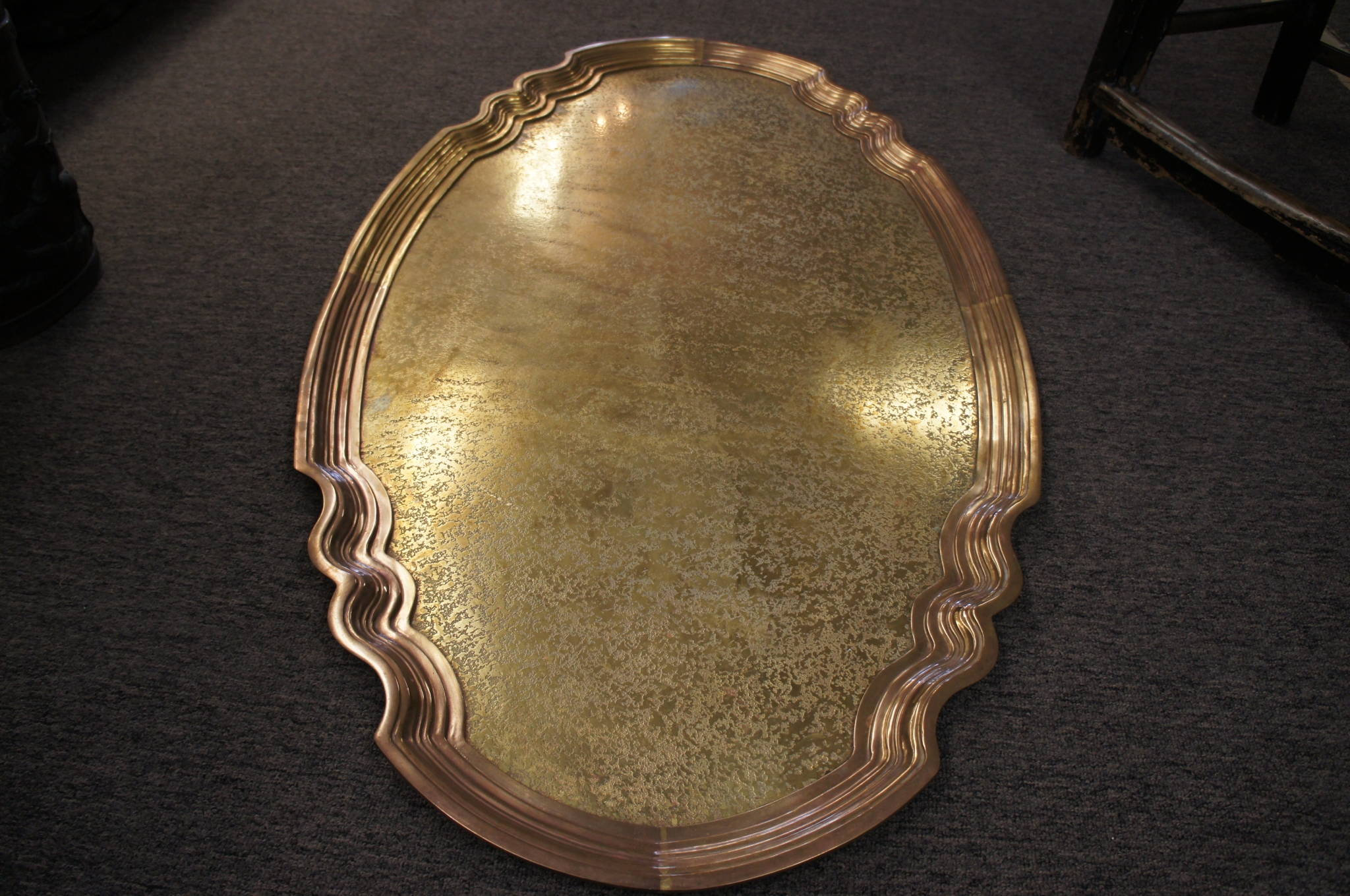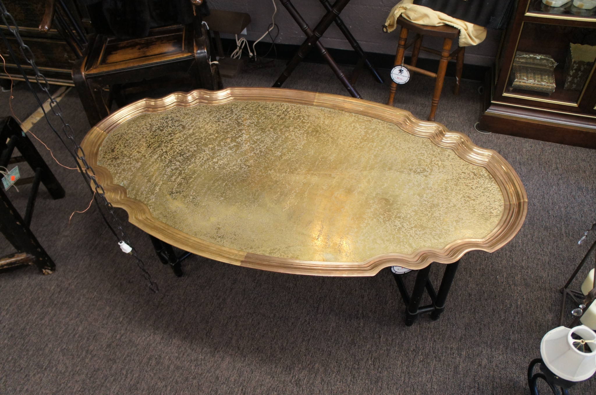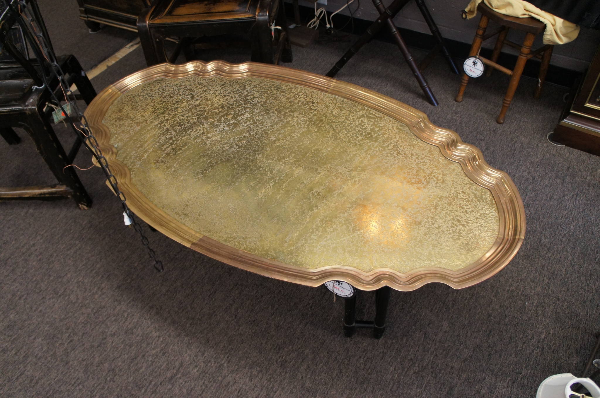 One Hammered Brass Coffee Table. You are viewing a very cool coffee table by Baker. This is vintage Baker. It was made mid century (50s-60s). Verydesirablewith collectors and designers.Would look great in any room and is a great conversation piece.Brass is in very good condition. Wood base is loose and has some surface wear. 56'' x 30'' x 17''