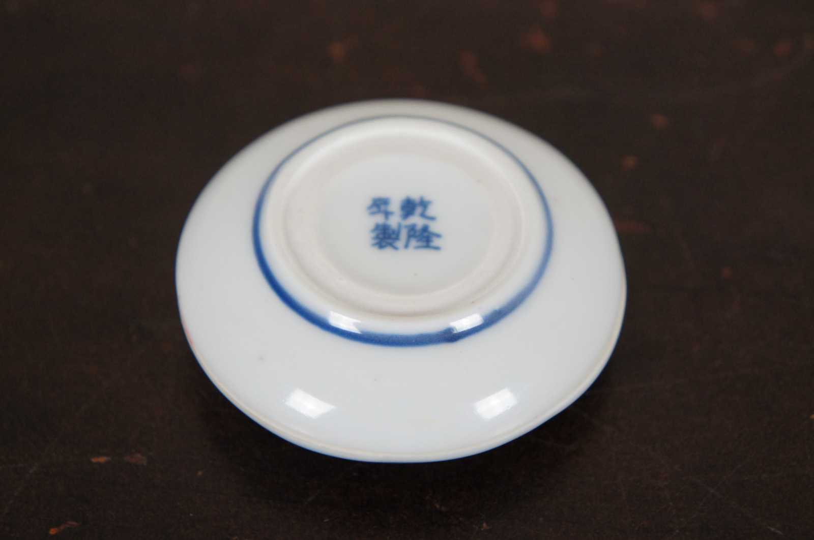Chinese porcelain blue and white round ink box filled with red ink and decorated with a twisting dragon.