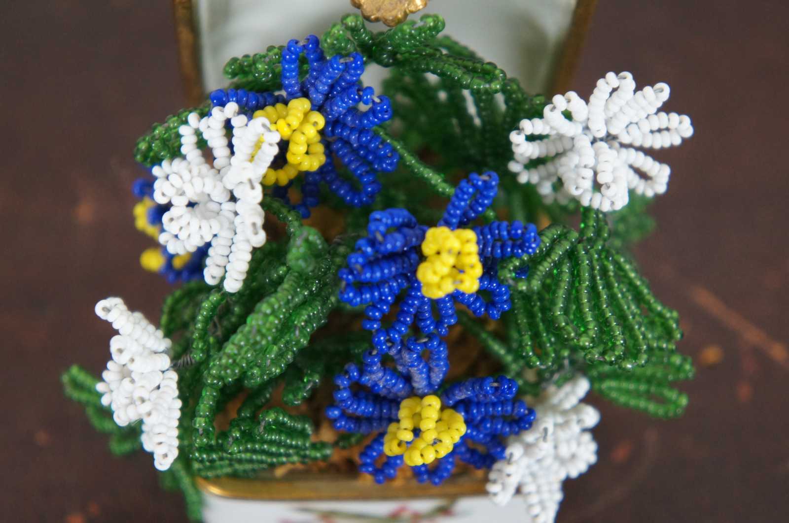 Antique Limoges porcelain made in France for Bonwit Teller square trinket box painted with a boquet of flowers and a ladybug, filled with blue and white seed bead flowers.