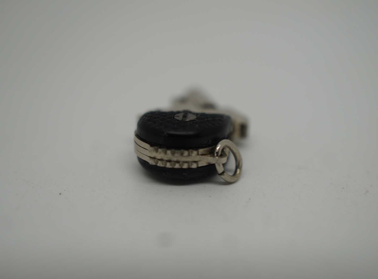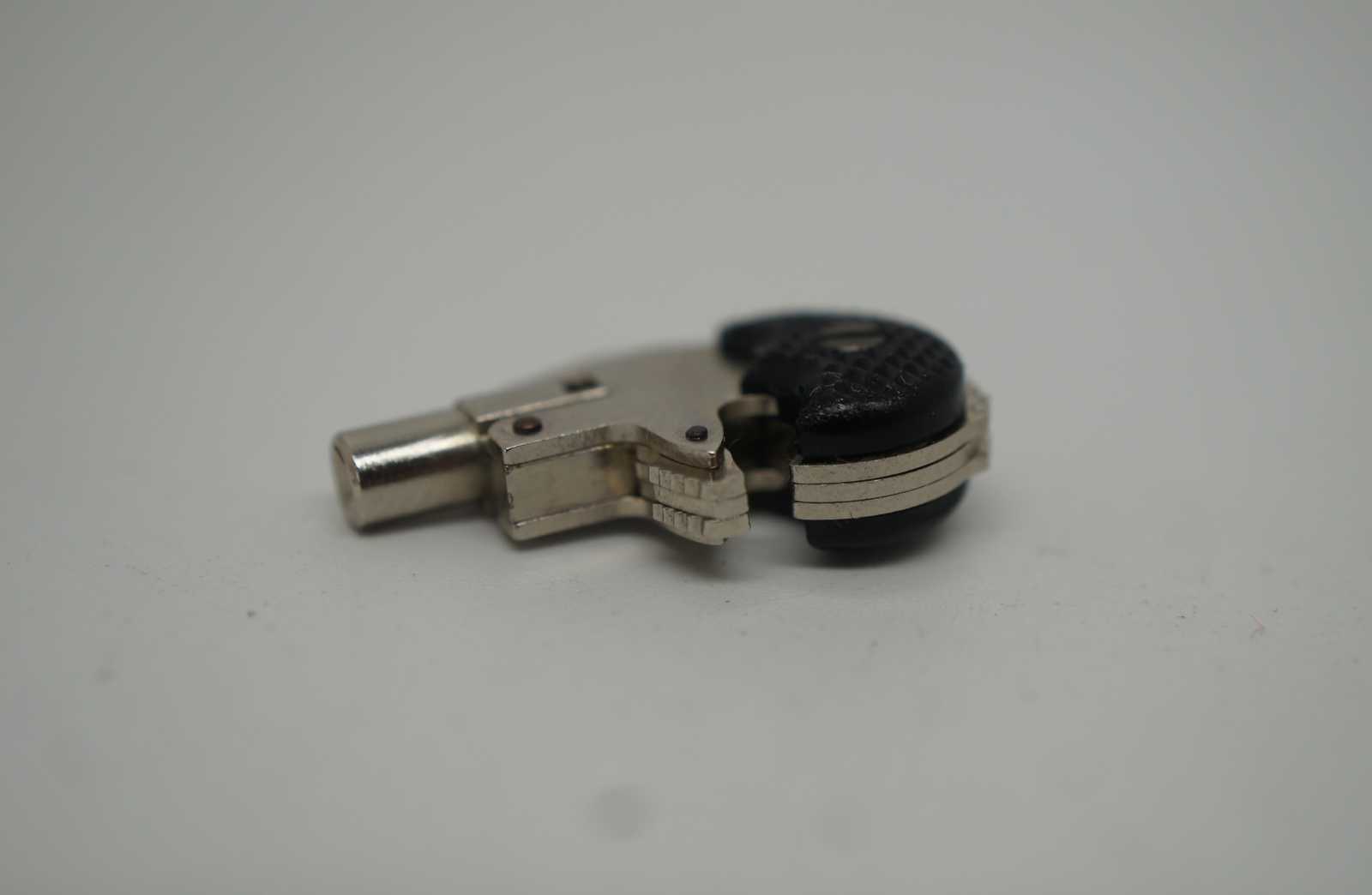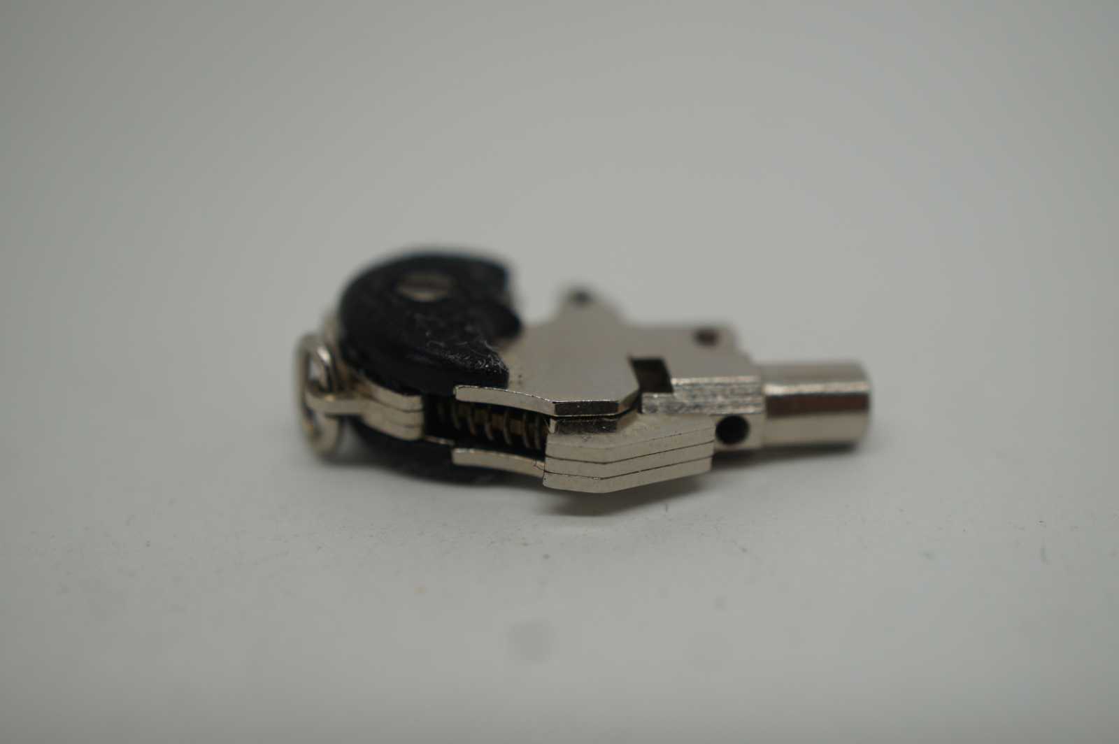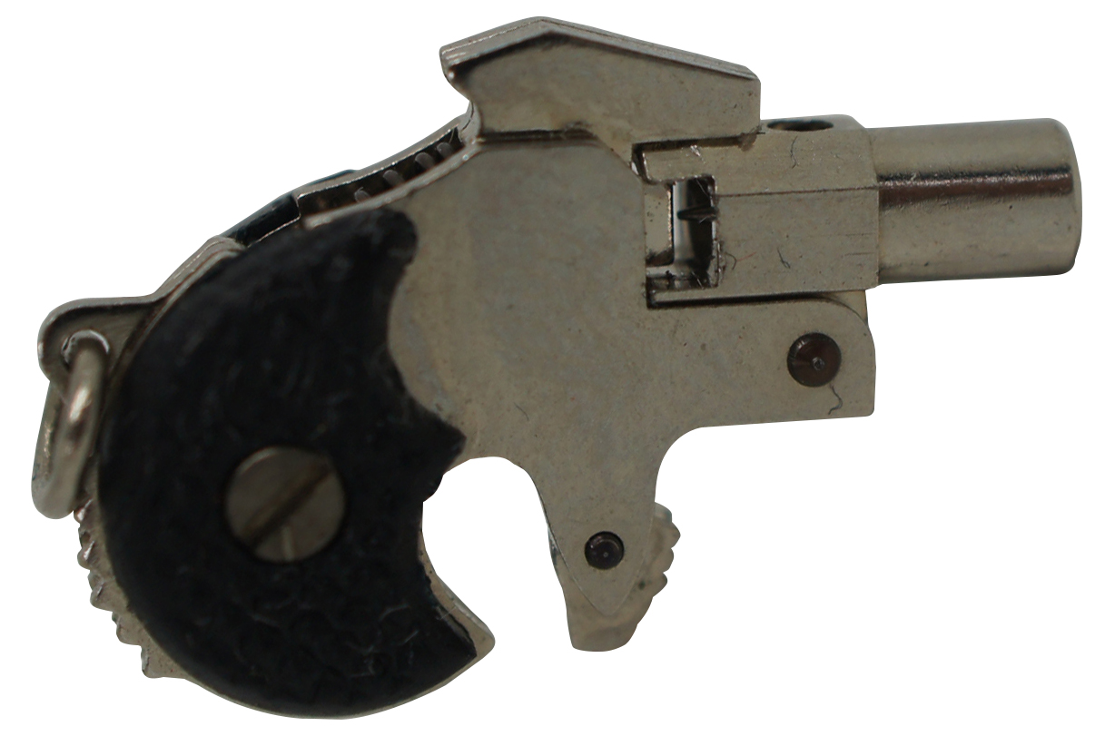 Vintage miniature toy gun in the shape of a pistol with a black grip with small ring on back for use as a key chain or watch fob. Top of barrel slides as if to cock but does not shoot.