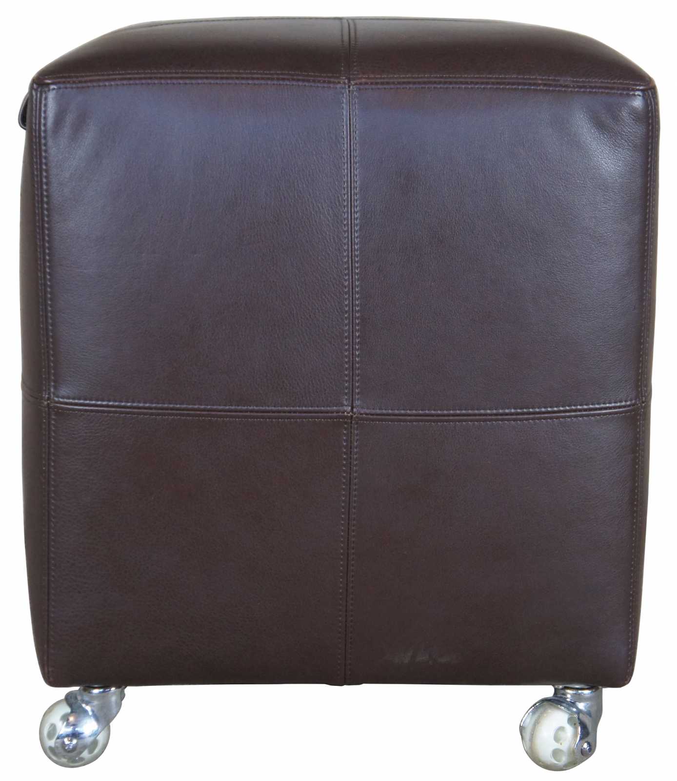 Pair of two vintage Baker Furniture ottomans or stools. Made of brown leather with rolling castors. Circa 1999.