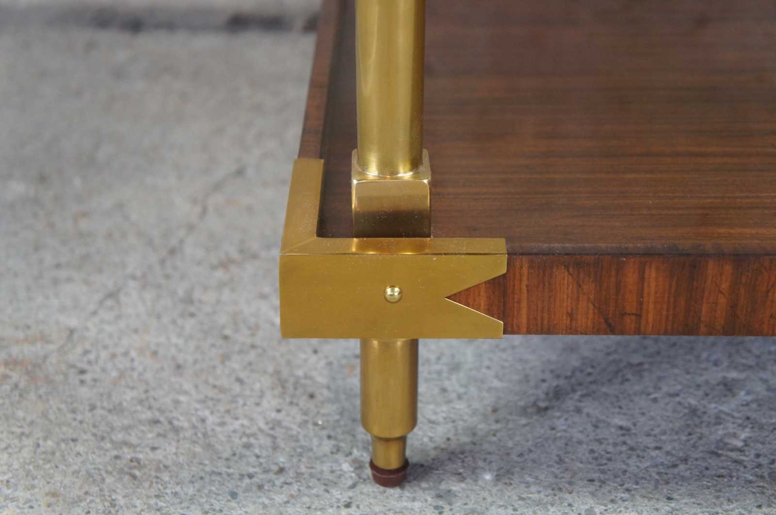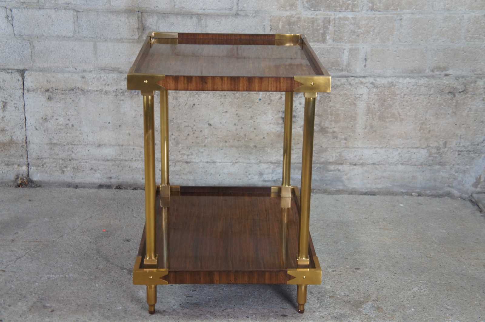 Vintage Celerie Kemble for Henredon Furniture William table. Held in place by brass columns and pierced rivets, this stylish side table shows off mahogany framework coated striated rosewood veneers. Perfect for the living room or boudoir, it contains two shelves for open storage. Includes protective glass top.