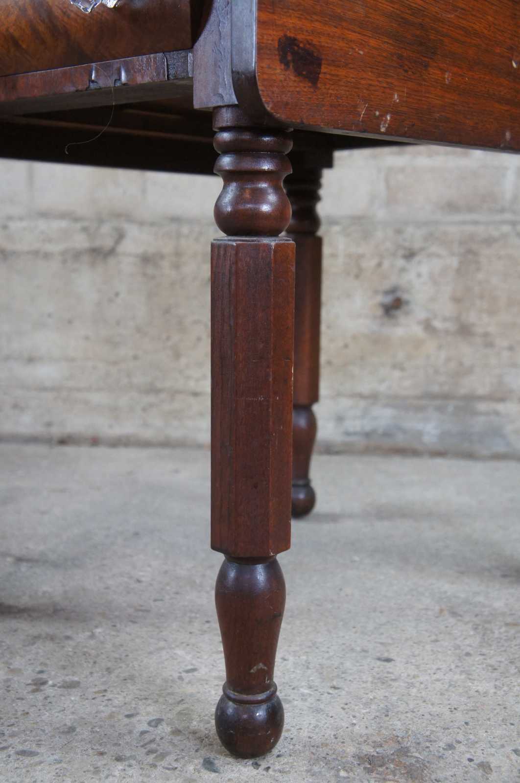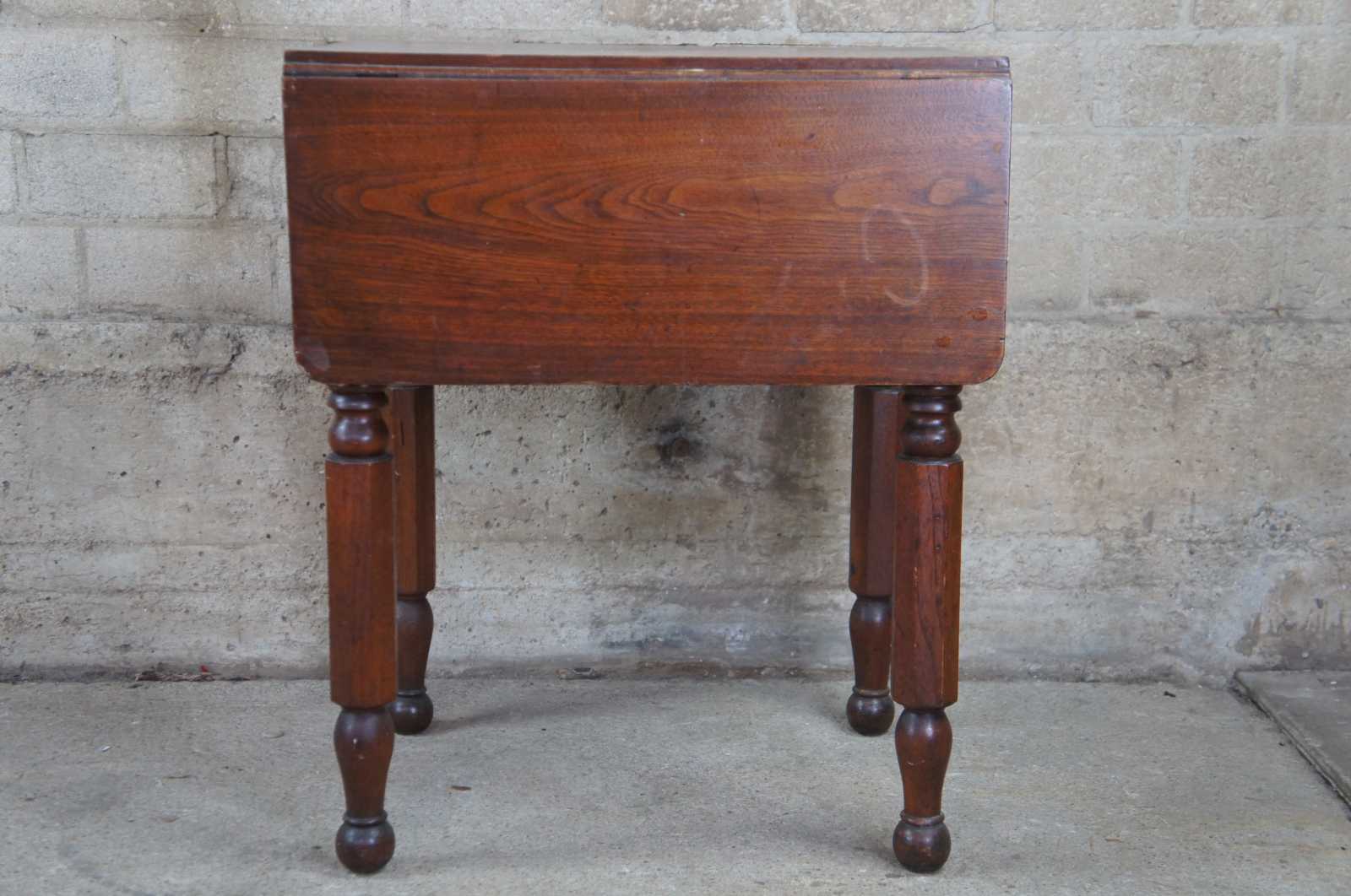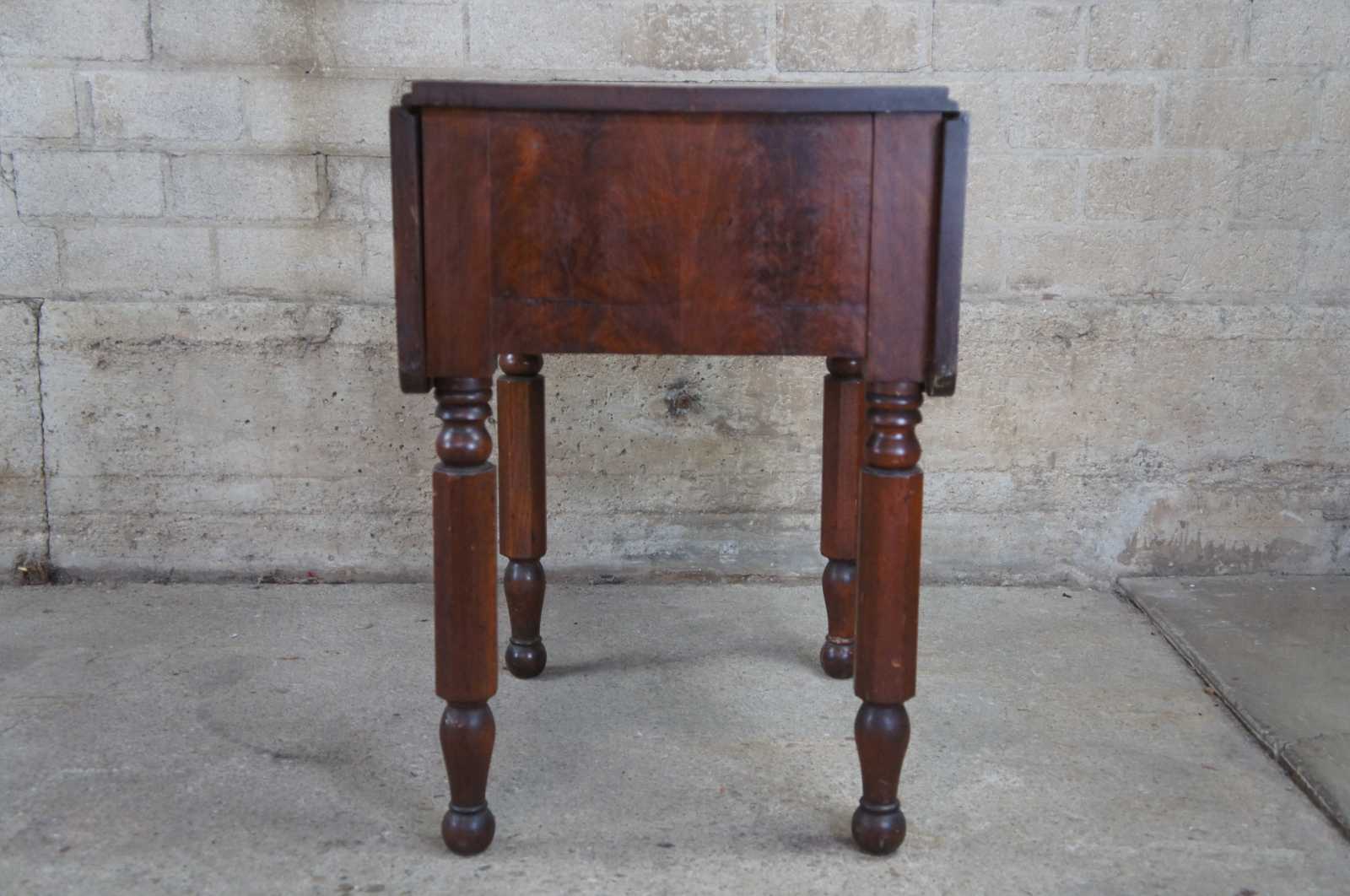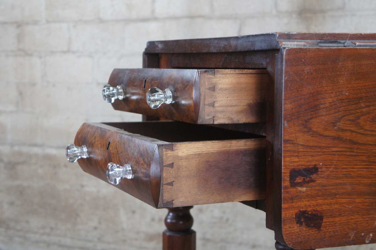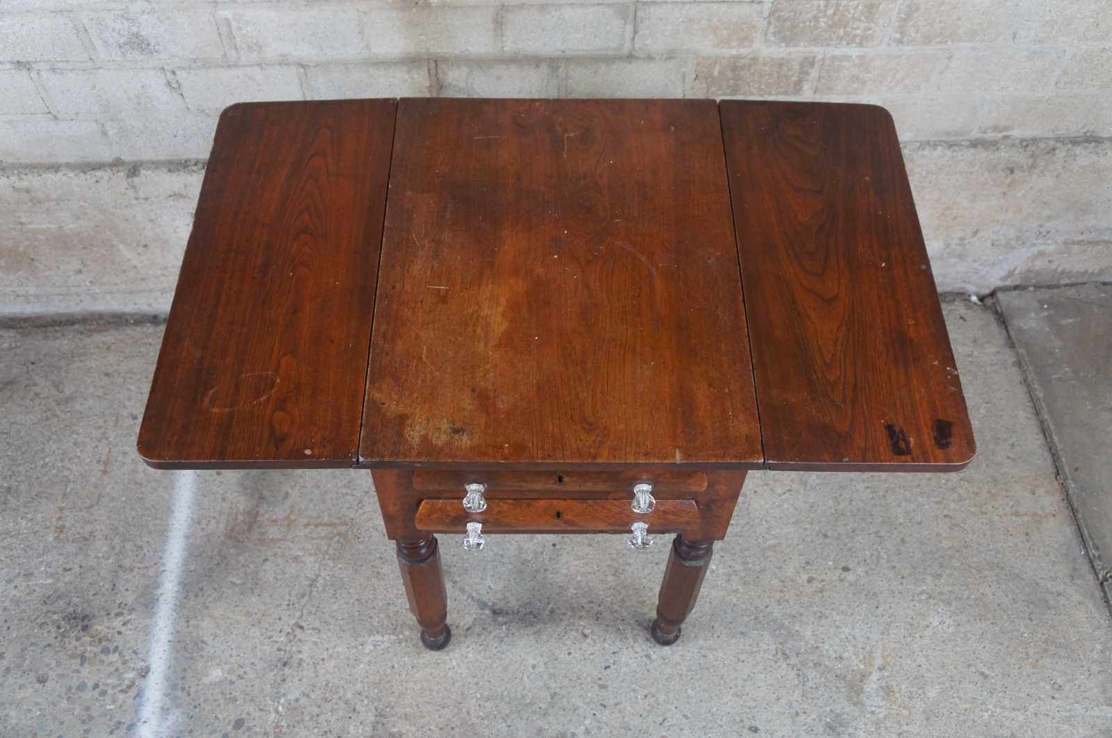 Antique American Federal drop leaf side table. Made of Mahognay featuring two drawers with glass pulls, turned legs and nubby feet.