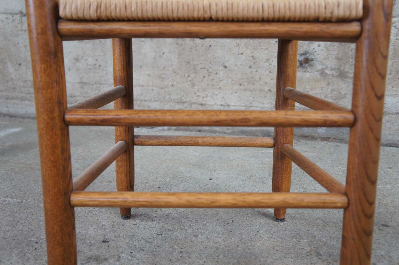 Pair of two ladder back side dining chairs. Made of oak featuring woven rush seats and tall ladderback with serpentine form.