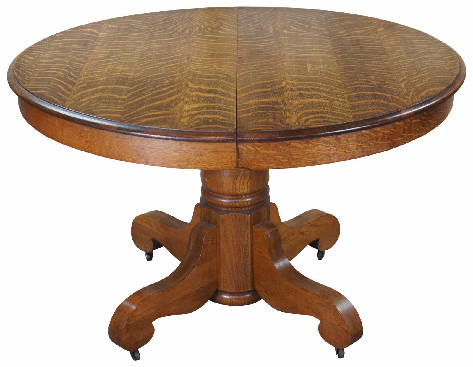 Late Victorian Empire inspired dining table. Crica 1900s. Made from quartersawn oak with scrolled feet. Includes 2 leafs for extension and casters.