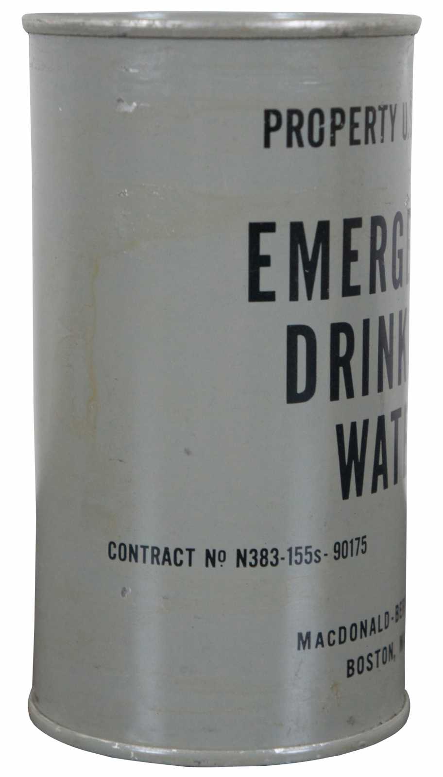 Vintage Cold war era, 1950s sealed can of US Government issued Emergency Drinking Water. MacDonald - Bernier Co, Boston Mass.