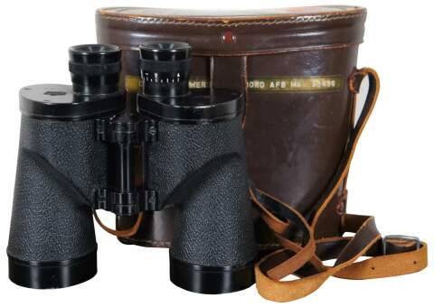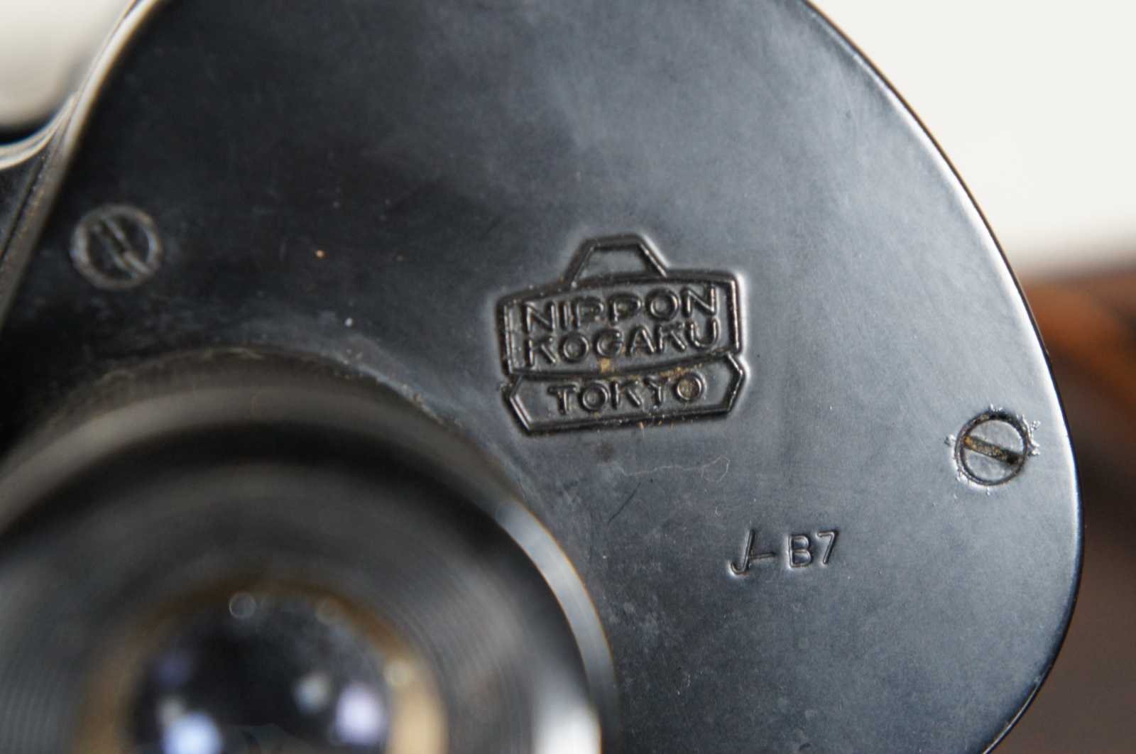 Vintage Nippon kogaku Tokyo J-B7 A series binoculars or field glasses, 7x50 7.3 degrees Coated lenses, with original brown leather case, labeled by previous owner. 814290.