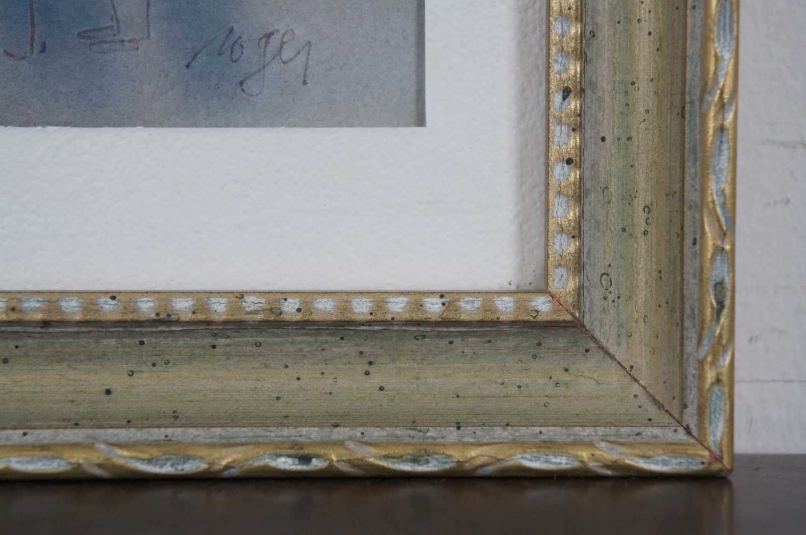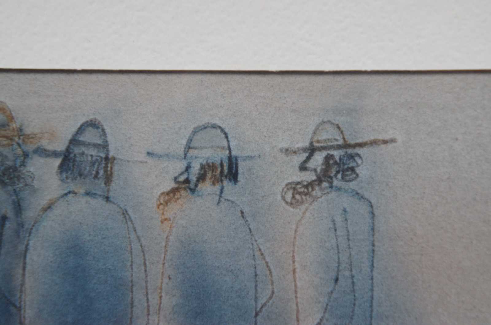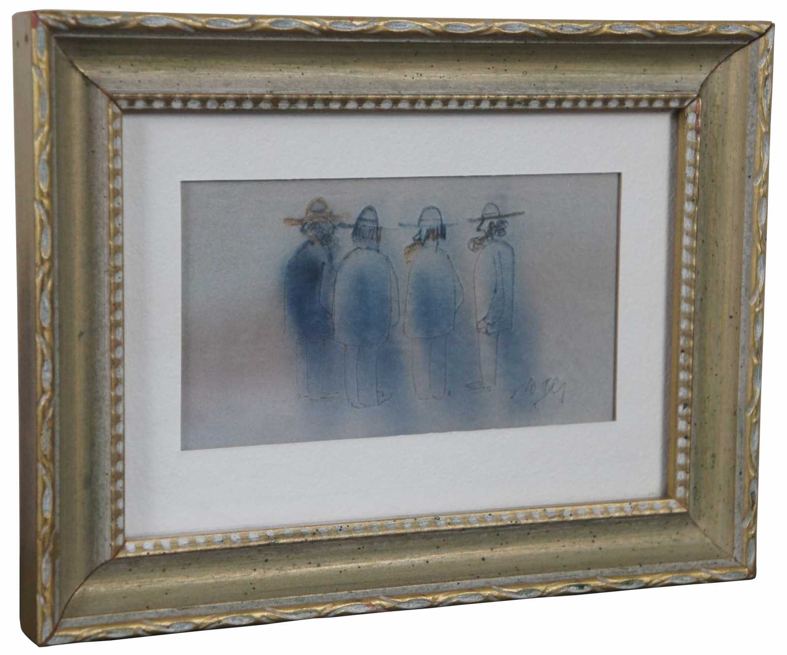 Vintage Roger Haas watercolor painting showing for Amish men standing in a row with hats and beards. “Roger Haas was born on October 5, 1918. Mr. Haas was a 1936 graduate of Steele High School in Dayton and a student at the Dayton Art Institute. He joined the U.S. Army in 1941 as a member of the 14th Cavalry Regiment, Third Brigade, Second Cavalry Division, seeing action in the Rhineland Campaign in 1944-1945 as a member of the 89th Regiment Cavalry, 9th U.S. Armored Division of the Third U.S. Corps of the 1st U.S. Army. He was a member of the Society of the Remagen Bridge. After the war Mr. Haas returned to Dayton and worked at A.O. Smith in Tipp City as a quality control supervisor until he took an early retirement in 1975 to fulfill his dream of becoming a full-time artist. He became nationally acclaimed and received many awards for his work in watercolors, specializing in landscapes and the Amish. Haas was a charter member of the Ohio Water Color Society, a member of Ohio Water Color and Sculptors, Tipp City Valley Arts and Crafts and Lyons Club International, who honored him with the Melvin Jones Fellowship. He passed away peacefully at home in Tipp City, Ohio on August 17, 2007.”