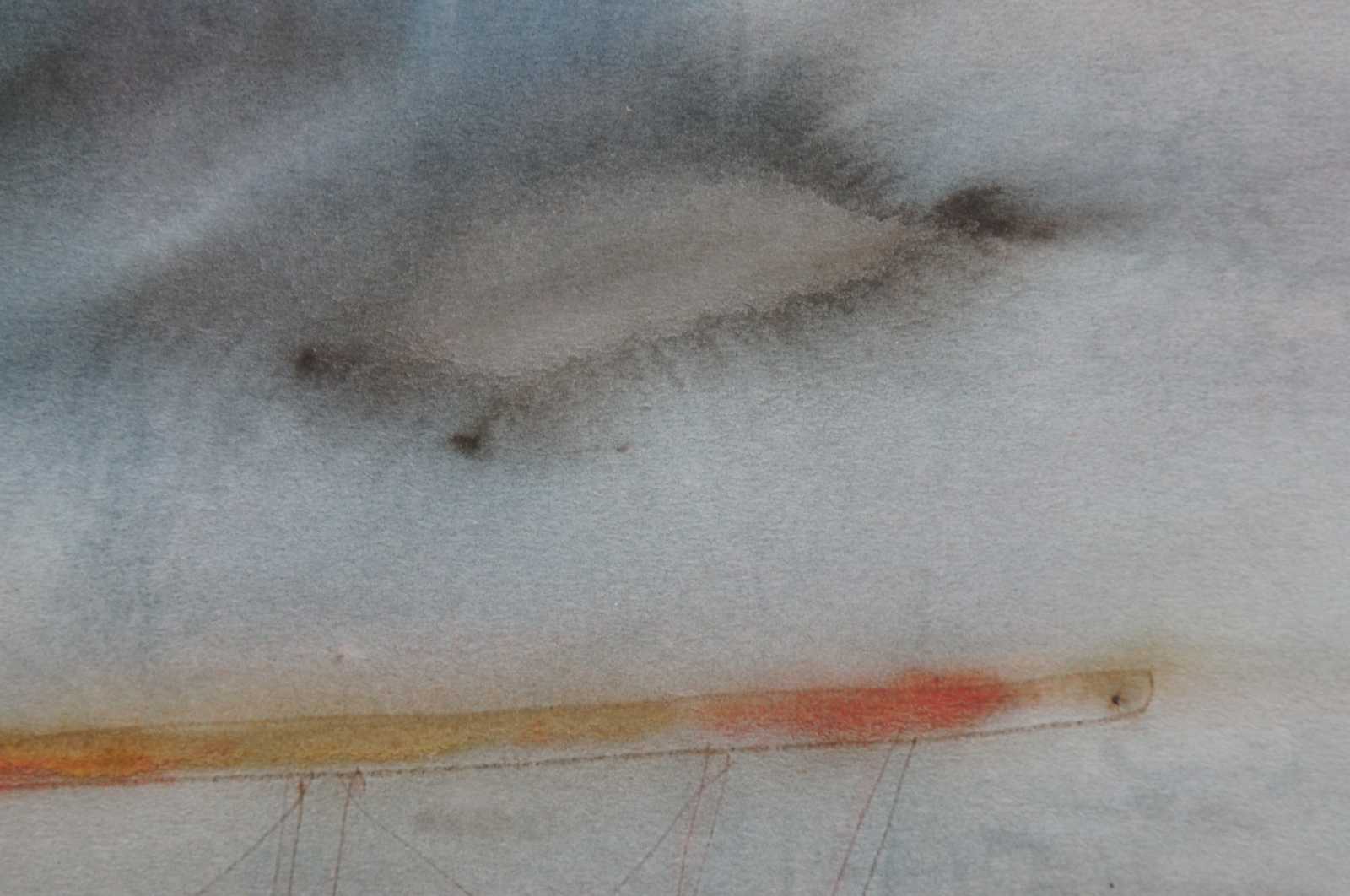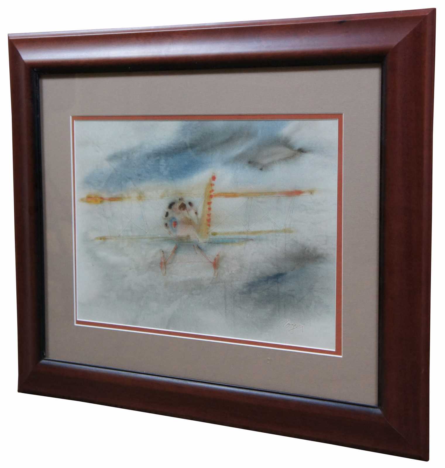 Vintage Roger Haas watercolor painting of a yellow and orange biplane flying through the sky. “Roger Haas was born on October 5, 1918. Mr. Haas was a 1936 graduate of Steele High School in Dayton and a student at the Dayton Art Institute. He joined the U.S. Army in 1941 as a member of the 14th Cavalry Regiment, Third Brigade, Second Cavalry Division, seeing action in the Rhineland Campaign in 1944-1945 as a member of the 89th Regiment Cavalry, 9th U.S. Armored Division of the Third U.S. Corps of the 1st U.S. Army. He was a member of the Society of the Remagen Bridge. After the war Mr. Haas returned to Dayton and worked at A.O. Smith in Tipp City as a quality control supervisor until he took an early retirement in 1975 to fulfill his dream of becoming a full-time artist. He became nationally acclaimed and received many awards for his work in watercolors, specializing in landscapes and the Amish. Haas was a charter member of the Ohio Water Color Society, a member of Ohio Water Color and Sculptors, Tipp City Valley Arts and Crafts and Lyons Club International, who honored him with the Melvin Jones Fellowship. He passed away peacefully at home in Tipp City, Ohio on August 17, 2007.”