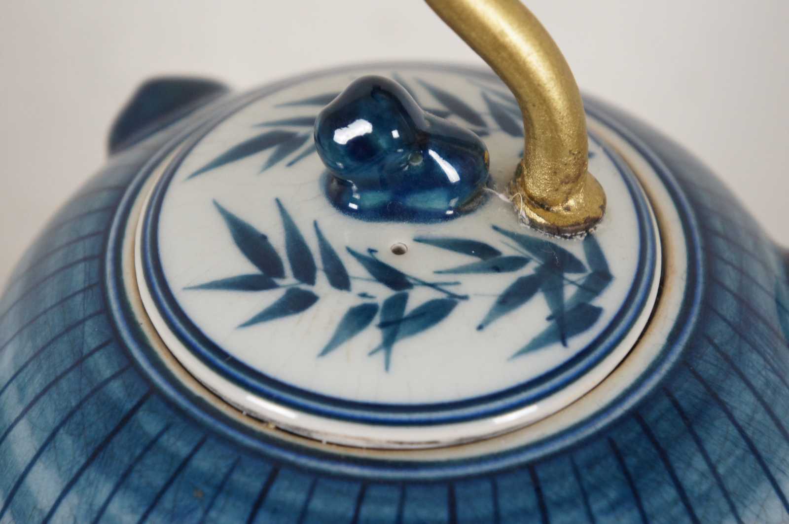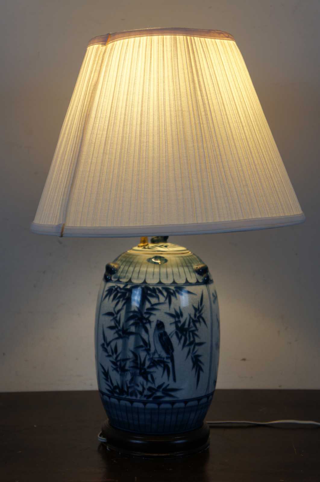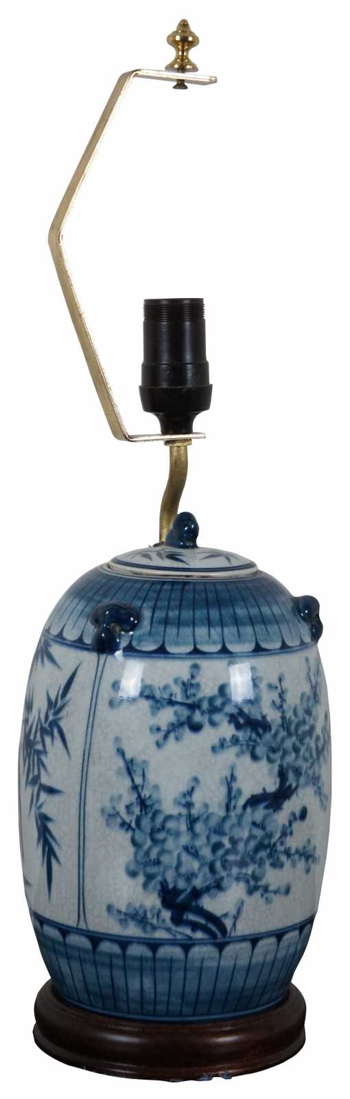 Antique Chinese blue and white lidded ginger jar converted into a table lamp with a wooden base featuring a bird, bamboo and cherry blossoms.