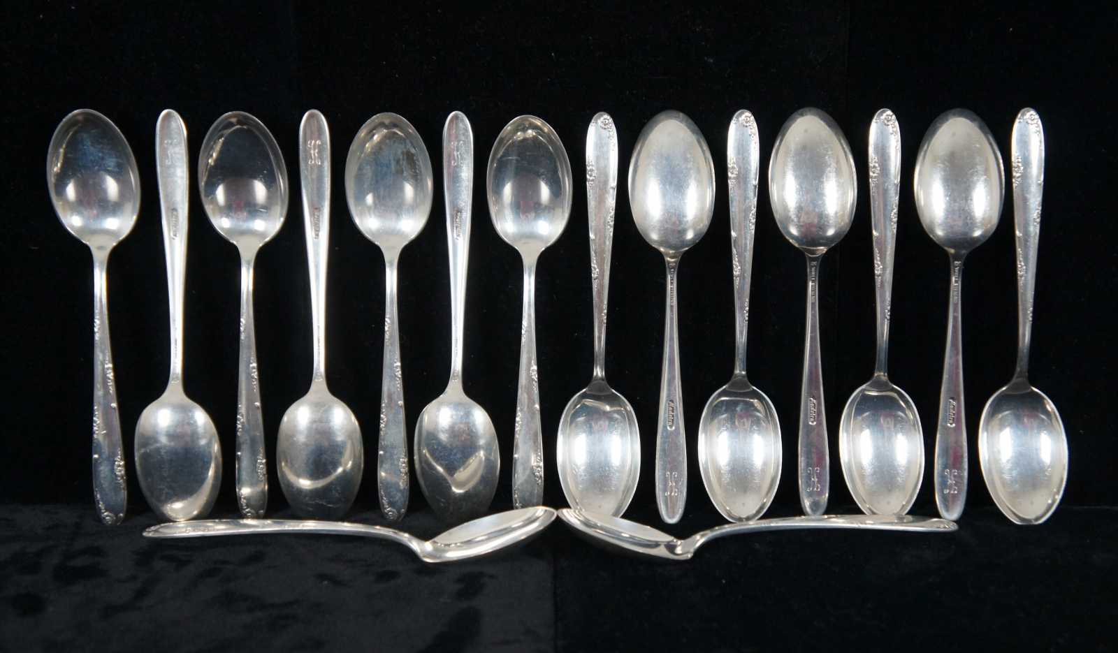 1948 Towle Sterling 68 piece flatware set and wood storage chest in the Madeira pattern, subtly monogrammed with a K. Includes three non-matching silver plate pieces from R. Wallace and Lady Doris.