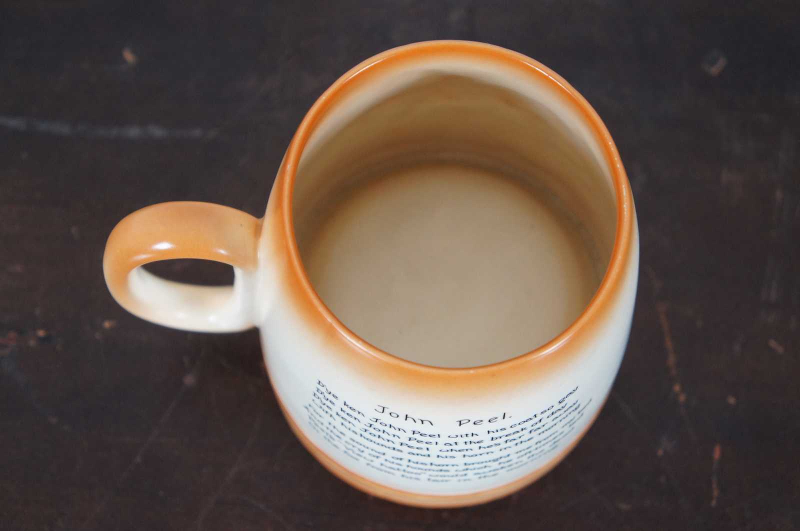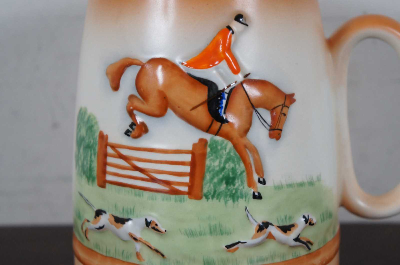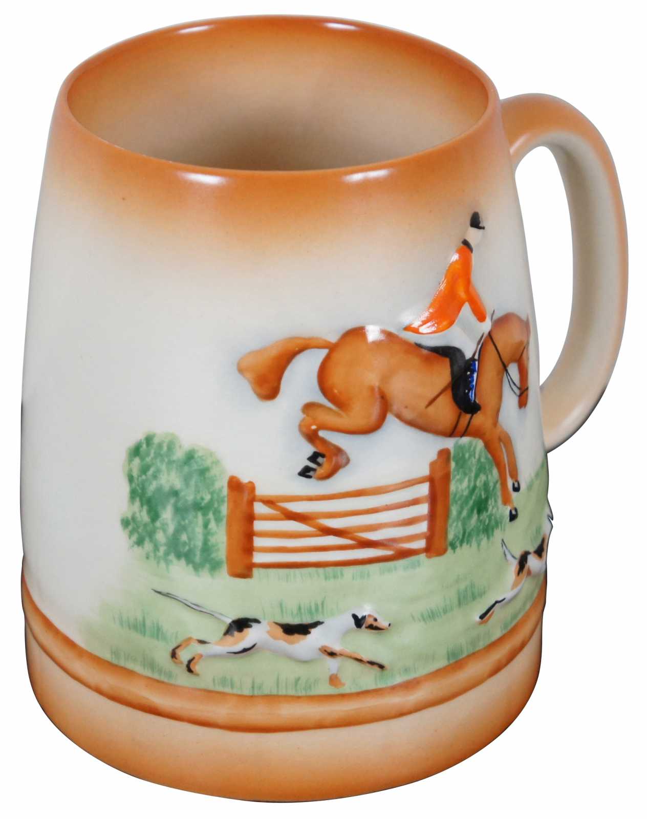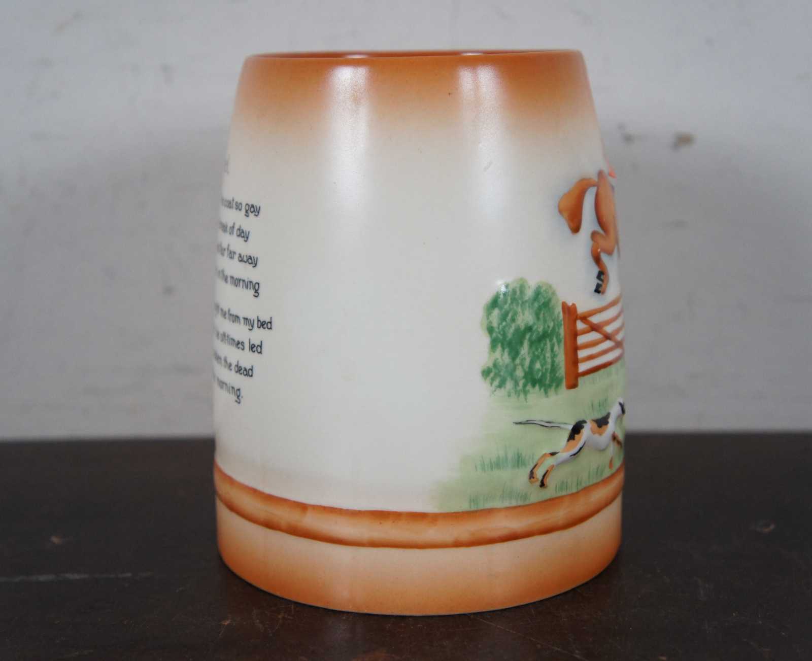 Vintage Carlton Ware English porcelain musical tankard featuring a fox hunt / equestiran scene with jumping horse and dogs and the lyrics for the folk song “D’ye Ken John Peel.” Working music box in base.