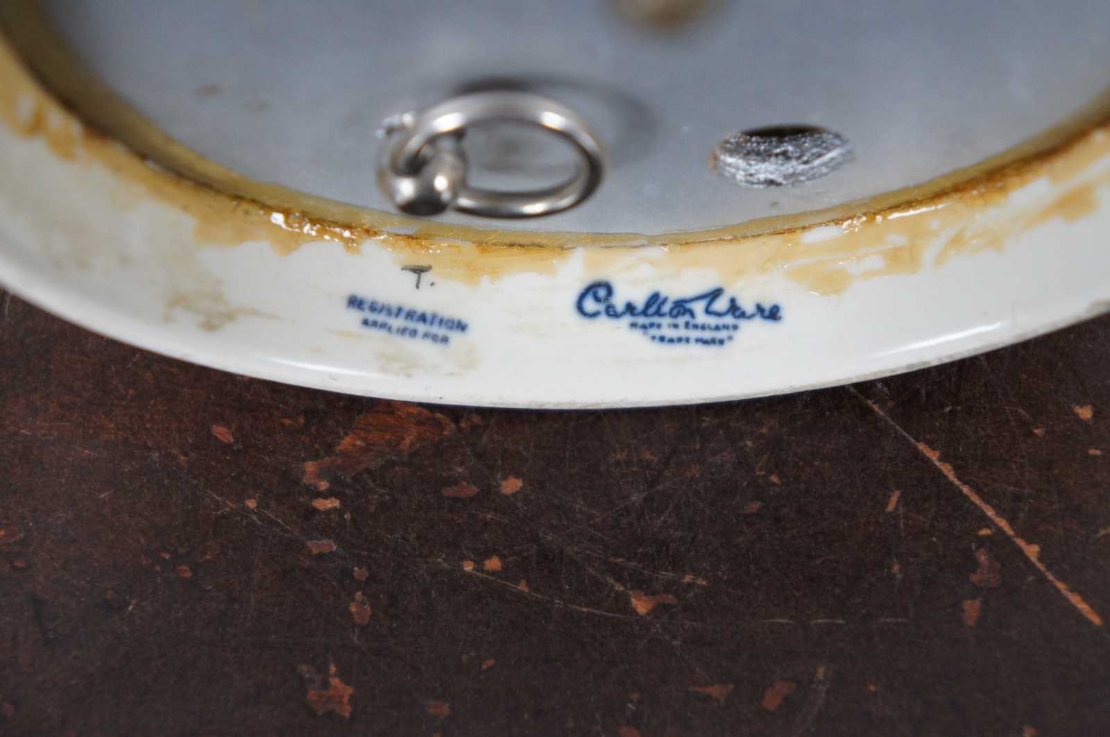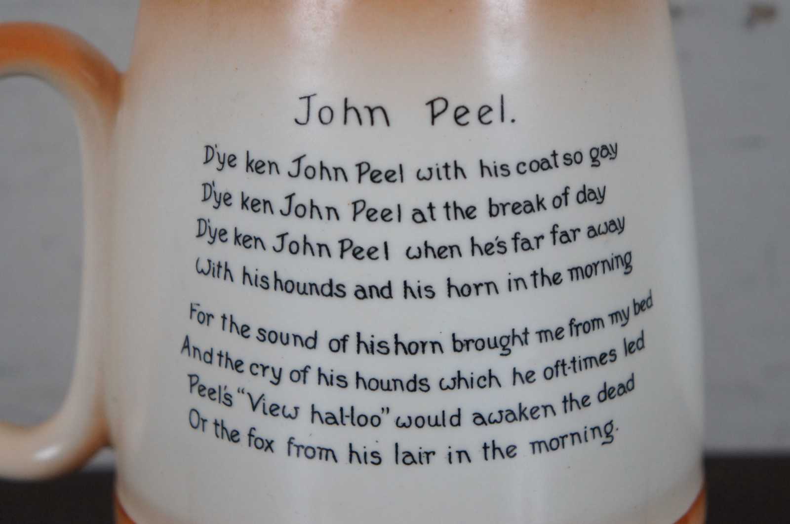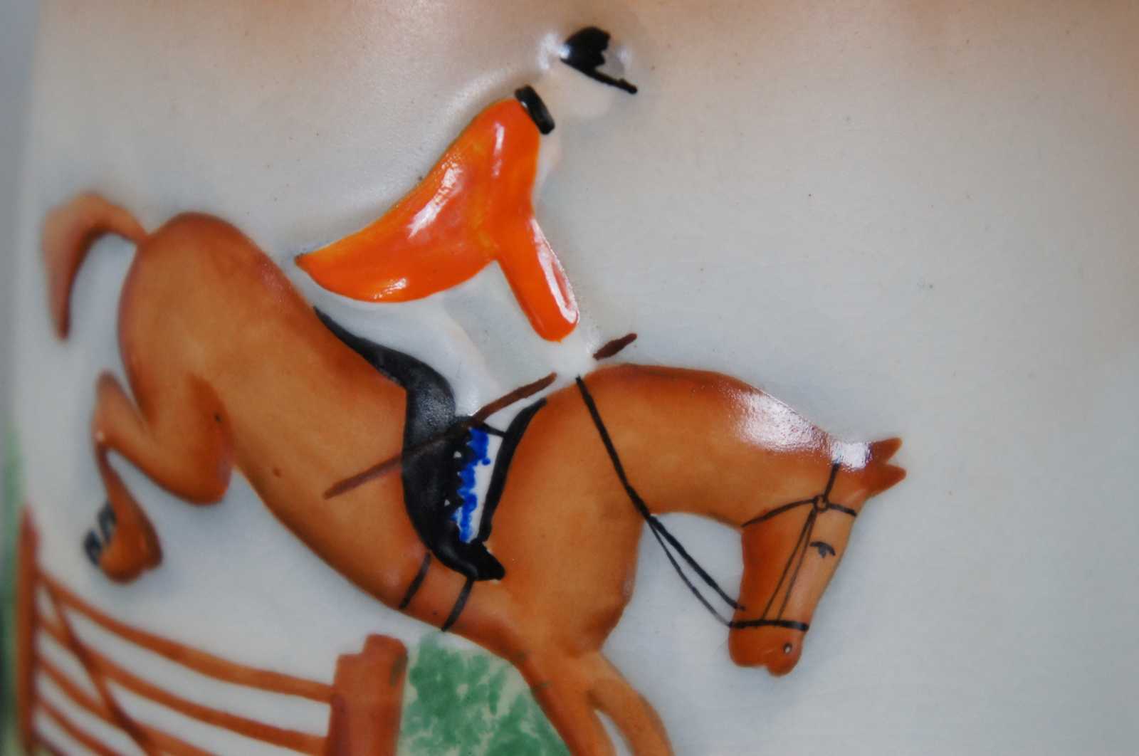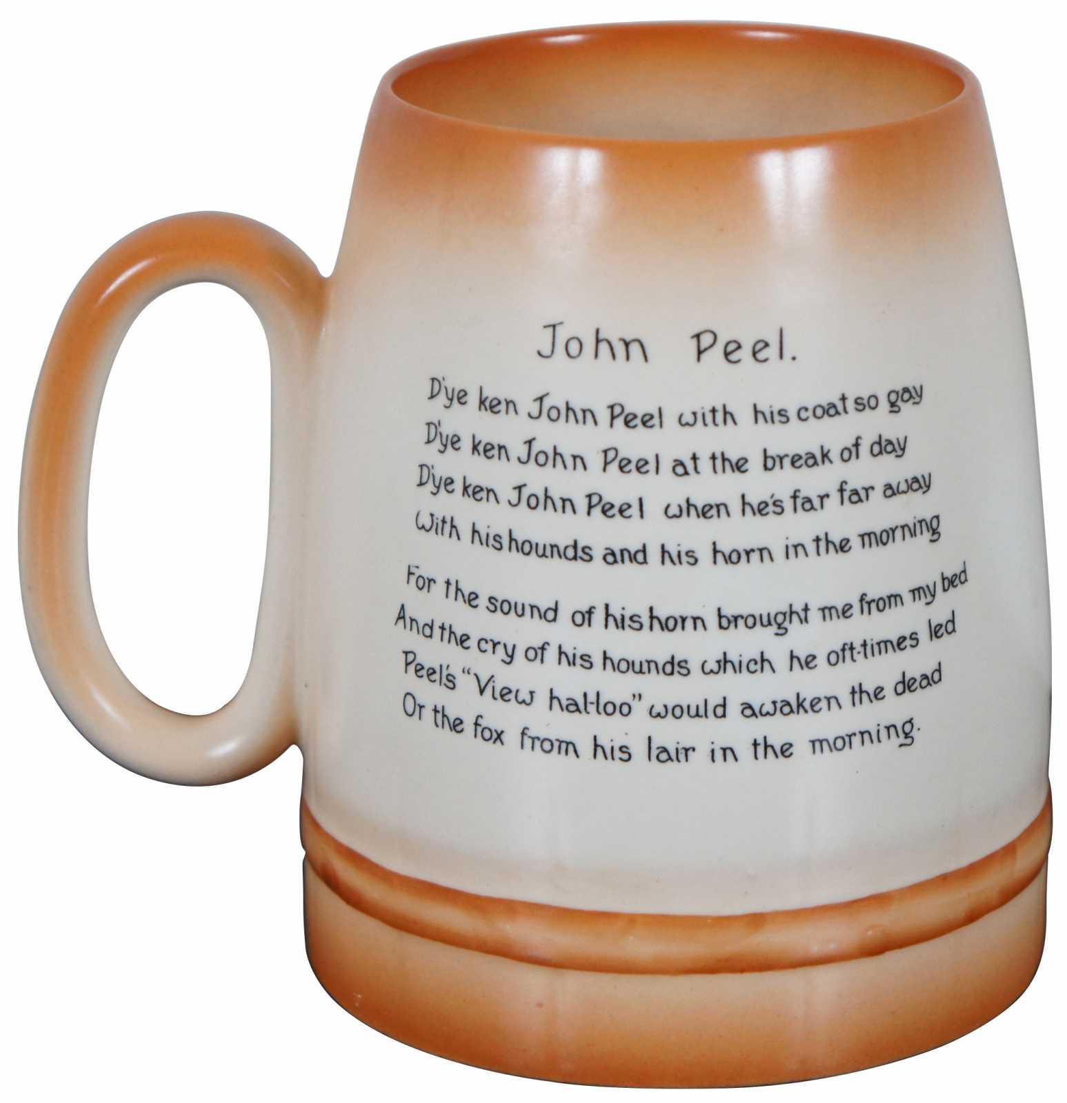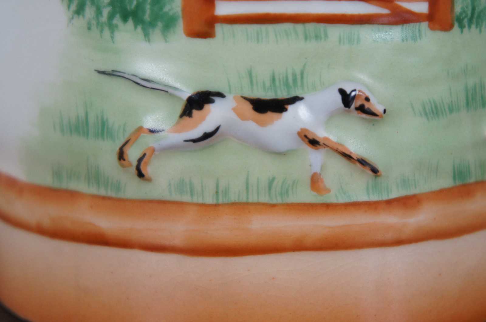 Vintage Carlton Ware English porcelain musical tankard featuring a fox hunt / equestiran scene with jumping horse and dogs and the lyrics for the folk song “D’ye Ken John Peel.” Working music box in base.