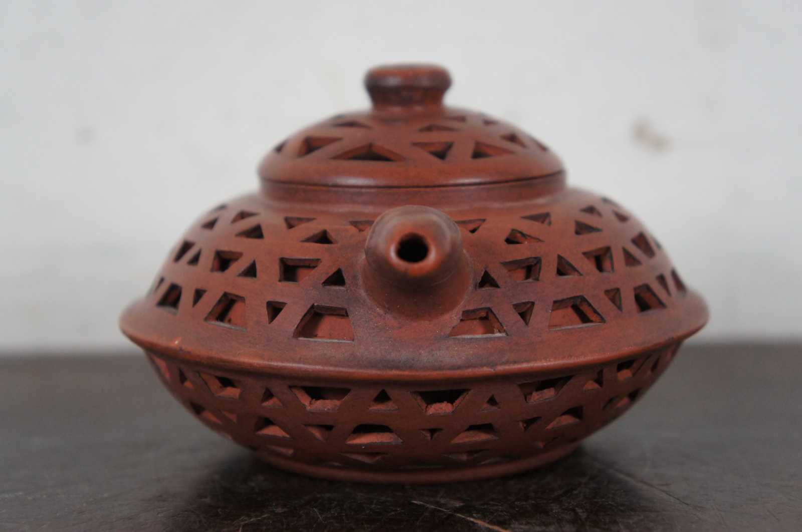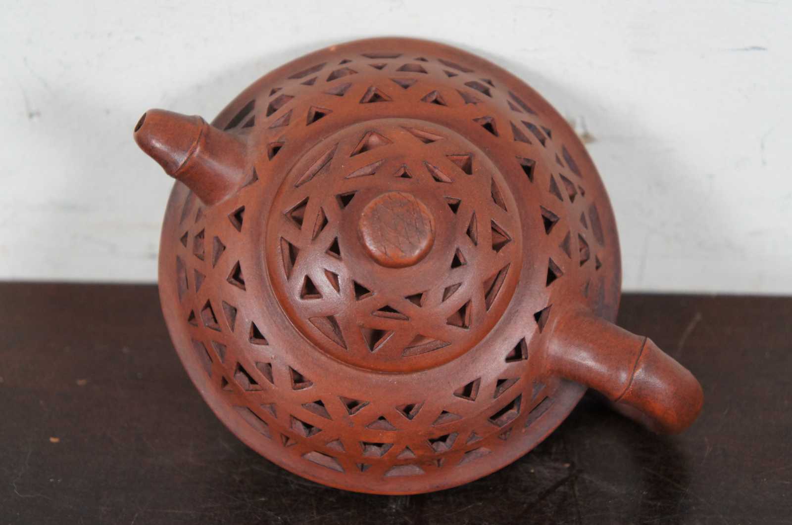 Vintage red yixing zisha Chinese ceramic teapot with faux bamboo handle and spout with a pierced double layered body. Marked on base and lid.