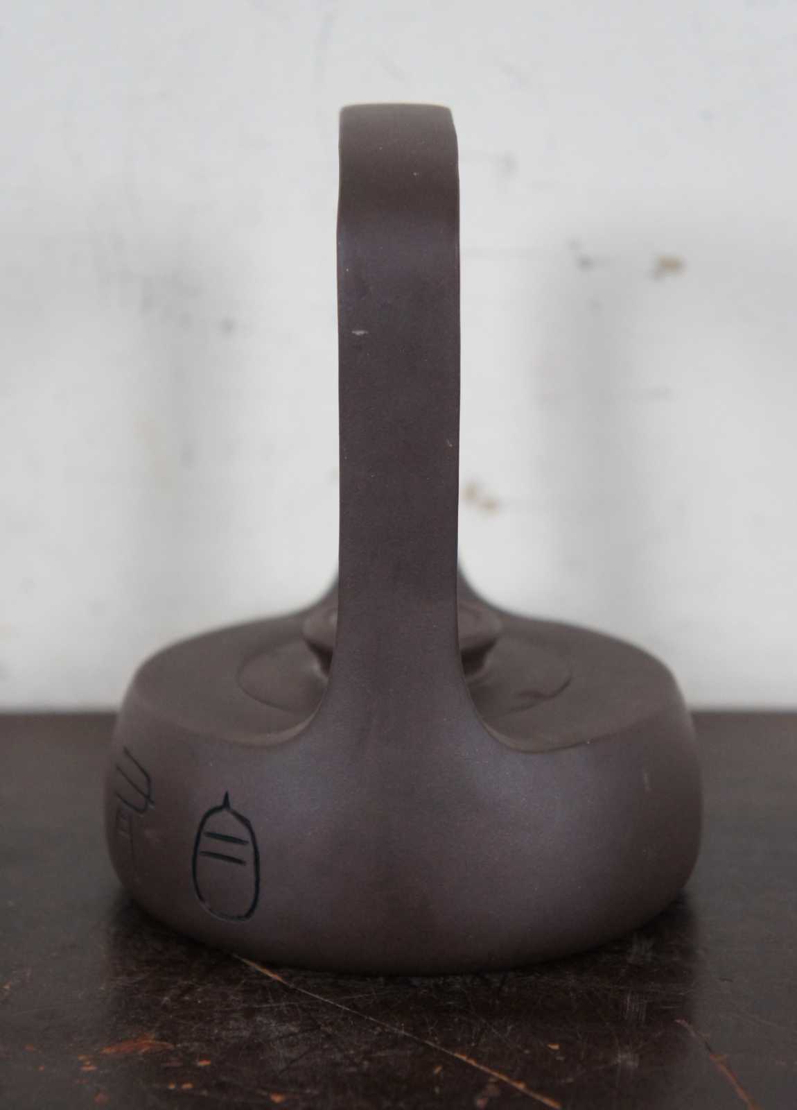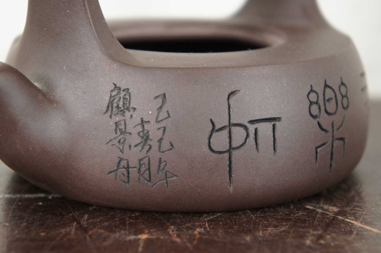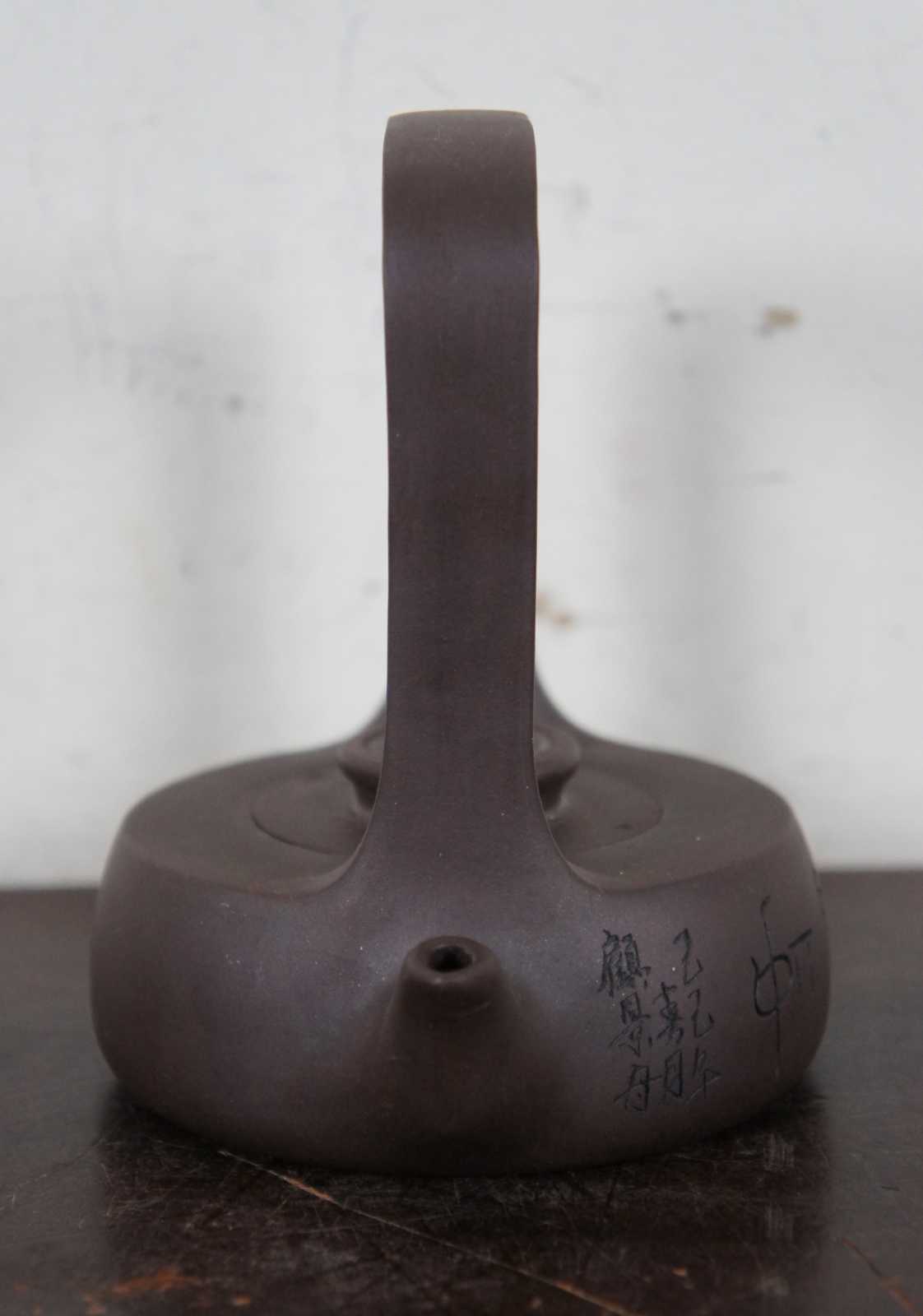 Vintage round brown yixing zisha Chinese ceramic teapot with tall handle and squat body, engraved with calligraphy. Marked on base and lid.