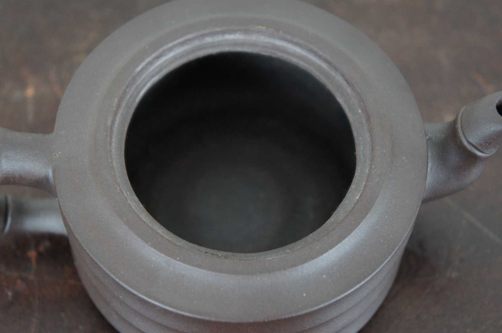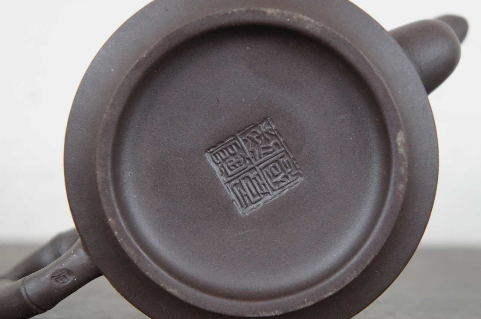 Vintage dark brown yixing zisha Chinese ceramic teapot with grooved sides and bamboo shaped spout and handle. Marked in various spots.