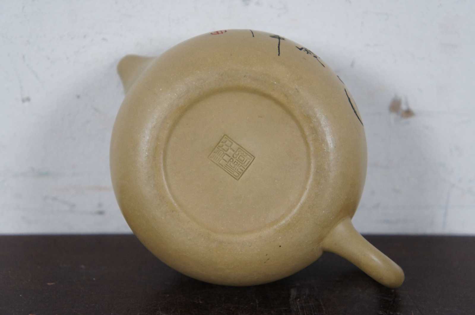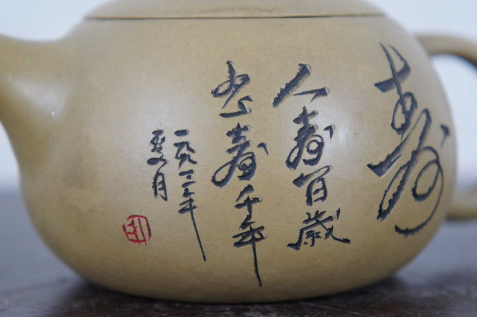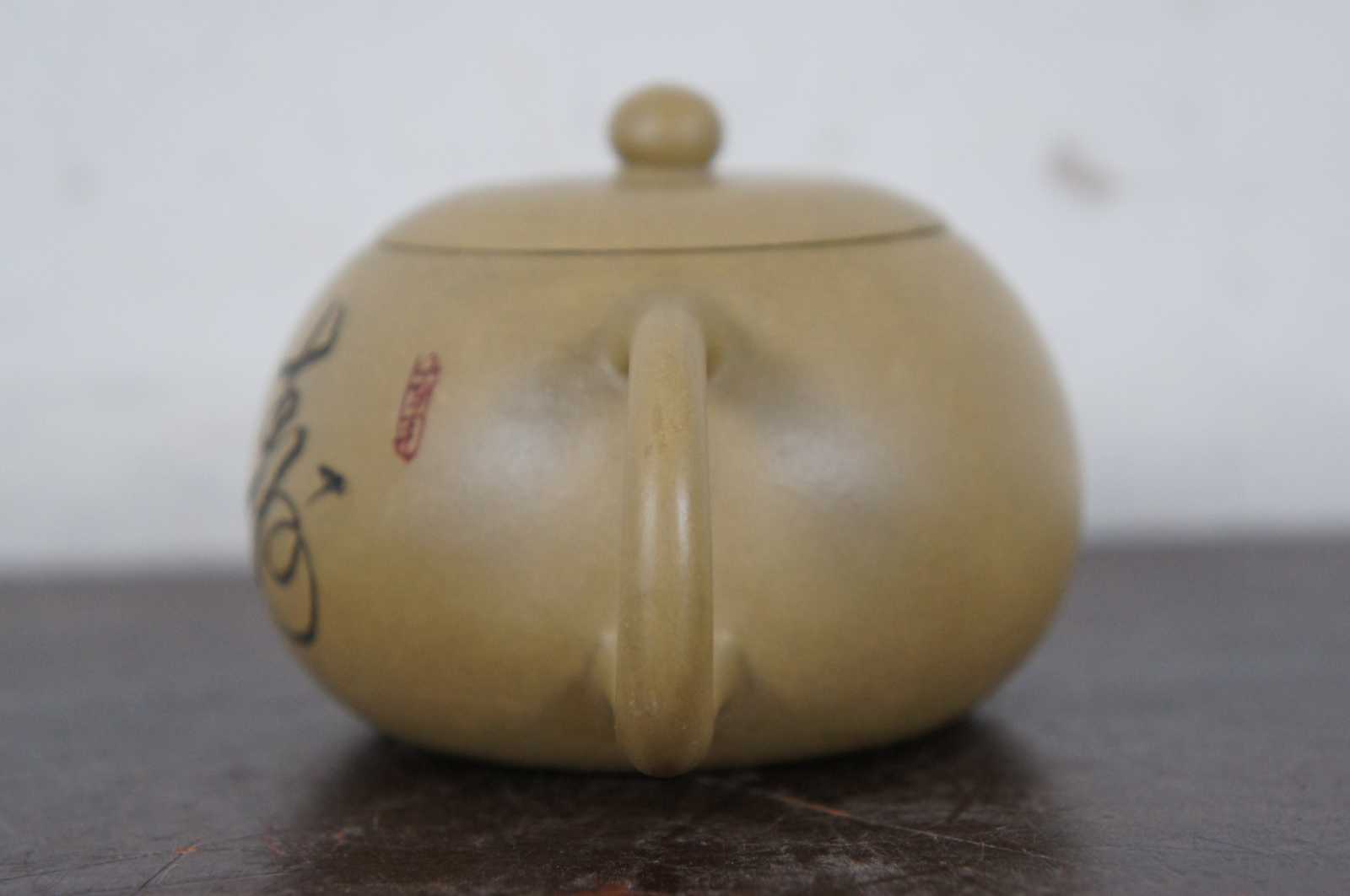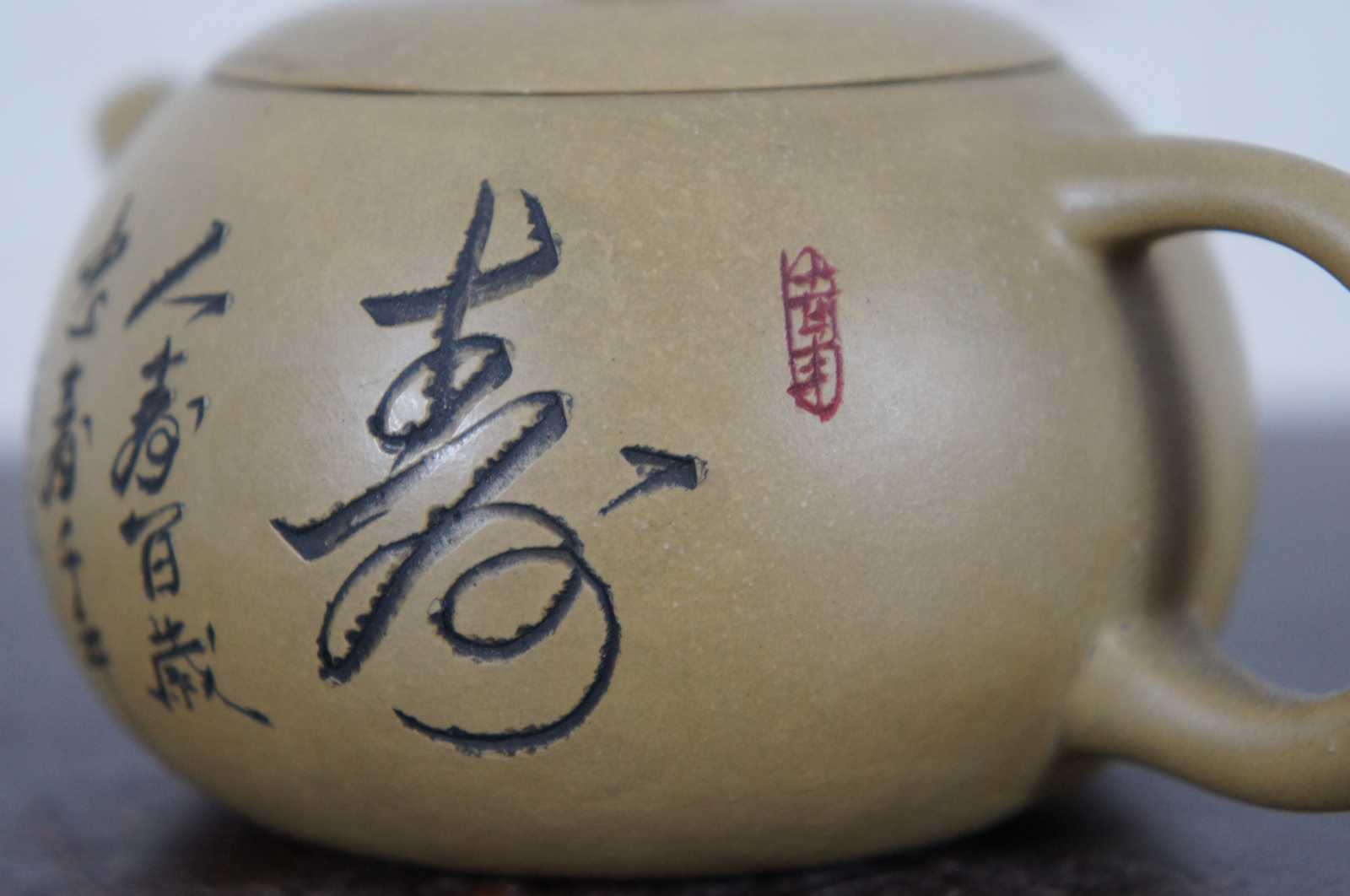 Vintage round yellow yixing zisha Chinese ceramic teapot decorated with engraved calligraphy. Marked on base.