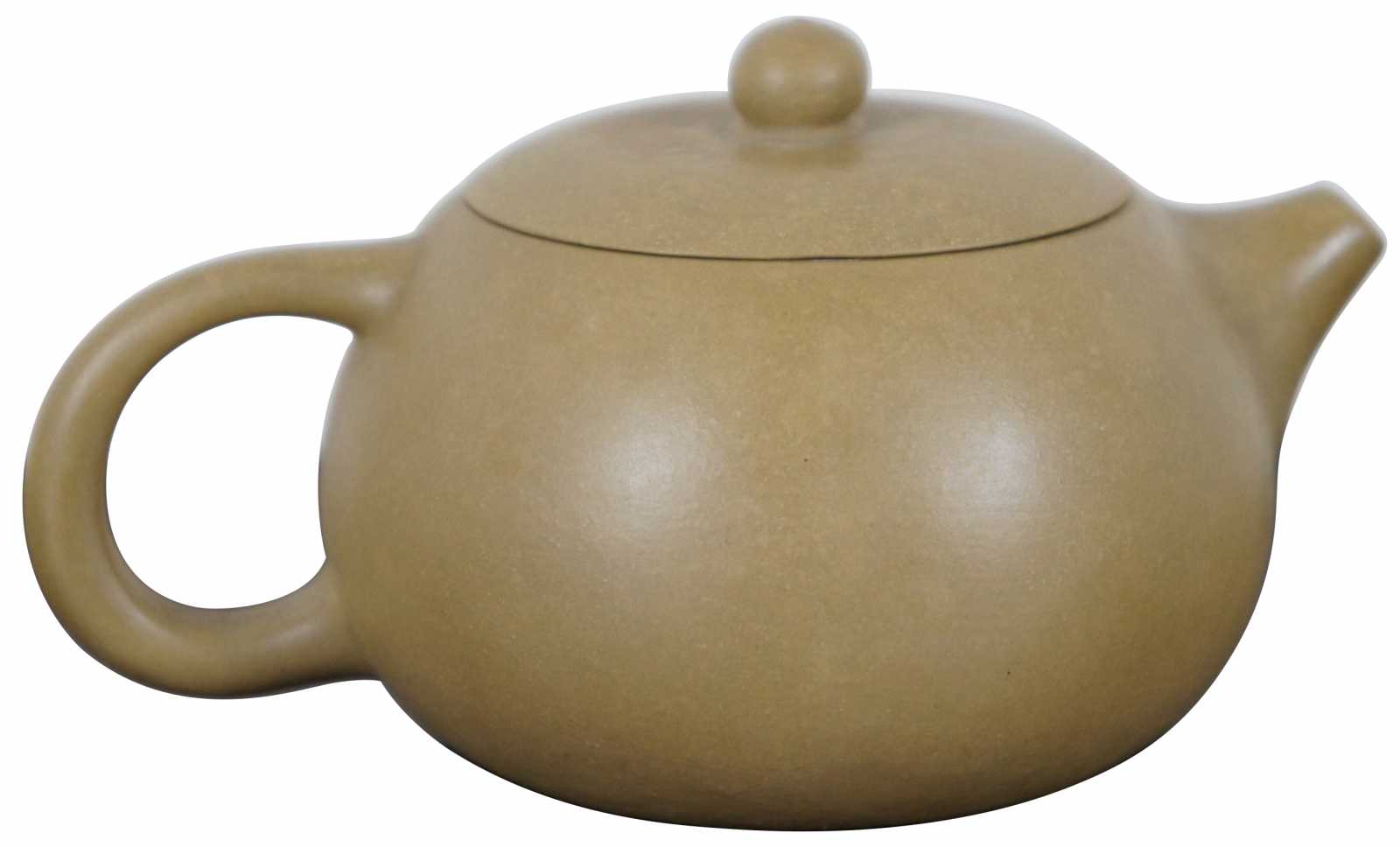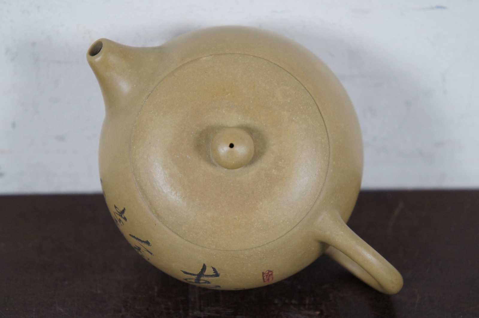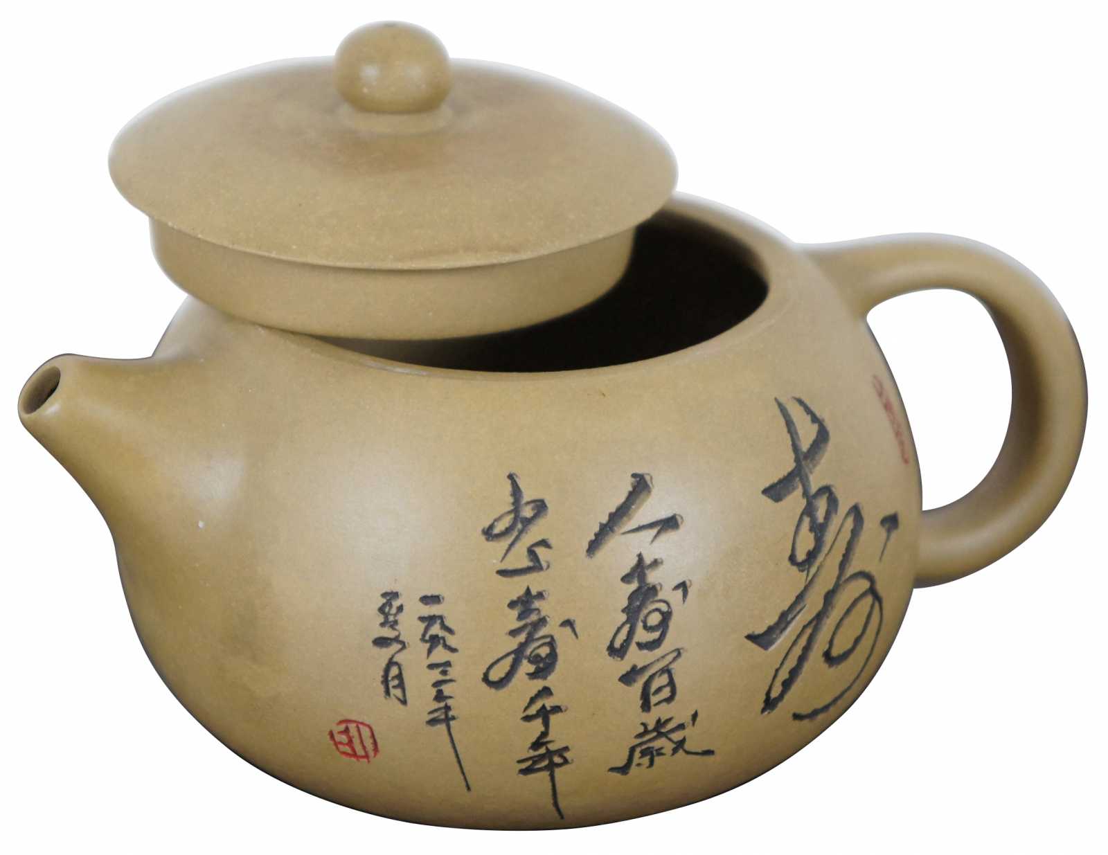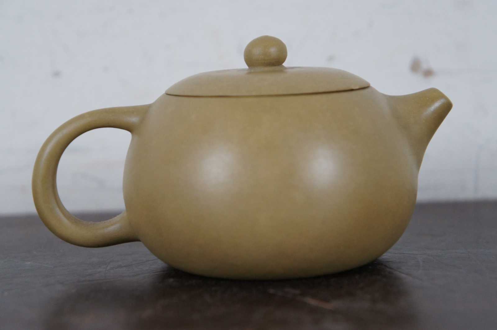 Vintage round yellow yixing zisha Chinese ceramic teapot decorated with engraved calligraphy. Marked on base.
