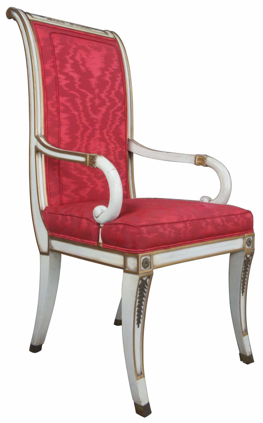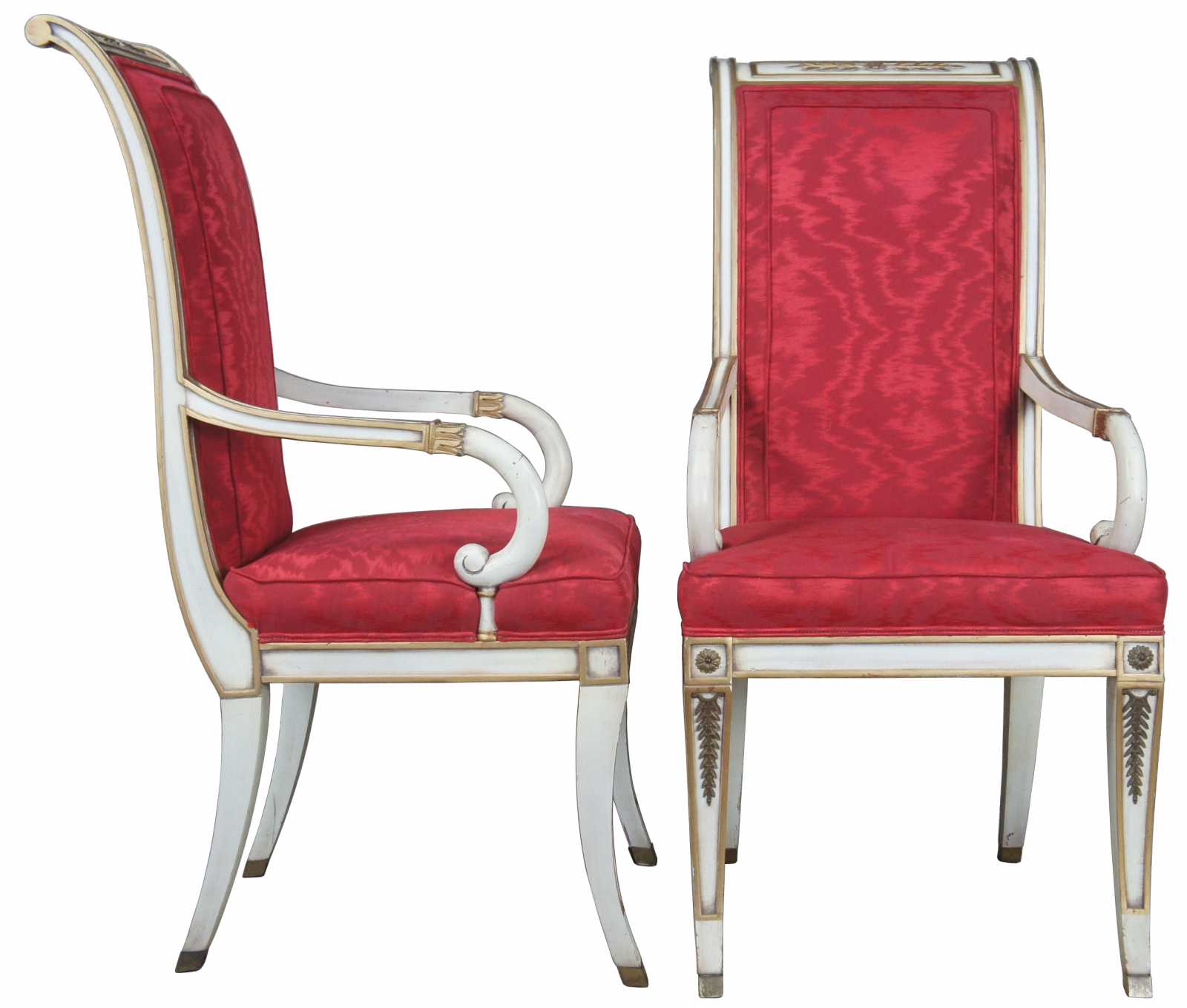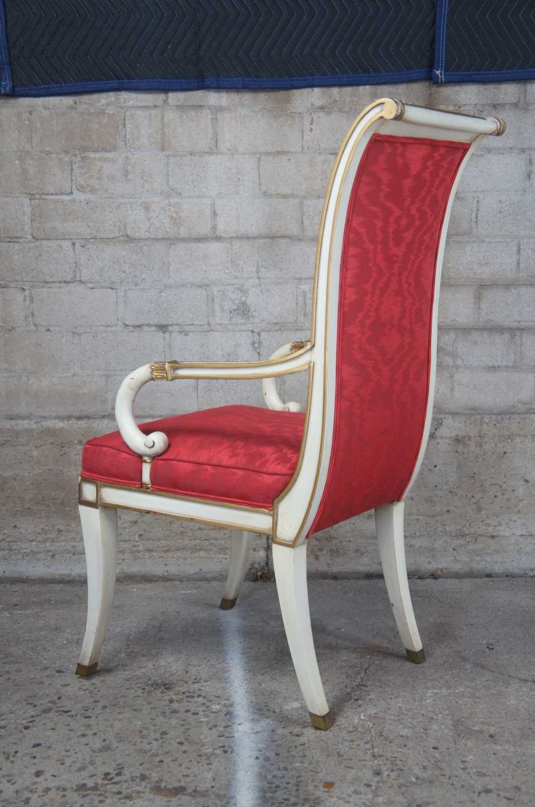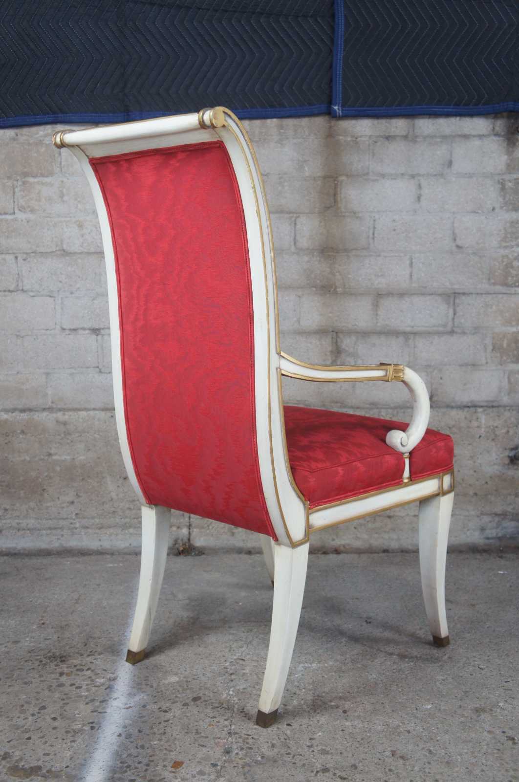 Two vintage Karges French Empire dining arm or accent chairs. Painted white with gold carved accents, scrolled arms, brass plates, saber legs and red upholstery.