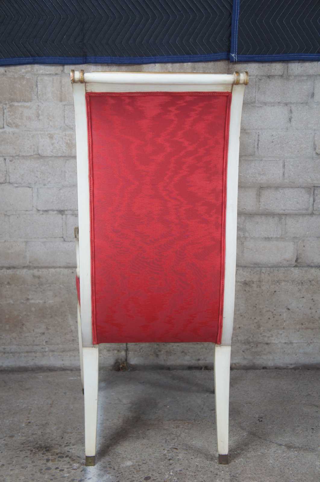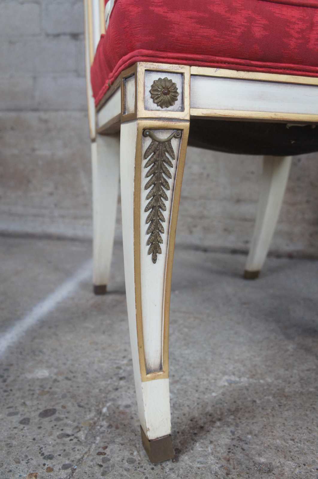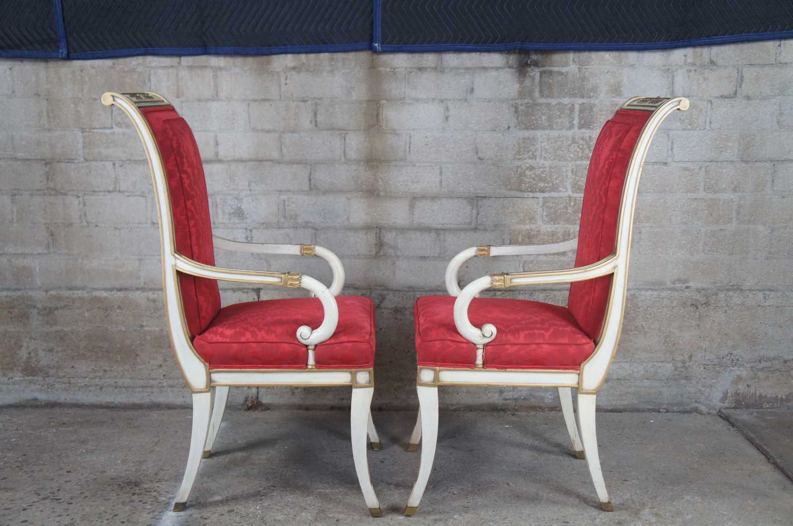 Two vintage Karges French Empire dining arm or accent chairs. Painted white with gold carved accents, scrolled arms, brass plates, saber legs and red upholstery.