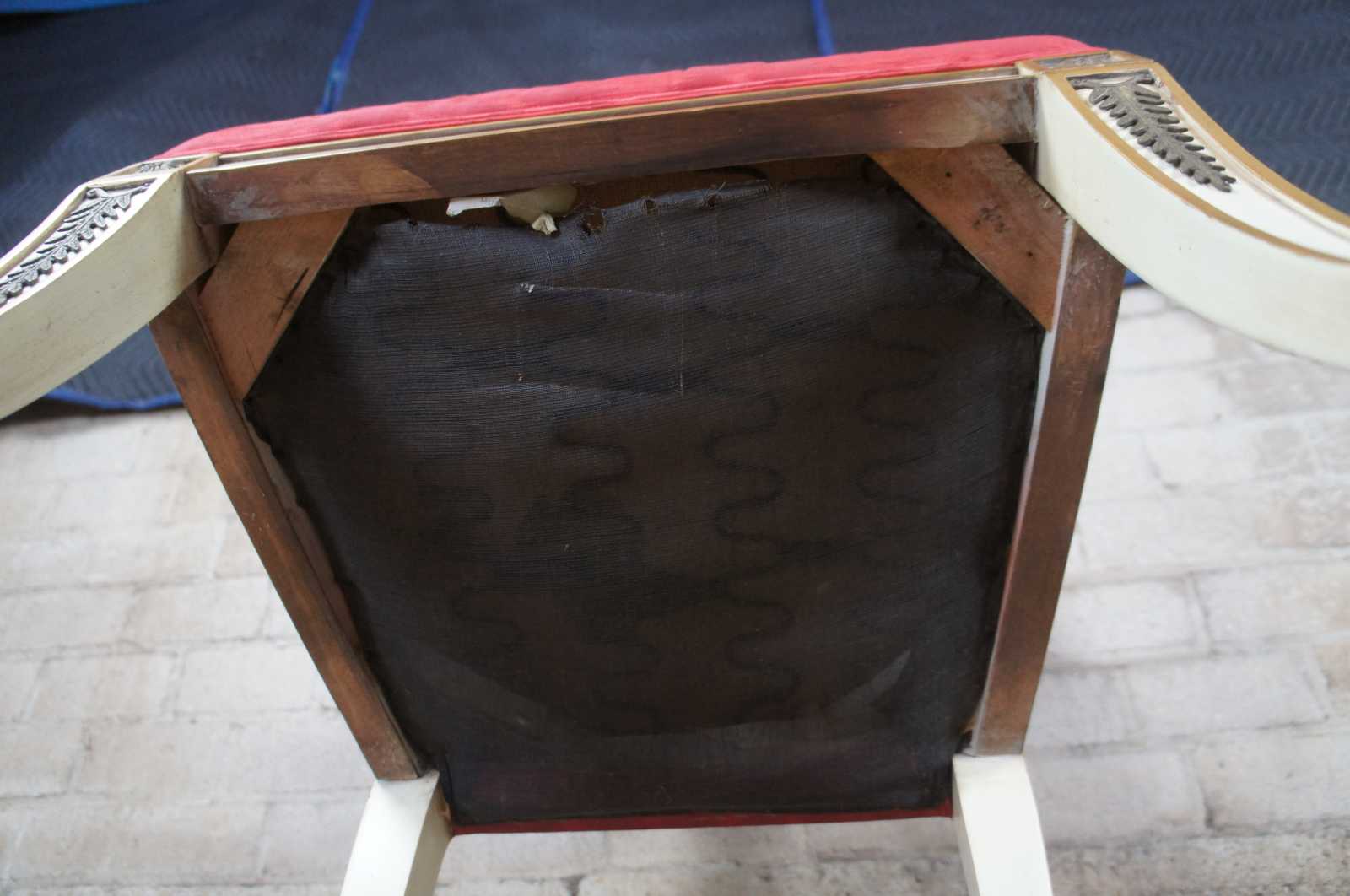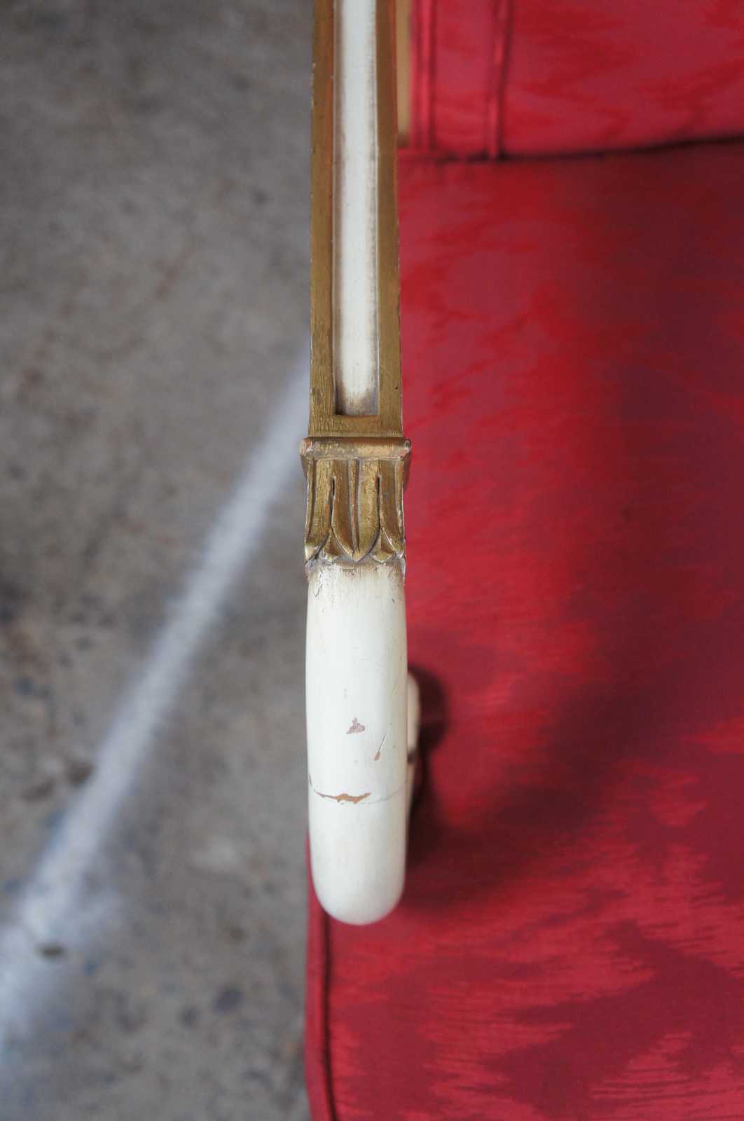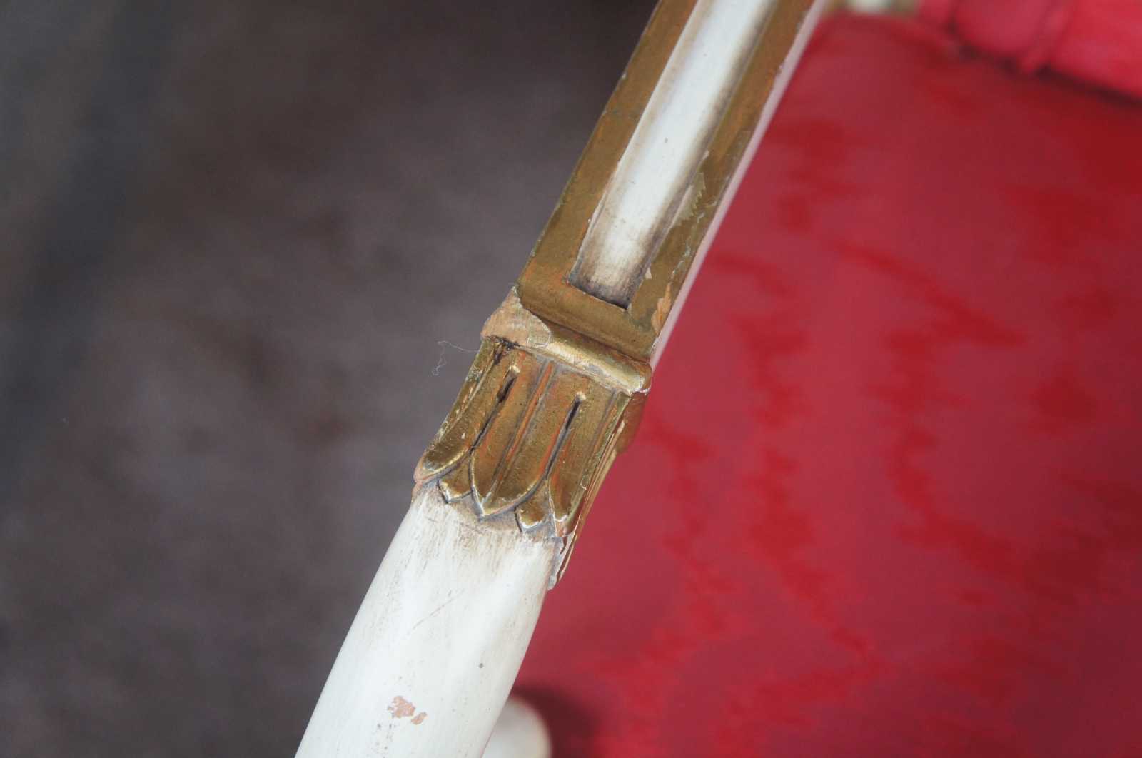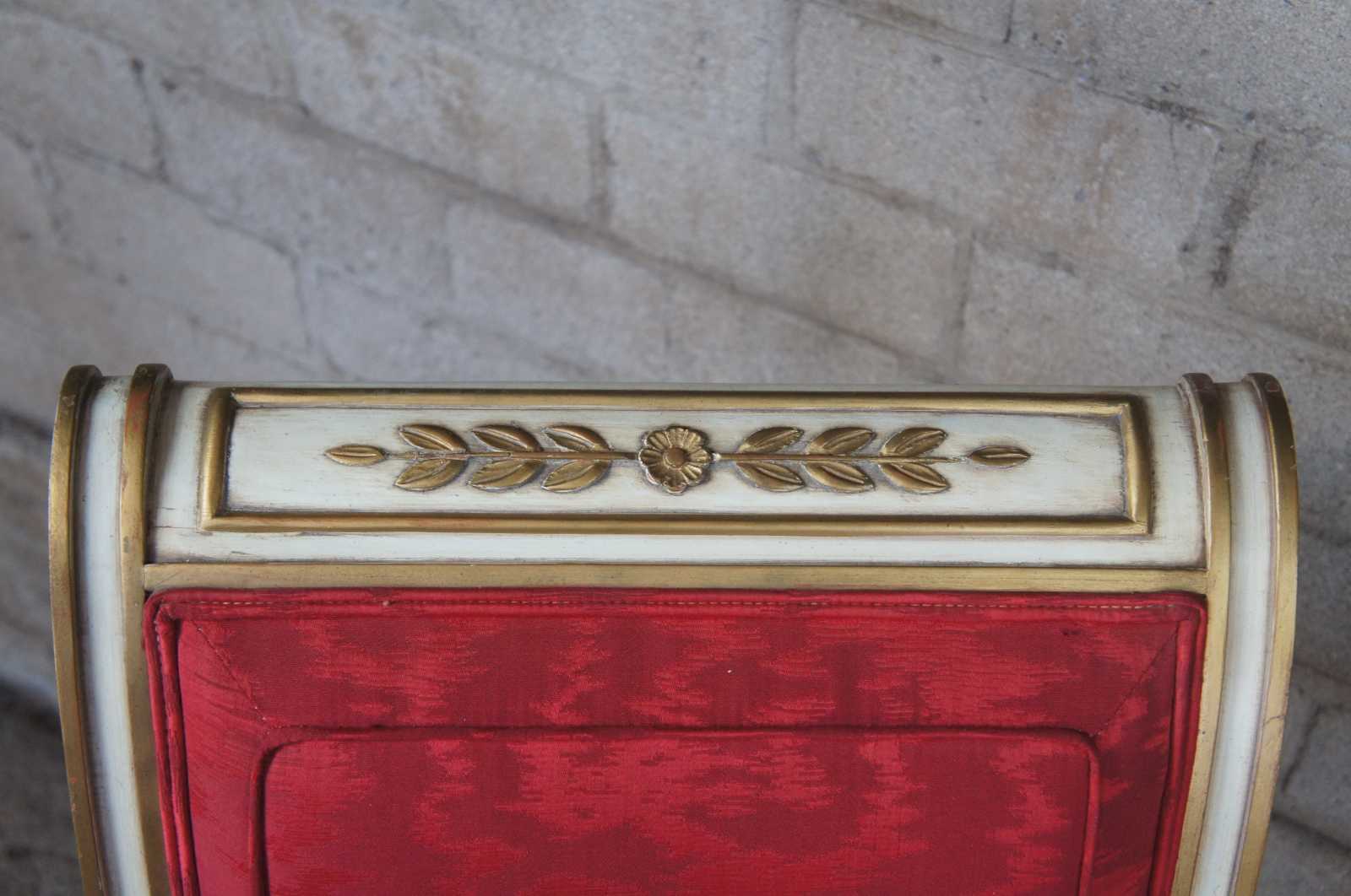 Two vintage Karges French Empire dining arm or accent chairs. Painted white with gold carved accents, scrolled arms, brass plates, saber legs and red upholstery.