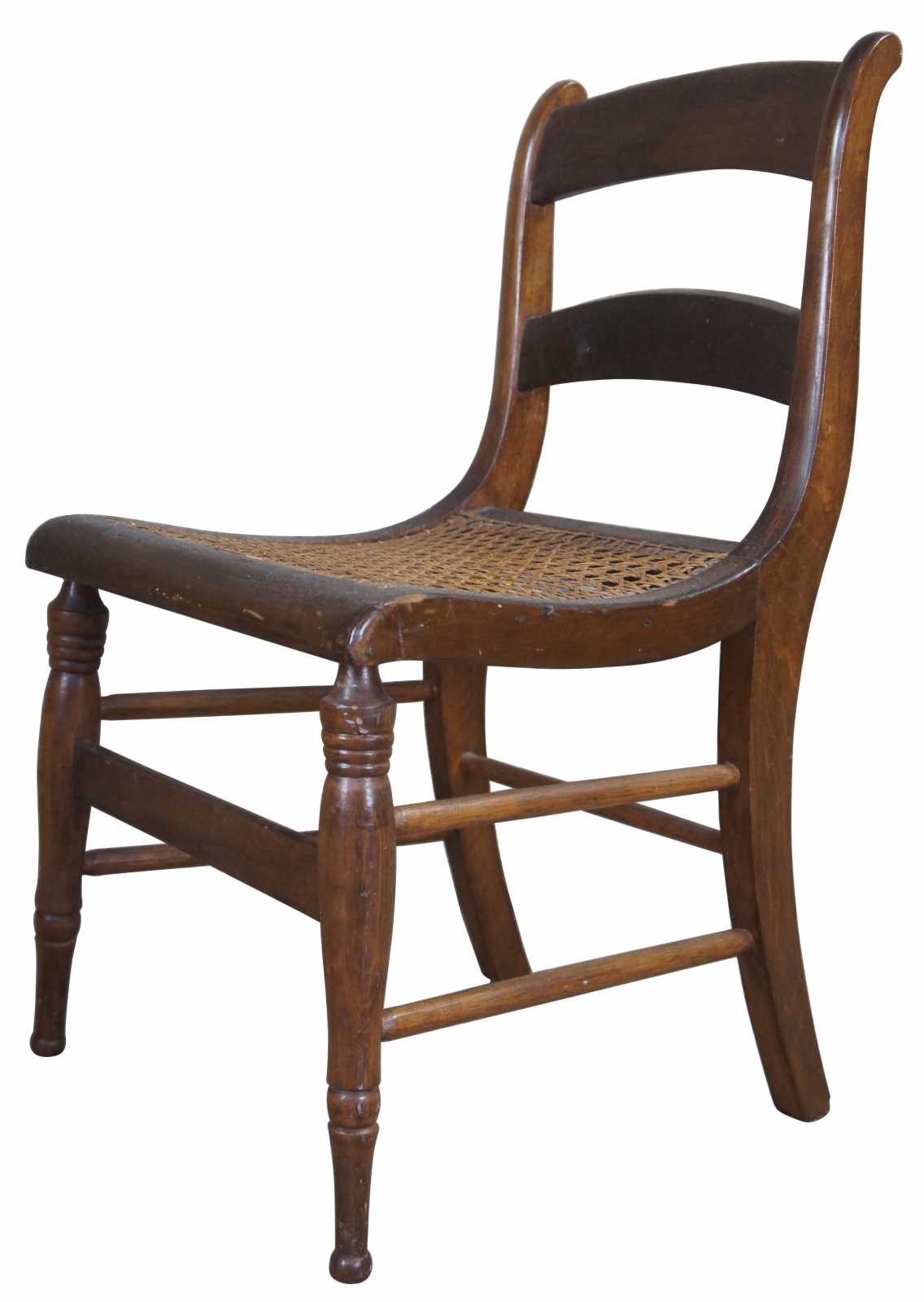 Antique side dining or accent chair. Made of pine with caned seat and turned from legs.