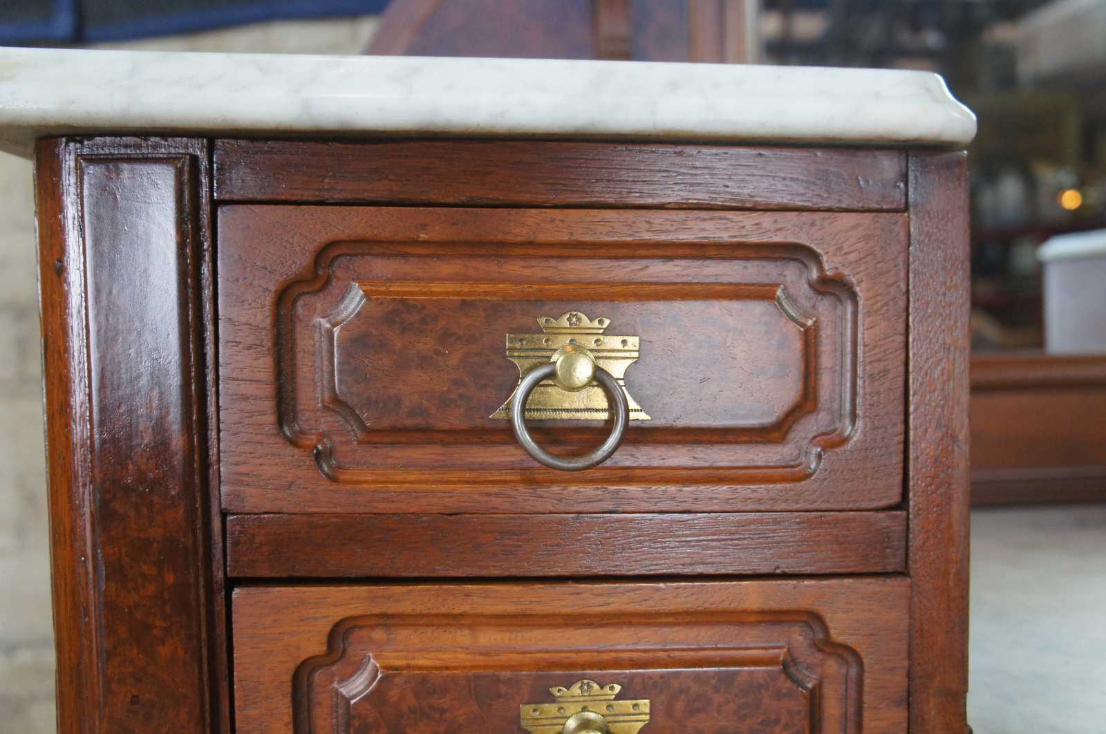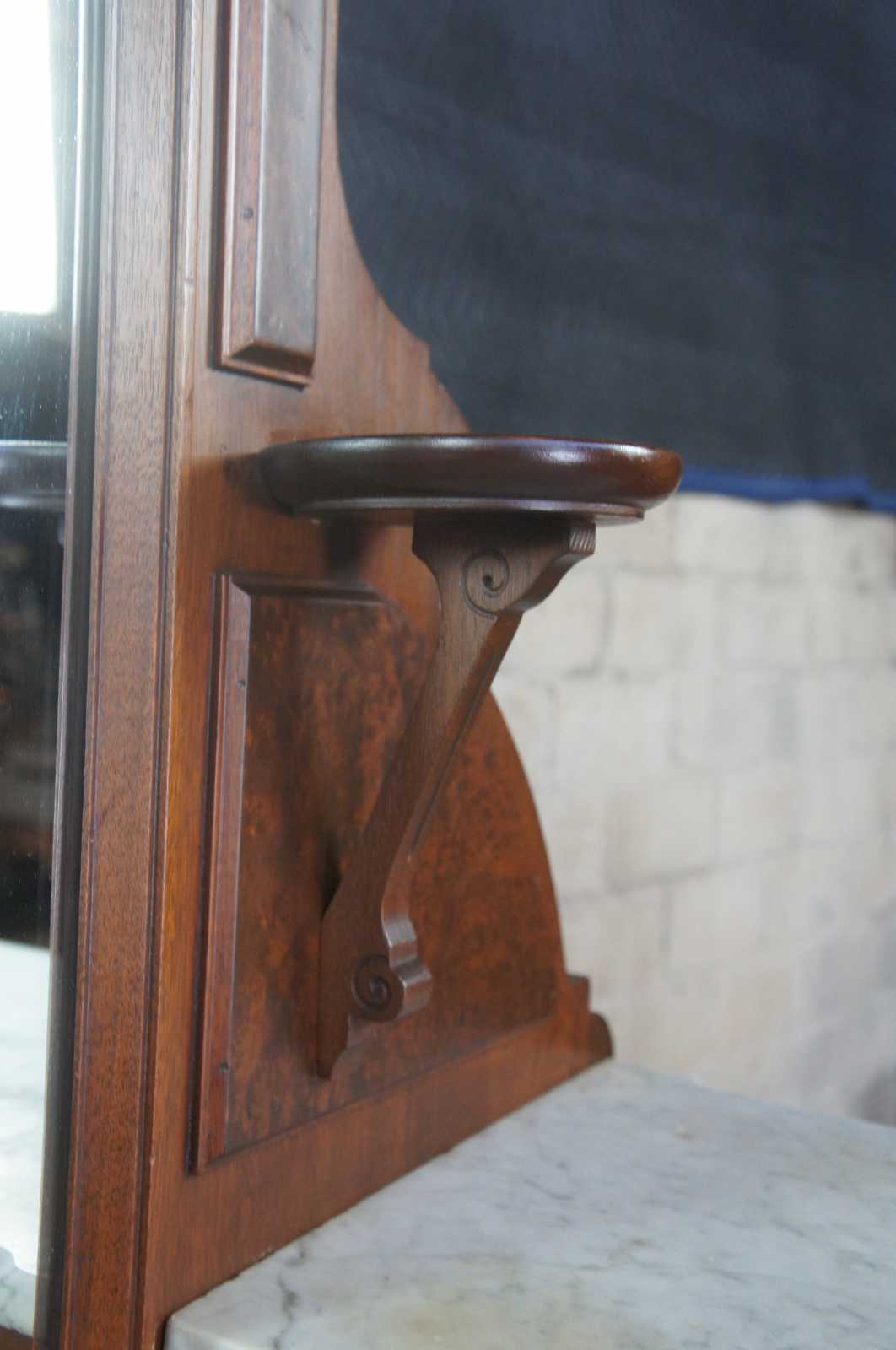 Antique Victorian Eastlake gentleman's dresser or vanity. Made of walnut featuring carved burl panels and ornate fluted and turned accents. The dresser has two candle or shaving stands, three marble tops, four small drawers and two larger, all accented with brass ring pulls and constructed with mortis and tendon joints.