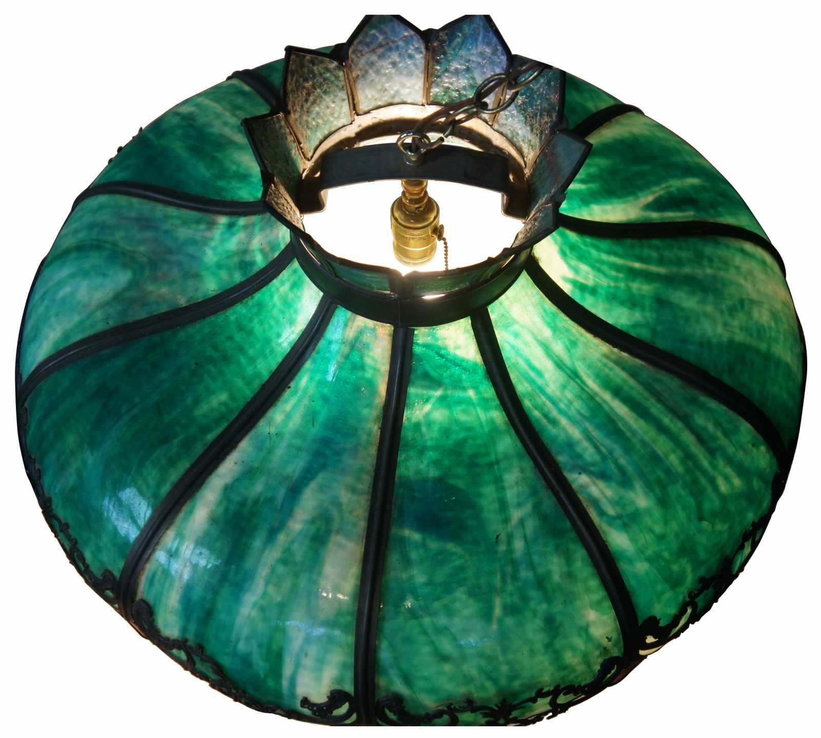 Antique Victorian slag glass swag light or chandelier. Made with an iron and metal frame with scrolled accents over dramatic green slag glass accented with ruby red diamond tips.
