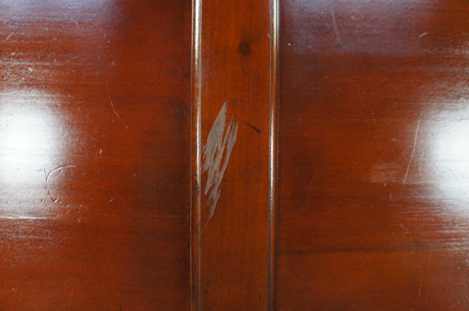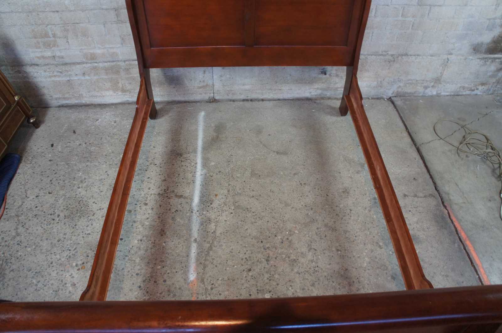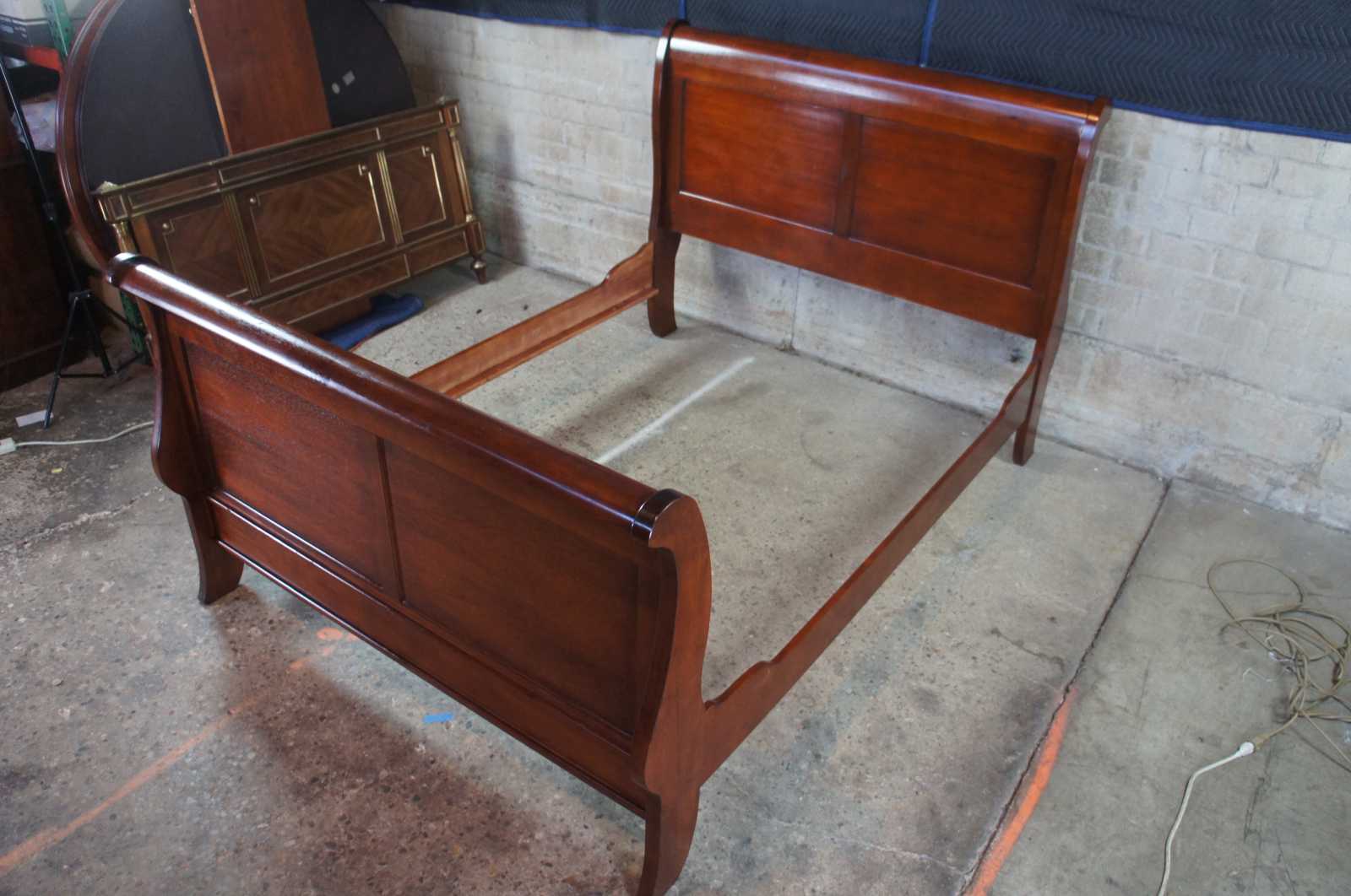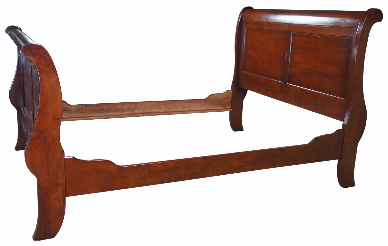Vintage queen sized sleigh bed featuring paneled head and foot boards with serpentine shape and flared feet. Made of birch with a mahogany finish.
