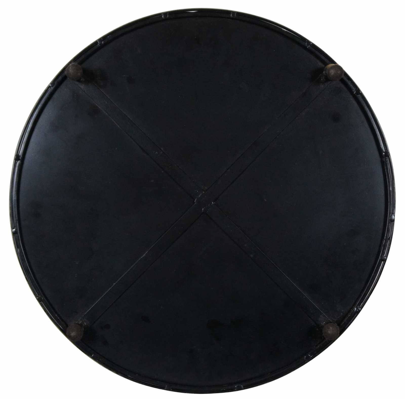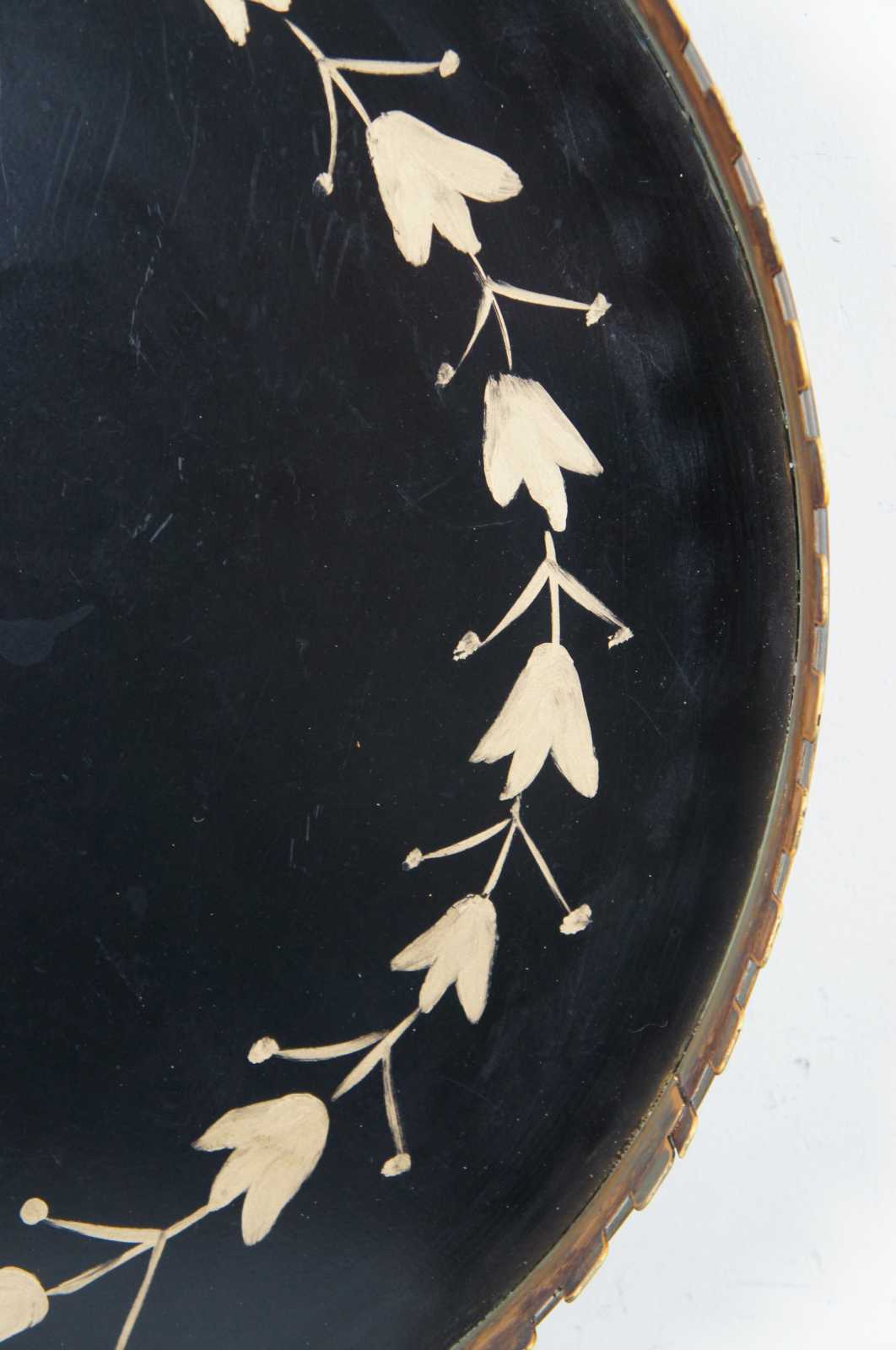 Vintage round black toleware tray with ball feet, crenelated / notched gallery edge and painted with a wreath of golden flowers.