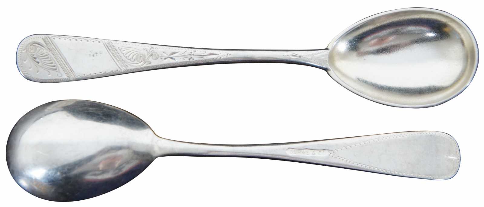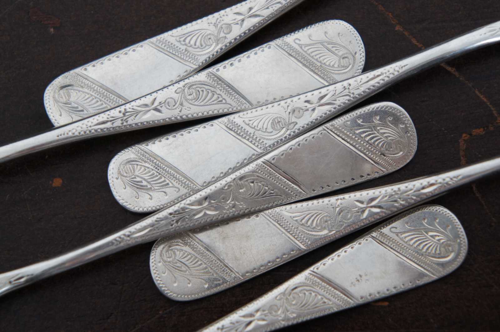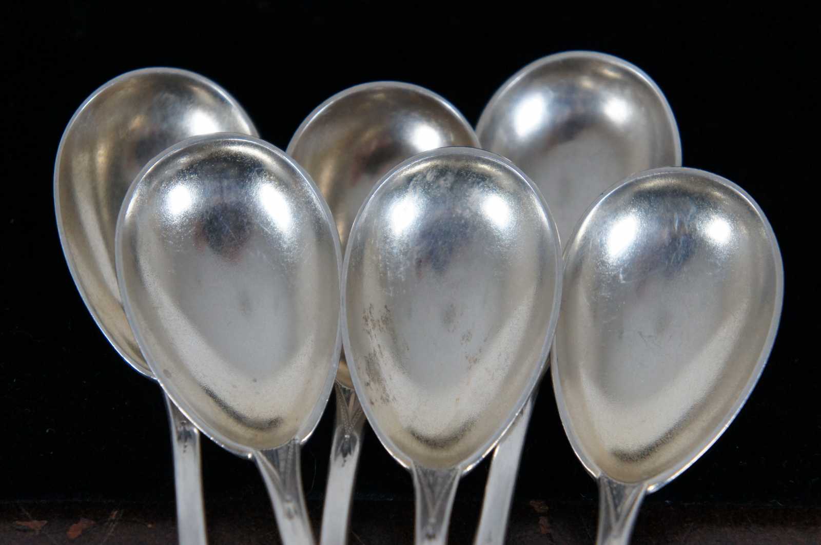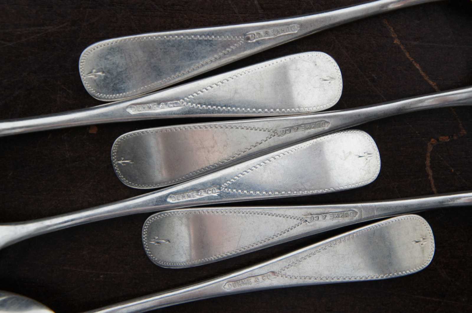 Set of six vintage Duhme & Co silver plate demitasse coffee spoons with lovely etched handles.