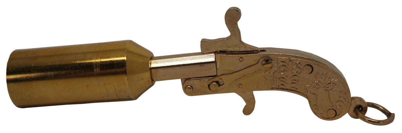 Vintage miniature Austrian Berloque style pin fire cap gun in the shape of an antique dueling pistol engraved with a deer and rabbit, with additional screw on oversize barrel and a small ring on the end for use as a key chain or watch fob. Includes two boxes of Xythos blank cartridges.
