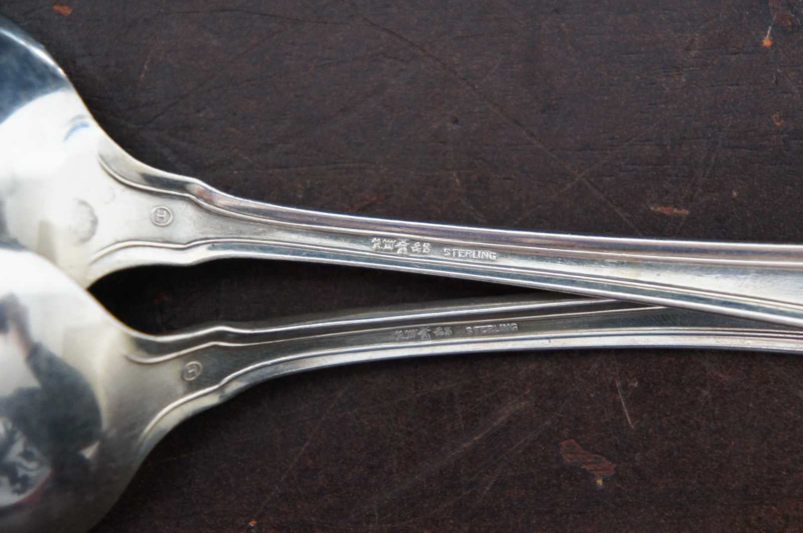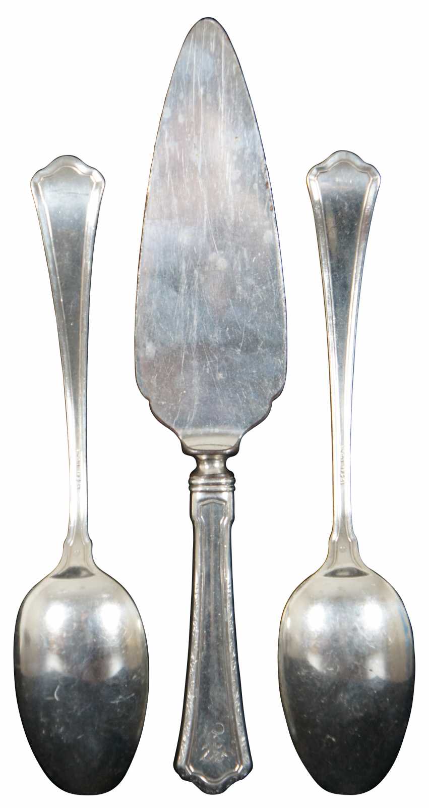 Sterling silver cake server and two serving spoons by RW&S Wallace, with an etched leaf design around the edges and monogrammed with an F.
