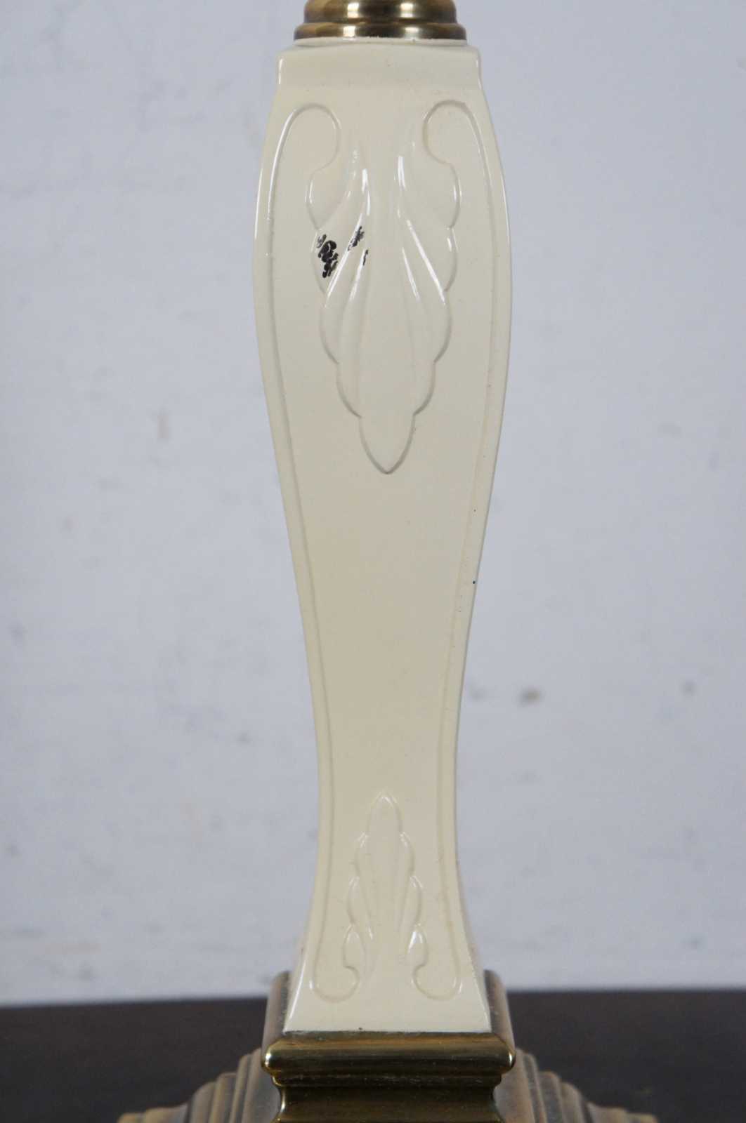 Ethan Aleen candlestick shaped lamp with brass top and base and a tapered white enameled ceramic body with leaf accents.