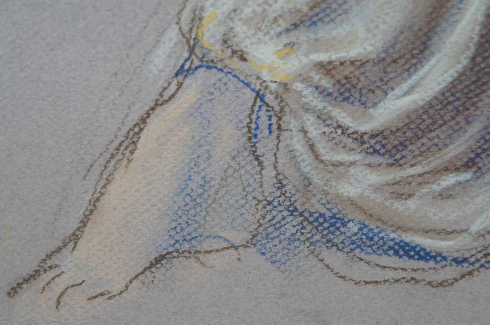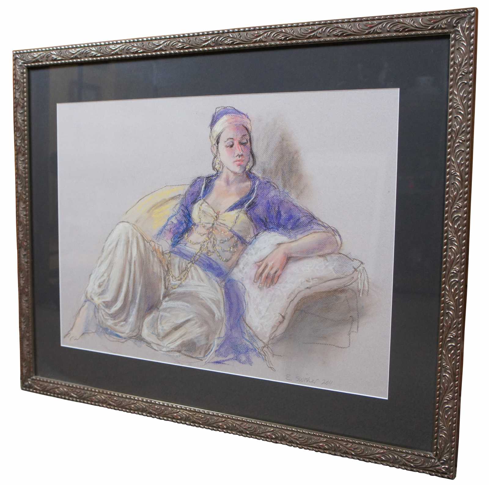 Pastel drawing of a female figure dressed in purple and gold, reclining on pillows; pencil signed E. Swisher 2011.