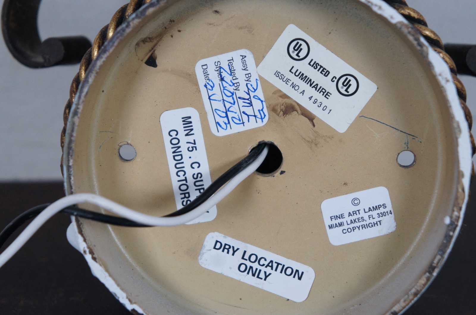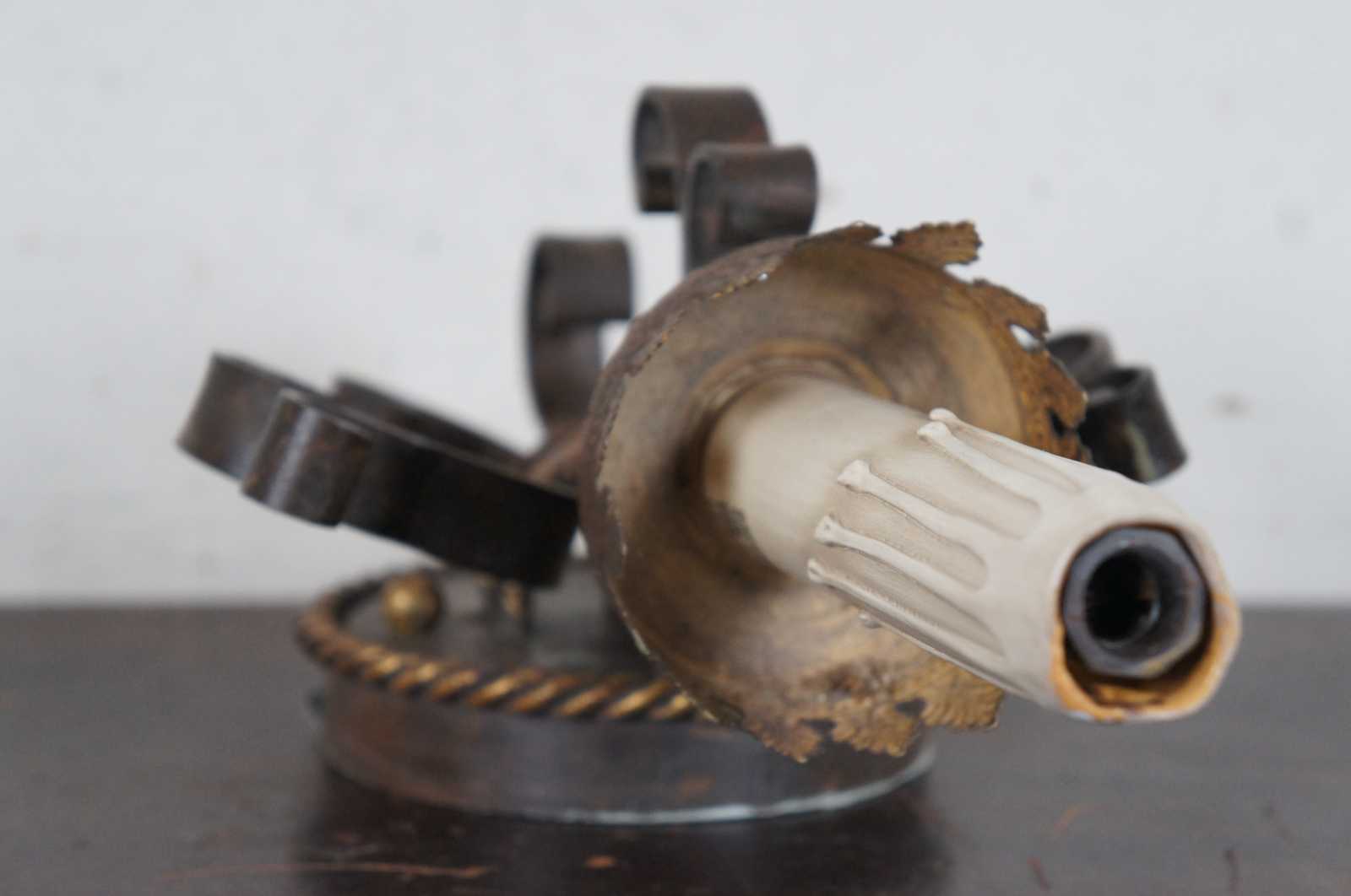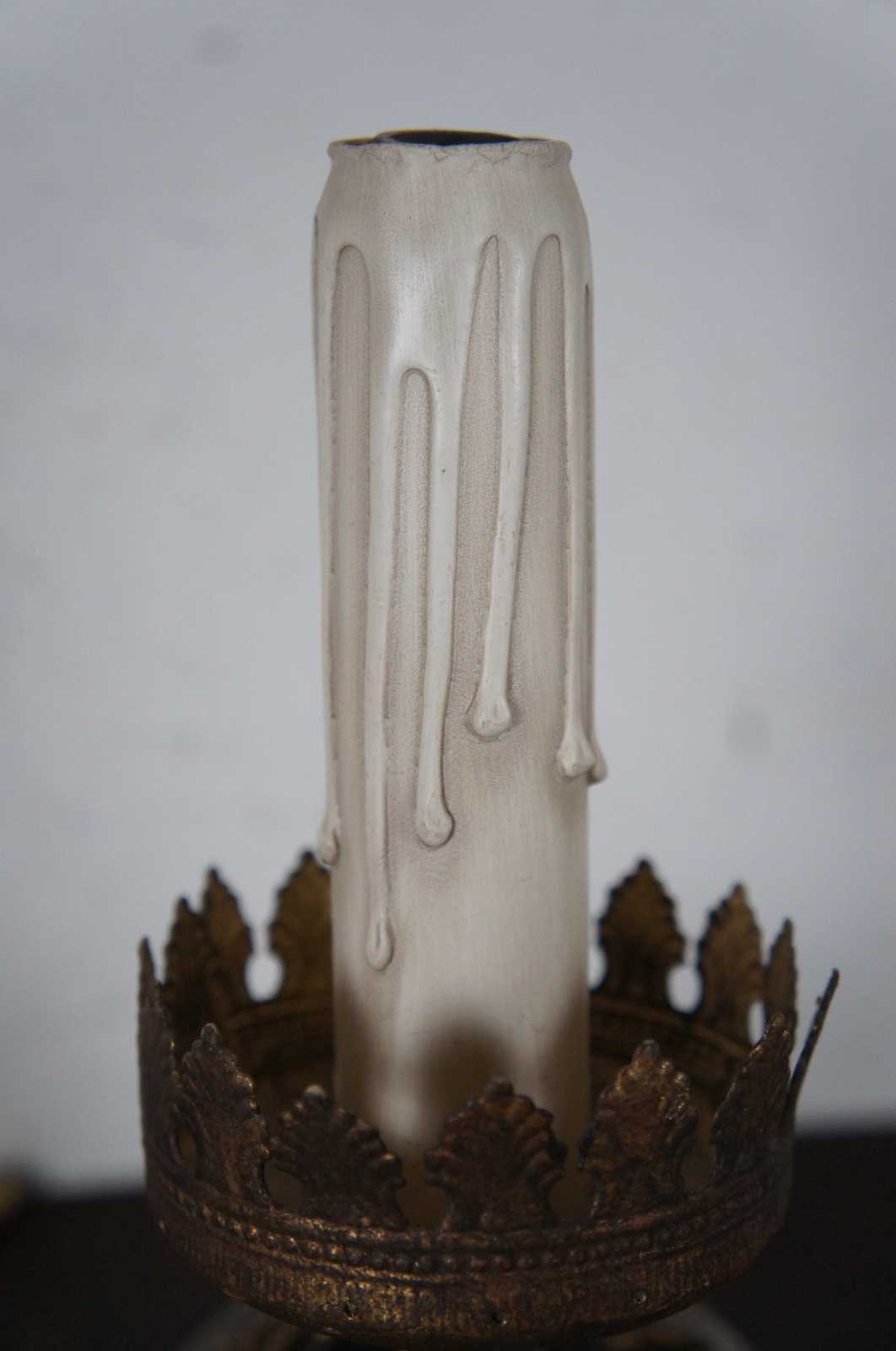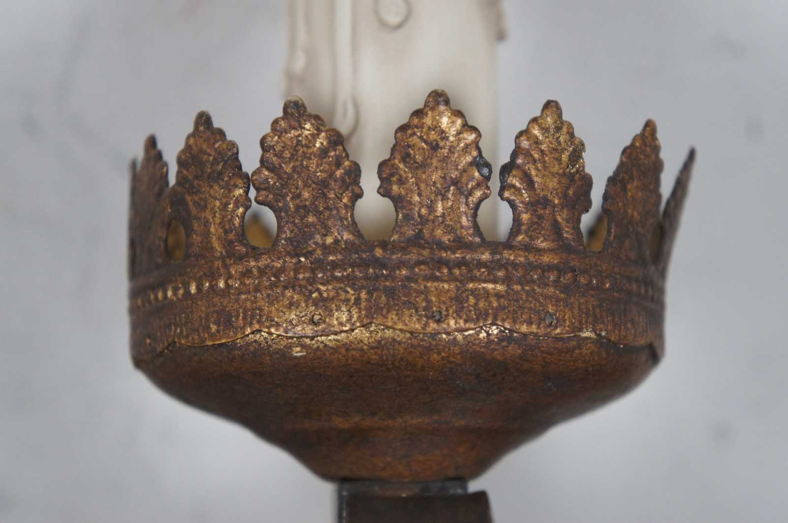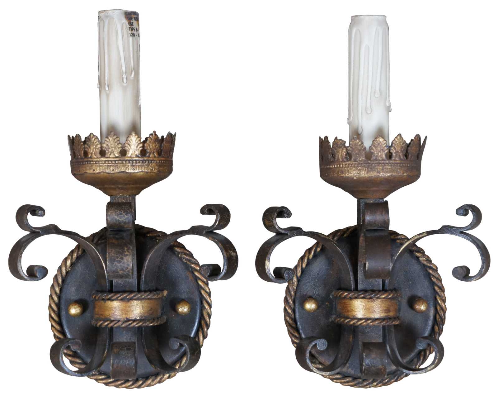 Pair of gilded and antiqued bronze Spanish Revival candlestick wall sconces with shades.