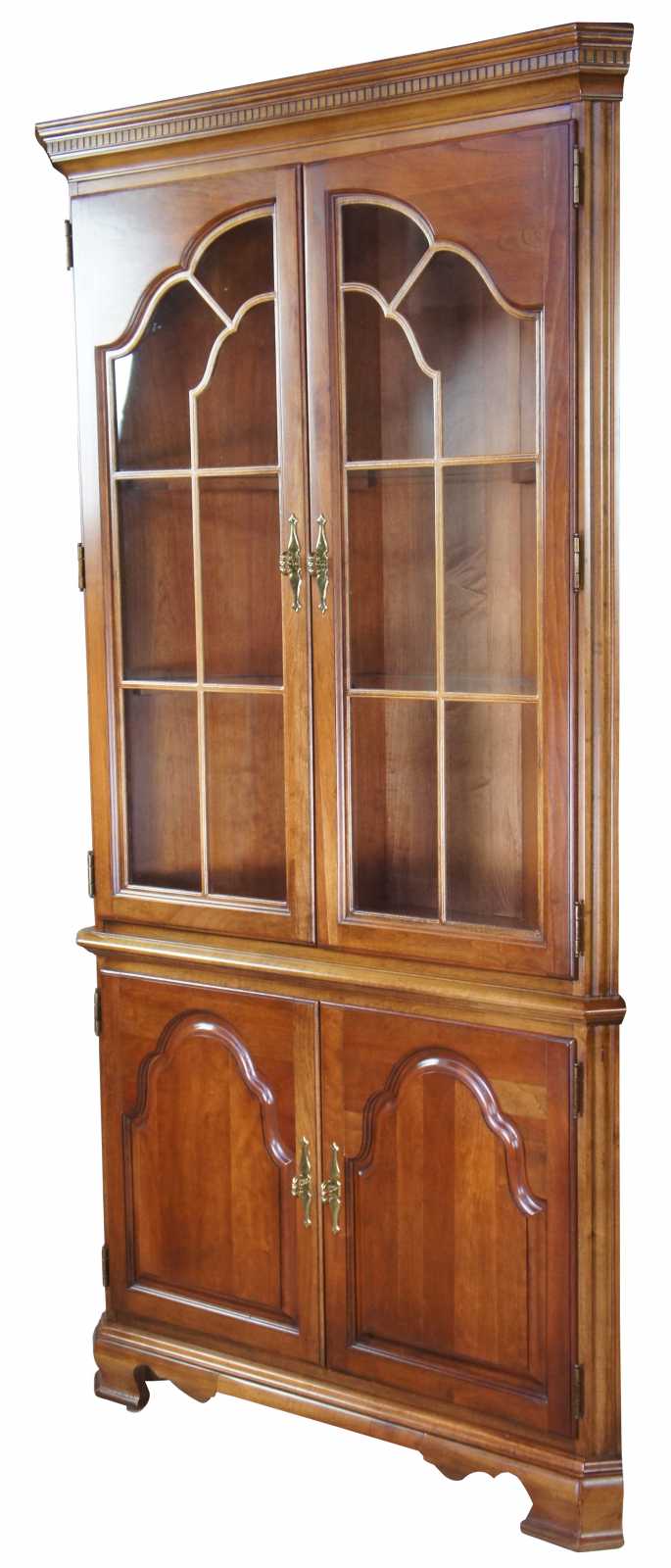 Stanley Furniture Chippendale or Queen Anne stlye corner cabinet. Made of cherry with paneled glass doors, interior glass shelves illuminated from above, and lower cabinet. Two Available.