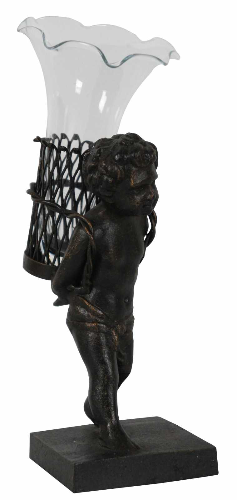Contemporary bronze figurine of a child walking with a basket containing a ruffled edge glass bud vase.